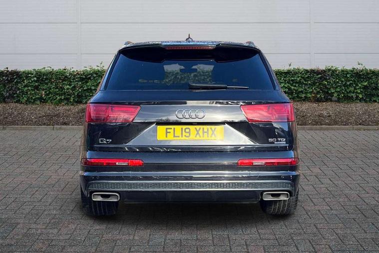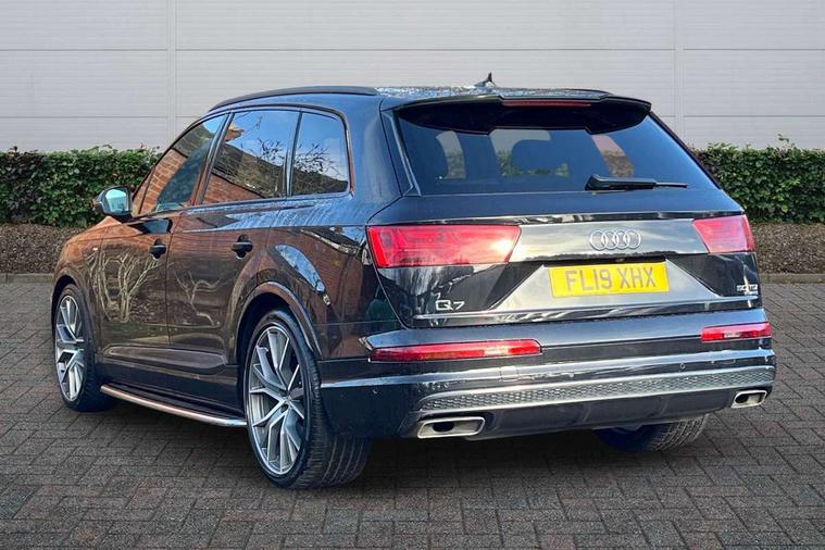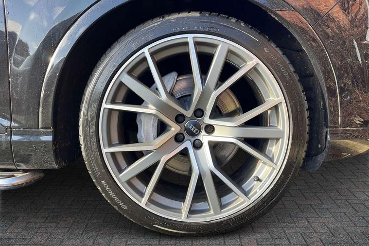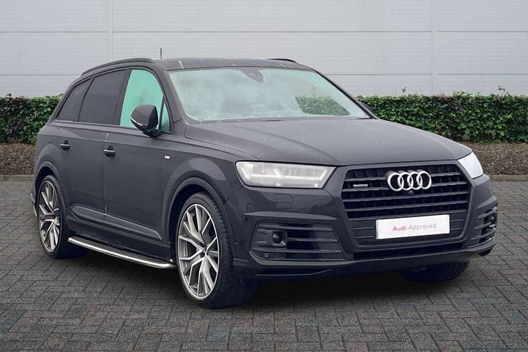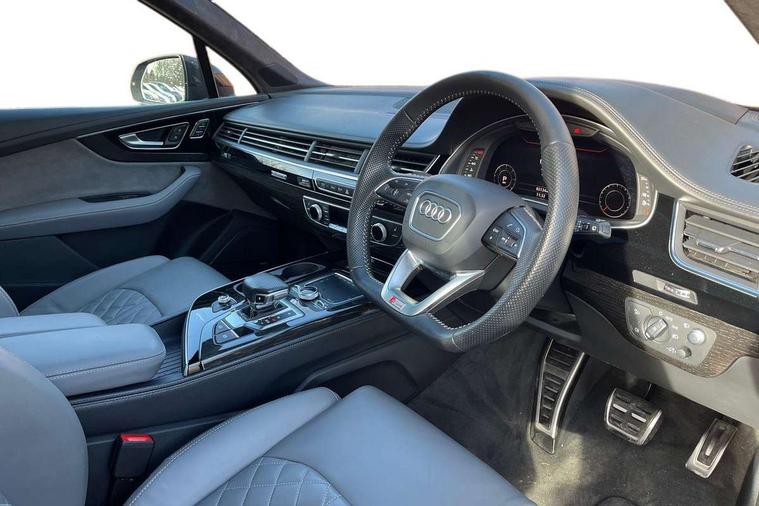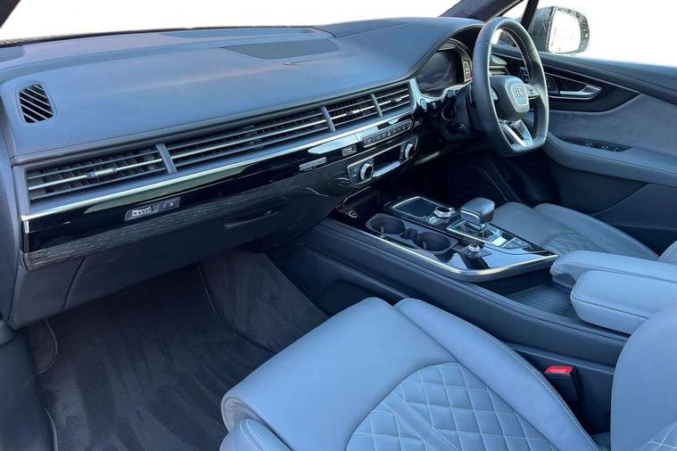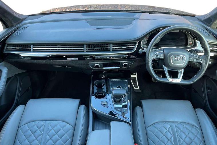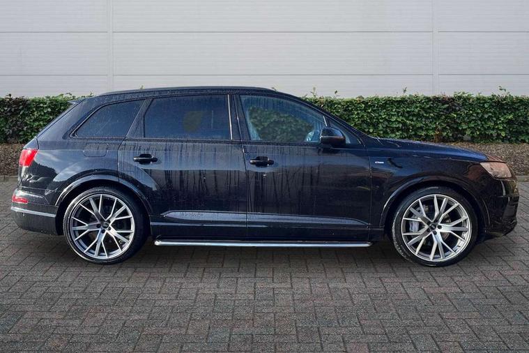 8.3" central fold-down colour display with high-resolution graphics, Audi connect safety and service (e-call), Audi drive select, Audi phone box with wireless charging, Audi smartphone interface, Audi virtual cockpit - 12.3" high-resolution LCD display with fully customisable instrument cluster, Colour driver's information system display, Head up Display, MMI - Multi Media Interface control system, MMI navigation plus with MMI touch, Mobile phone preparation with bluetooth interface, Power tailgate, Service interval indicator, Servotronic speed related PAS, Speed limiter, Start/Stop system with energy recuperation, Voice control system, Adaptive air sports suspension, 2 USB ports, 2x SD card slot, Audi music interface, Aux-in socket, DAB digital radio module, DVD System, MMI radio plus, Acoustic windscreen, Audi matrix LED headlights with LED rear lights + dynamic front and rear indicators, Auto dimming rear view mirror, Body coloured bumpers, Electric front+rear windows, Electric panoramic glass sunroof, Electric/heated/folding door mirrors with memory, Green tinted heat insulating glass, Headlight washers, High beam assist, LED daytime running lights, Loading sill protector in stainless steel, Platinum grey front lip spoiler, Privacy glass, Rain and light sensors, Rear wiper, Roof spoiler, Running boards, 2 cupholders in front centre console, 35/30/35 split fold 2nd row seats, Electric 3rd row 50/50 split/fold, Electric adjustable steering column, Electrically adjustable front driver and passenger seats with memory, Four zone electronic climate control, Front ashtray and cigar lighter, Front centre comfort armrest with storage + cupholders, Front head restraints, Gearshift paddles, Heated front and 2nd row seats, ISOFIX child seat mounting for 6 passenger seats with front passenger airbag deactivation includes top tether, Leather gear knob, Luggage compartment cover, Rear centre armrest with 2 cupholders, Rear headrests, Stainless steel pedals, Sunvisors with illuminated vanity mirrors, Twin sunvisors, Valcona leather upholstery + S sports seats plus, Extended LED interior multi coloured lighting pack - Q7, Full leather pack - Q7, Interior light pack - Q7, Parking pack - Q7, Tour Pack - Q7, 3 point seatbelts on all seats, ABS+Electronic Brake force Distribution, Curtain airbags, Driver and passenger airbags, EDL + ASR, Electrically operated child locks on rear doors, Electromechanical parking brake, Electronic stability control, Exit warning, Front side airbags, Hill descent control, Hill hold assist, Seatbelt warning, Traction control, Tyre pressure loss indicator, Warning triangle and first aid kit, Advanced key, Anti theft alarm, Anti-theft wheel bolts, Immobiliser, Keyless Go access/ignition system, Remote central locking, Chrome door inserts, Tool kit, Tyre repair kit,