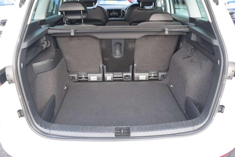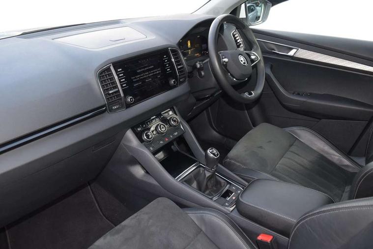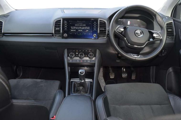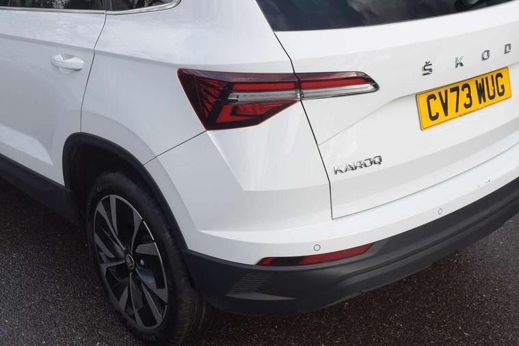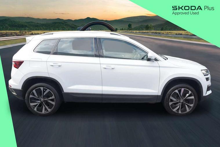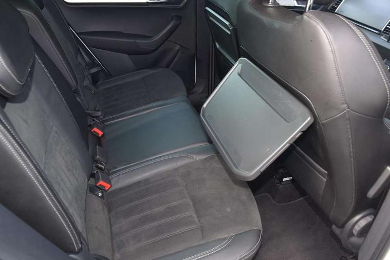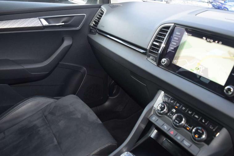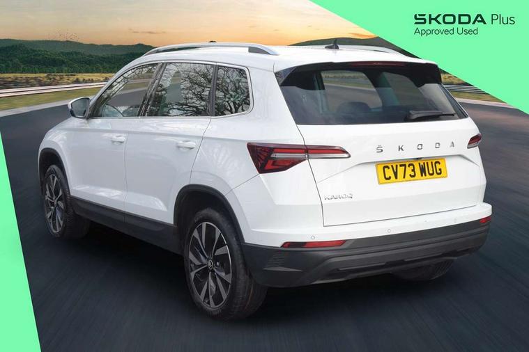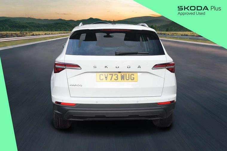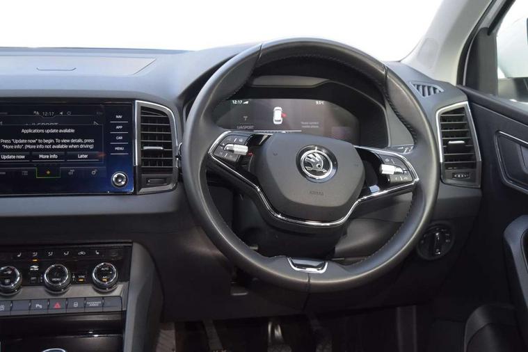 8" Digital display, Care connect, Driver fatigue sensor, Emergency services call system, Outside temperature gauge, Service interval indicator, SmartLink wireless for Apple and wired for Android, Start/stop system with regenerative braking, USB C Port x 2 in front centre console, 8 Speakers, DAB radio with Bluetooth, USB connection, Acoustic glass, Aero front windscreen wipers with intermittent function, Auto dimming rear view mirror with light and rain sensors, Black electric window control buttons, Body colour door mirrors and handles, Dynamic headlight range control with cornering light function, Electric front and rear windows with child proof lock, Heated rear windscreen, LED daytime running lights, LED rear lights with high functionality welcome effect and dynamic indicators, Light assistant (coming/leaving home/tunnel light), Plastic scuff plates, Privacy glass, Rear side wing doors, Rear spoiler, Rear window wiper with washer system and intermittent control, Safety reflectors on front doors, 1.5 litre bottle holders in driver and front passenger door panels, 12V socket in boot, 12v socket in front centre armrest with storage compartment and rear air vents, 2 spoke leather heated multifunction steering wheel, 2 x Tablet holder, 3 rear height adjustable headrests, 3 seat bench in 2nd row, 4 foldable roof handles with rear coat hooks, Black floor carpet, Chrome inner door handles, Double sided boot floor, Foldable hooks in the boot, Front head restraints, Height adjustable front three point seats belts with tensioners, Height/reach adjust steering wheel, Ice scraper, Illuminated glovebox, Illuminated luggage compartment, Isofix child seat preparation for front passenger seat, Isofix child seat preparation outer rear, Manual lumbar support for front seats, Pen holder, Pollen filter, Rear boot cover, Rear reading lights, Rubbish bin door, Safety vest holder, Single front passenger seat, Storage box in upper central dashboard closed, Sunvisors with illuminated vanity mirrors, Textile floor mats, Ticket holder, VarioFlex seats with standard rear seat release, Boot pack - Karoq, Design Pack - Karoq, Parking pack - Karoq, Automatic door unlocking in case of crash, Automatic fuel cut off in case of crash, Child locks on rear doors, Driver airbag, Electronic parking brake with auto hold function, Emergency rear braking signal, ESC including ABS, MSR, ASR, EDS, HBA, DSR, RBS, MKB and traction control, Front side airbags, Hill hold control, Knee airbags, Passenger airbag with switch-off function, Pedestrian monitor, Seatbelt reminder signalisation and pretensioner for all seats, Three point seatbelts rear, Two tone horn, Tyre pressure display, Tyre pressure monitor, Alarm with interior monitoring, back up horn and tilt sensor with safe function, Electronic engine immobiliser, Keyless entry and start/stop, Remote central locking with 2 remote folding keys, Chrome framed air vents, 18" Miran alloy wheels in black, Anti-theft wheel bolts protection, Tool kit,