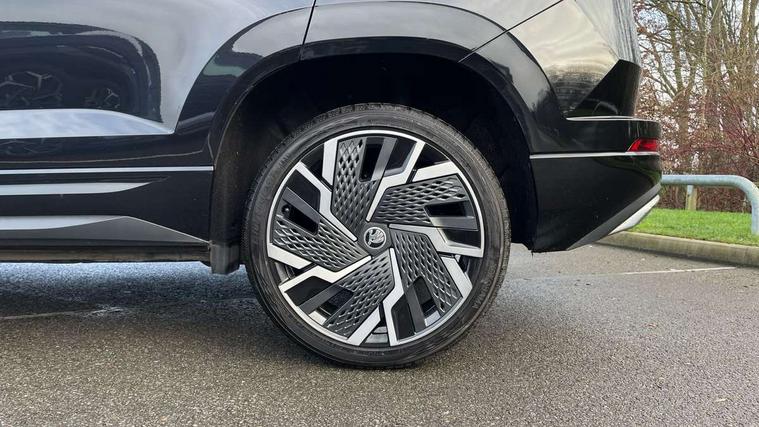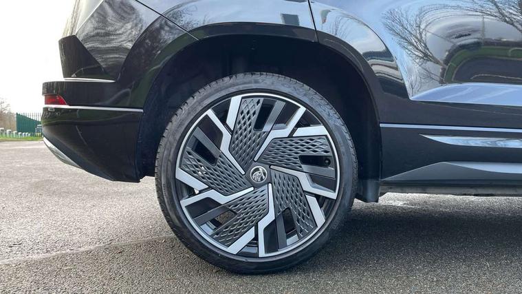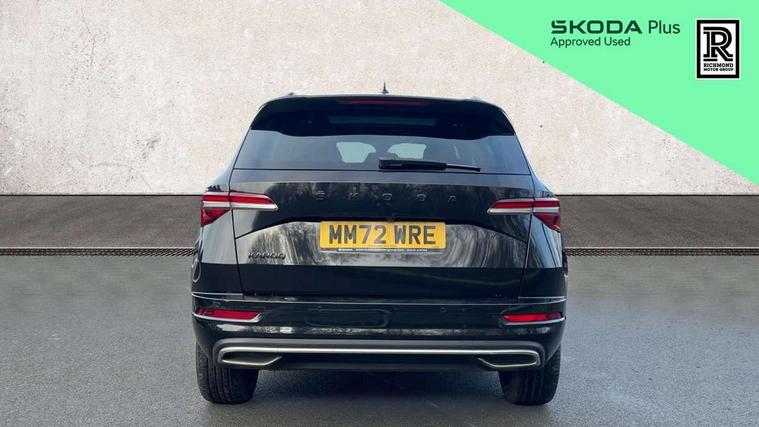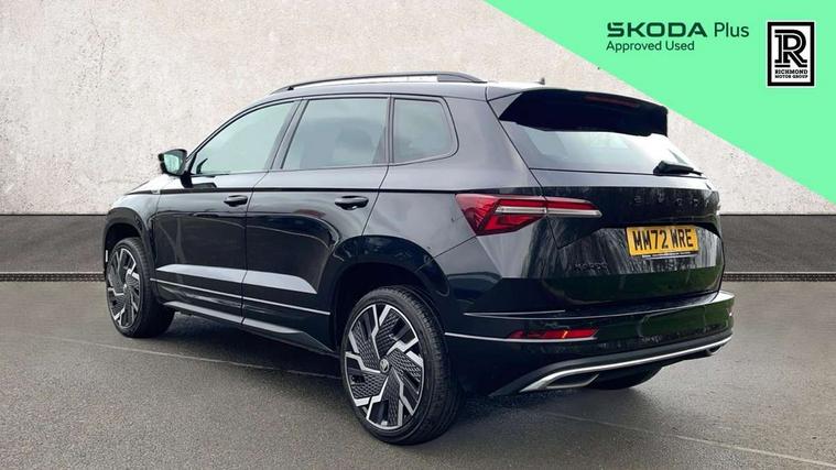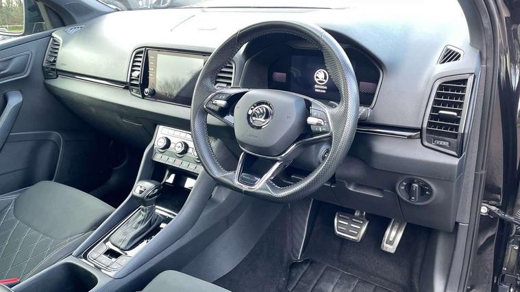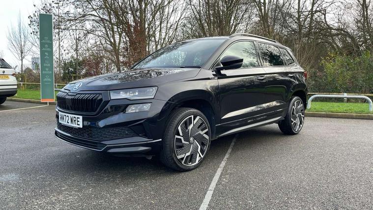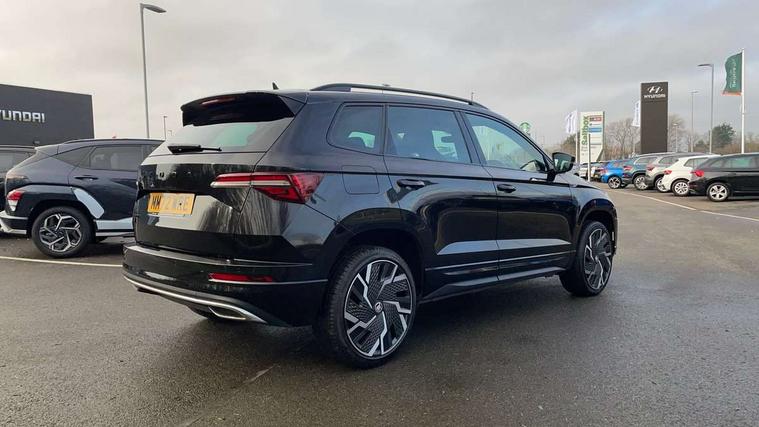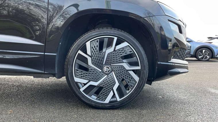 8" Digital display, Care connect, Driver fatigue sensor, Emergency services call system, Outside temperature gauge, Service interval indicator, SmartLink wireless for Apple and wired for Android, Start/stop system with regenerative braking, USB C Port x 2 in front centre console, Virtual pedal with electrically operated boot door, 8 Speakers, DAB radio with Bluetooth, USB connection, Acoustic glass, Aero front windscreen wipers with intermittent function, Auto dimming rear view mirror with light and rain sensors, Black door mirrors, Black electric window control buttons, Black radiator grille, Black roof rails, Body colour door handles, Dynamic headlight range control with cornering light function, Electric front and rear windows with child proof lock, Front door steps with SportLine logo, Heated rear windscreen, LED daytime running lights, LED rear lights with high functionality welcome effect and dynamic indicators, Light assistant (coming/leaving home/tunnel light), Panoramic sliding sunroof, Plastic scuff plates, Privacy glass, Protective door side sills in body colour, Rear diffuser, Rear side wing doors, Rear spoiler, Rear window wiper with washer system and intermittent control, Safety reflectors on front doors, Skoda lettering on tailgate in black, Sportline badge on front fender, Sportline decorative inserts with badging, Sports front and rear bumpers, 1.5 litre bottle holders in driver and front passenger door panels, 12V socket in boot, 12v socket in front centre armrest with storage compartment and rear air vents, 2 Folding hooks and nets in boot, 3 rear height adjustable headrests, 3 seat bench in 2nd row, 3 spoke leather sports multifunction steering wheel and silver stitching with gear shift paddles, 4 foldable roof handles with rear coat hooks, Black floor carpet, Black roof headlining, Chrome inner door handles, Double sided boot floor, Foldable hooks in the boot, Front head restraints, Height adjustable front three point seats belts with tensioners, Height/reach adjust steering wheel, Ice scraper, Illuminated glovebox, Illuminated luggage compartment, Isofix child seat preparation outer rear, Manual lumbar support for front seats, Pen holder, Pollen filter, Rear boot cover, Rear reading lights, Rear seats fixed folding and divided 60:40, Rubbish bin door, Safety vest holder, Single front passenger seat, Storage box in upper central dashboard closed, Sunvisors with illuminated vanity mirrors, Textile floor mats, Ticket holder, Titan black interior ceiling, Welcome animation with sportline logo, Light Pack - Karoq, Parking pack - Karoq, Automatic door unlocking in case of crash, Automatic fuel cut off in case of crash, Child locks on rear doors, Driver airbag, Electronic parking brake with auto hold function, Emergency rear braking signal, ESC including ABS, MSR, ASR, EDS, HBA, DSR, RBS, MKB and traction control, Front side airbags, Hill hold control, Knee airbags, Passenger airbag with switch-off function, Pedestrian monitor, Seatbelt reminder signalisation and pretensioner for all seats, Three point seatbelts rear, Two tone horn, Tyre pressure display, Tyre pressure monitor, Alarm with interior monitoring, back up horn and tilt sensor with safe function, Electronic engine immobiliser, Keyless entry and start/stop, Remote central locking with 2 remote folding keys, Black air vent surround, Black centre console, Satin black dashboard, Satin black door trim, 19" Sagitarius anthracite alloy wheels with matt black aero inserts, Anti-theft wheel bolts protection, Matt black aero hub caps, Storage on wheel cover, Tool kit,