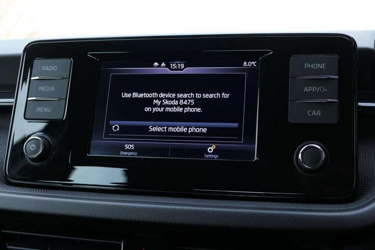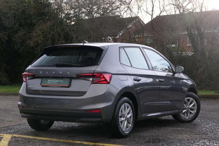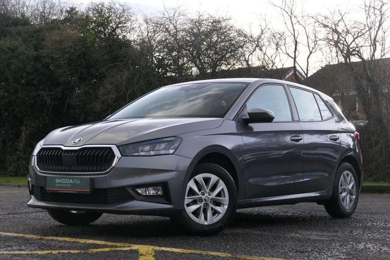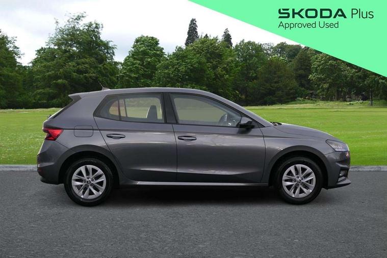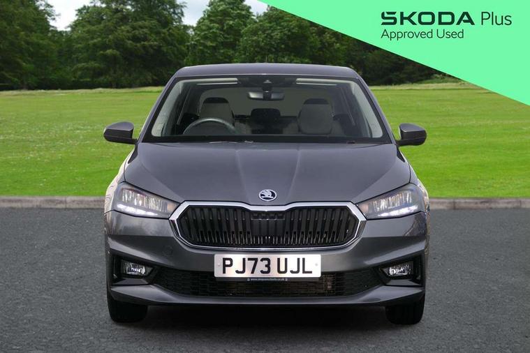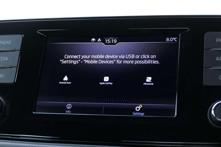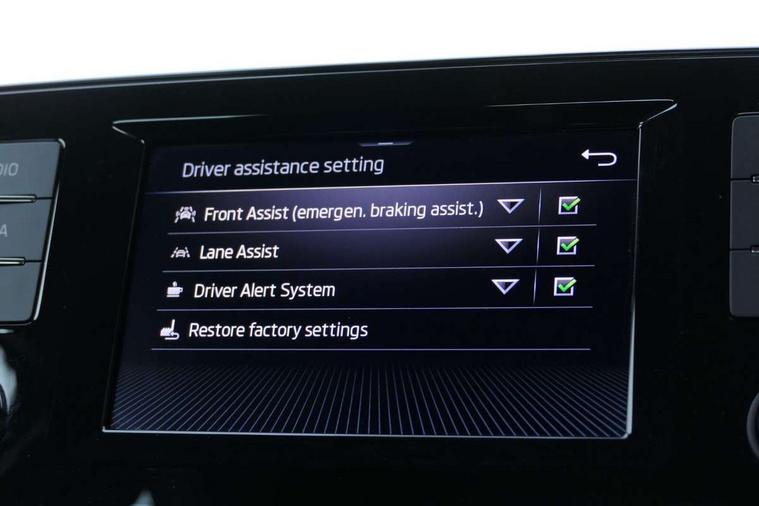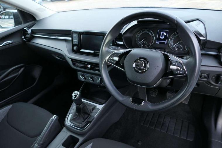 Bluetooth connection, Driver alert system - DAS, Electromechanical power steering, Exterior temperature gauge, Lane assist including road edge detection, Multifunction trip computer in black and white, Service interval indicator, Speed limiter, 2x USB-C in the front (for data transmission and charging), 4 speakers in front, Auxiliary socket for external MP3 player, DAB digital radio reception, Radio Swing with 6.5" colour display, Basic LED Headlights, Body colour door mirrors, Body coloured bumpers, Dimming rear view mirror with black frame, Door mirror integrated indicators, Electrically adjustable and heated door mirrors, Electrically adjustable front windows with function auto up/down, Front fog lights, Front window wiper intermittent control, Headlight range control - Automatic, Ice scraper in fuel cap, LED daytime running lights with coming and leaving home feature, Mechanical adjustable rear windows, Rain sensor, Rear LED fog light, Rear side wing doors, Rear window wiper with washing nozzles, Roof mounted spoiler, SKODA tailgate lettering in chrome, Third brake light, 2 reading lights in front and 2 reading lights in rear, 2 spoke leather multifunction steering wheel, 3 rear headrests, Backrest split and folding, Central console with fixed cup holder and storage box, Chrome handbrake release button, Fabric upholstery, Gearshift knob/handle in leather, Grain satin black interior door handles, Hand brake lever handle in leather, Height adjustable front headrests, Height adjustable front seats, Height adjustable steering wheel, ISOFIX and TopTether anchorage points to the outer rear seats, ISOFIX and TopTether on the front passenger seat, Luggage compartment lighting, Manual air conditioning, Manually adjustable lumbar support in front seats, Pollen filter, Rear seat bench unsplit, Single front passenger seat, Storm grey headlining, Sun visors with mirror and airbag label on passenger side, Ticket holder, 3-point height adjustable front seats belts with pretensioner and force limiter, Automatic warning lights in case of crash, Driver and passengers airbag with switch off function, e-Call+, ESC including ABS, MSR, ASR, EDS, HBA and XDS, Front and rear seat belt warning, FRONT ASSIST (AEB City and AEB Inter Urban), Front side airbags, Head airbags, One tone horn, Pedestrian protection, Three rear 3-points safety seat belts with pretensioner and force limiter including stop function for outer rear seat belts, Tyre pressure monitoring system, Anti-theft alarm system including immobiliser, interior monitoring, backup horn, and towing protection, Central locking with radio remote control, interior controls, SAFE function and 2 foldable keys, Black painted air vents, Glossy black decorative trim, Grain satin black central console cover, Grain satin black lower decorative trim, Satin black door and side trim panel in front, Anti-theft wheel bolts protection, Super-low rolling resistance tyres,