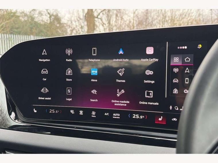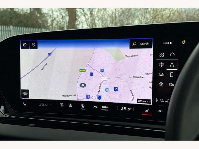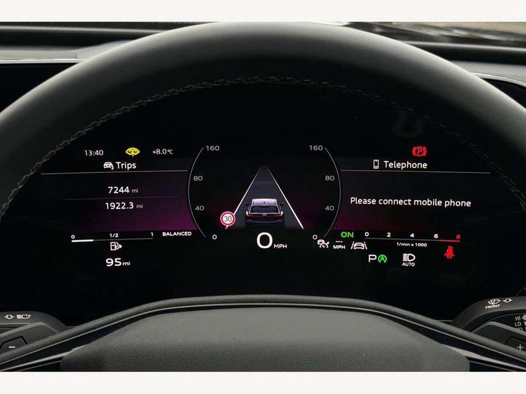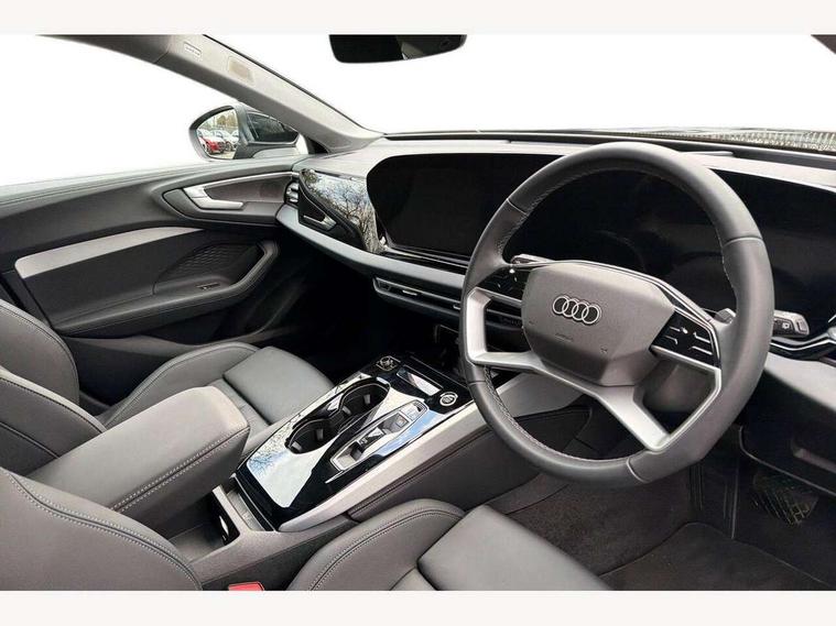 Adaptive cruise control, Advanced driver attention and fatigue montior, Audi application store, Audi assistant, Audi connect emergency call and service, Audi drive select, Audi virtual cockpit plus with 11.9" OLED colour display, Automatic start/stop system with coasting functionality, Camera based traffic sign recognition, Intersection assist, Lane departure warning, MMI navigation plus with high resolution 14.5" OLED touchscreen colour display, Park assist plus, Parking system plus with 360 display, Progressive steering with servotronic, Rear view camera, Smartphone interface, Swerve assist and turn assist, Traffic sign based speed limiter, Comfort suspension, 2 USB-C ports in both the front and rear, Audi sound system impressive sound with 8 loudspeakers including centre speaker and subwoofer, 6-channel amplifier with a total output of 180 watts, DAB digital radio reception, Smartphone compartment with wireless charging, Aluminium roof rails, Aluminium window trims, Auto dimming rear view mirror, Body colour door mirrors, Door mirrors - electrically adjustable, heated, folding and auto dimming on both sides, Front and rear electric windows, Front door sill trims with aluminium inlays, illuminated, High beam assist, LED headlights Plus incl. digital daytime running lights, turning light, all-weather light, motorway light, manouevring light and intersection light, LED rear lights pro incl. dynamic rear indicators and illuminated light strip with animated coming and leaving home function, LED third brake light, Rear and side windows with heat insulating glass, Rear side wing doors, Rear wash/wipe, Sport bumpers, radiator grille and diffuser in scandium grey and diffuser insert in matt selenite silver, White rhombus logo projection light in exterior mirrors, Windscreen with acoustic glazing, 3 rear headrests, 3 seat rear bench, 3-zone automatic climate control, 40:20:40 split folding rear seat bench with centre armrest and cup holders, Comfort front centre armrest, Front and rear floor mats, Front seats with manual adjustment for position and 4-way electric lumbar support, Front sport seats with integrated head restraints, Heated front seats, i-Size child seat mounting on the front passenger side and outer rear seats, i-Size and top tether on the outer rear seats, Luggage compartment lid, electrically opening and closing, Manual steering column height and depth adjustment, Rock grey cloth headlining, Single front passenger seat, Twin leather upholstery, Twin spoke leather steering wheel with multi-function buttons with touch control, shift paddles and trim in chrome look, Ambient lighting package plus - A5, 3x3 point rear seat belts, Driver airbag, Electric child safety locks, First aid kit with warning triangle and vests, Front emergency brake assist, Front passenger airbag, Front passenger airbag deactivation, Front side airbags with head airbag system and front interaction airbag, Hill hold assist, Seat belt monitoring with rear seat occupant reminder, Tyre pressure loss indicator, Anti theft alarm, Anti-theft wheel bolts, Keyless Go, Accent surfaces and control buttons in gloss black, Black dashboard with contrast stitching, Inlays in matt brushed aluminium, silver, Softwrap in leatherette with contrast stitching, Upper and lower interior elements in leatherette, Tyre repair kit,