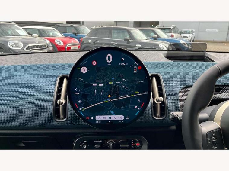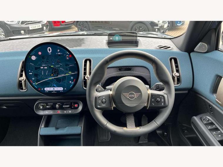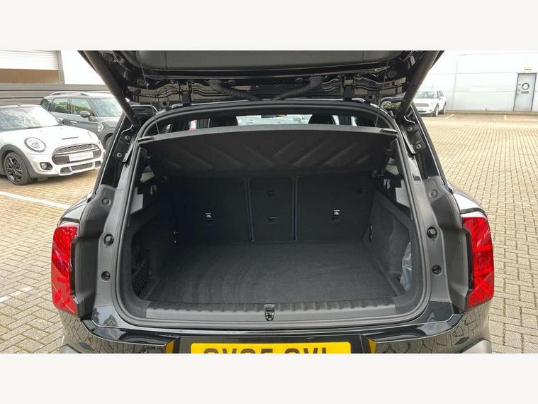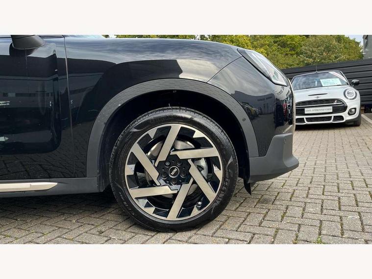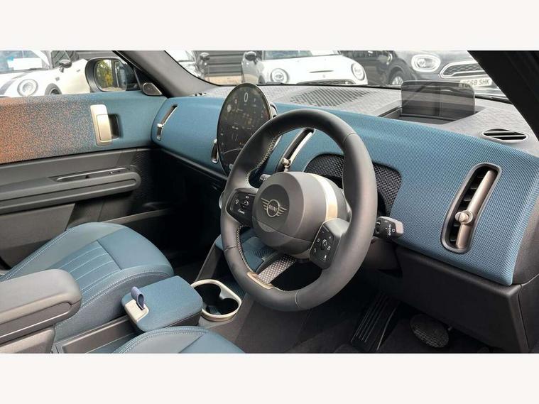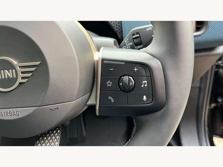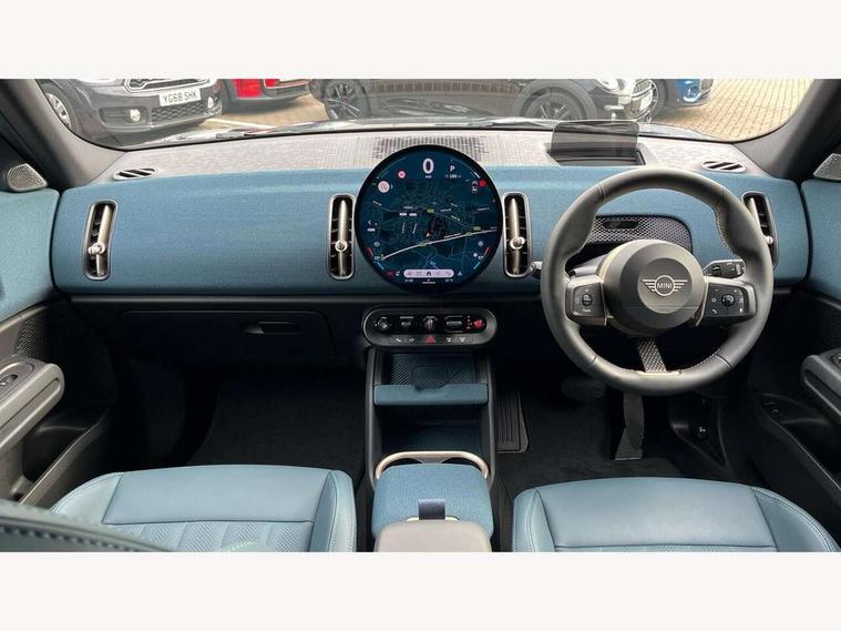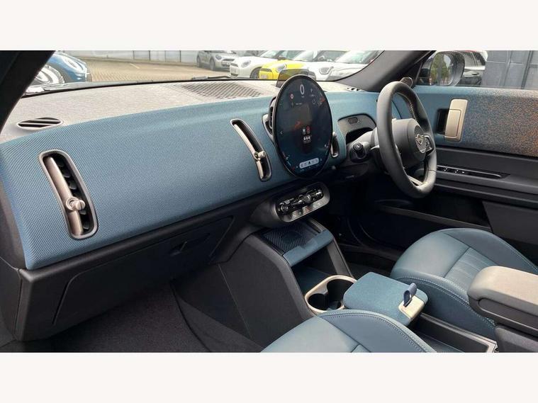 Bluetooth connection, Circular OLED Screen, Compatible mobile phone bluetooth with audio streaming, Cruise Control (DCC), Digital dashboard display, Driving assistant, E-call, Electro-mechanical speed dependant steering assistance, MINI Experience Modes, Mini navigation system, MINI TeleServices, Parking assistant in camera and ultrasound based assistance system, rear view camera, parking aid and distance control, Auto transmission with Paddles, Larger capacity fuel tank, 6 speakers, DAB Digital radio, Personal eSim, Auto tailgate, Electric adjustable heated door mirrors, Front and rear electric windows, Heated rear window, LED daytime running lights, LED Headlights, LED rear lights, LED third brake light, Logos in Vibrant Silver, Rain sensor with auto headlights, Rear side wing doors, Rear window wiper, Roof rails, Vibrant Silver Grill Surround, 3 seat bench in 2nd row, 60/40 split rear bench seat, Anthracite headliner, Auto air conditioning, Floor mats, Front armrest, Front headrests, Front sport seats, Heated steering wheel, Height and length steering column adjustment, Lidded storage box in Petrol knit, Rear headrests, Single front passenger seat, Sport Vescin Steering Wheel, Sunvisors with vanity mirrors, Vescin synthetic leather upholstery, Vibrant Silver sill inlay, 3x3 point rear seat belts, 6 Airbags - front, side, head and seat belt tensioners, ABS, DSC - Dynamic Stability Control, Electronic handbrake, Electronic Stability Programme (ESP), Front ISOFIX (iSize), Hill hold assist, Hill start assist, Manual rear child locks, Traction control, Tyre pressure monitoring system, Warning triangle, Alarm system with tilt sensor, monitoring doors, bonnet interior and tailgate, Auto drive away locking, Deadlocking function, Electronic vehicle immobiliser, Locking wheel bolts, Remote control locking, Start/stop toggle with keyless go, Petrol/Brown dashboard knit, MINI Mobility Kit,
