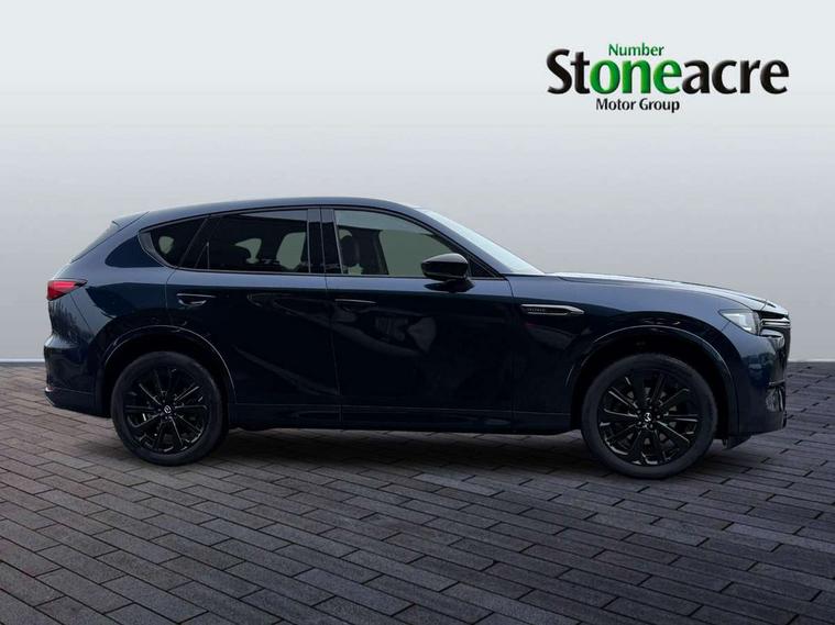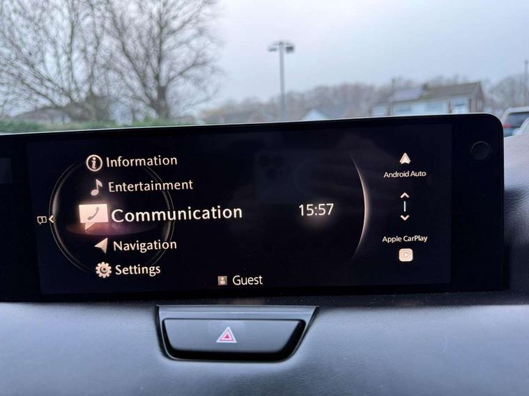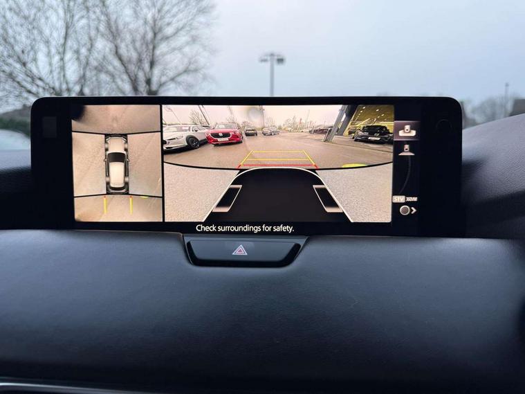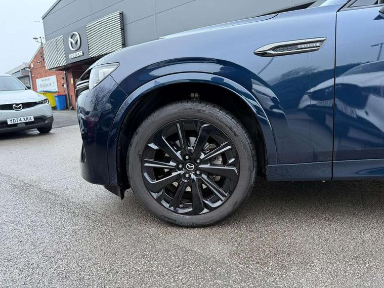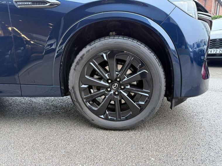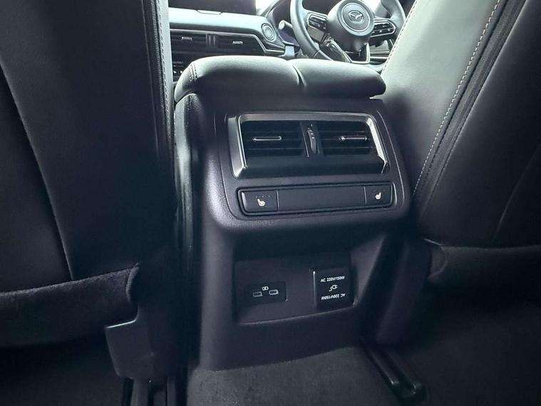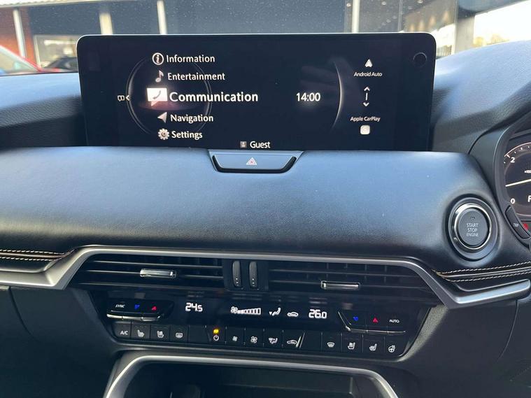 Low washer fluid warning light, 12.3" Colour entertainment centre display with mazda connect infotainment, 12.3" TFT Colour display, Adjustable speed limiter, Blind spot assist, Blind spot monitoring with rear cross traffic alert, Distance alert system, Driver attention alert system, Driver Monitoring with personal identification, E-call with GPS, Emergency lane keeping with blind spot assist, Emergency stop signalling system, Exit warning function, Front and rear parking sensors, Ingress / Egress support and automatic driver position guide, Integrated bluetooth, Intelligent speed assist, Kinematic posture control, Lane keep assist system (LAS) with Lane departure warning system (LDWS), Mazda Driver Personalisation System, Mazda hybrid navigation system with european mapping, Multimedia Commander, PAS, Power lift gate with handsfree function, Power start/stop button, Speed alert, Traffic sign recognition enhanced with mandated excessive speed warning, Trip computer, Windscreen projected colour active driving display, Wireless apple car play/android Auto, Internal Combustion Engine Sound Emulator, Mi-Drive (Normal, Sport, Off-road, Towing and EV mode), Paddle shift, AM/FM and DAB radio, Bose surround sound system with 12 Speaker, Bose center point, Bass match and audio pilot technology, Steering wheel mounted audio/bluetooth controls, USB-C inputs (x2 front and x2 rear), Auto dimming driver's door mirror, Automatic headlight levelling, B-pillar and C-pillar garnishes in gloss black finish, Body colour roof spoiler, Body coloured bumpers, Body coloured lower bumper, wheel arch and side mouldings, Coming/leaving home lighting function, Dark plated headlight lense, Dark plating finish signature wing in front grille, Dark plating front side garnish, Differentiated front bumper design to accentuate the intake, Dusk sensing headlights, Electric front/rear windows with one touch auto up/down, Electric panoramic sunroof, Electrically adjustable, heated auto power folding door mirrors with memory, Frameless auto dimming interior rear view mirror, Front kodo turn signal, Front wiper de-icer, Gloss black door mirrors, Headlight washers, High beam control, Honeycomb radiator grille in piano black, LED 3rd brake light, LED rear signature combination lamps, Rain sensing front wipers with adjustable sensitivity and speed, Rear side wing doors, Rear wiper, Roof pillars and roof lining finished in lighter colour to soften the overall look, Signature LED daytime running lights, Silver decoration panel, 12v power outlet - front, 12V socket in boot, 3 height adjustable rear headrests, 3 seat bench in 2nd row, 40/20/40 split folding rear seats with quick levers in the boot, Ambient lighting, Cargo net, Chrome interior trim accents with steering wheel centre bezel, surround of engine start / stop button and glove box handle, Door panel trim vinyl leather with armrest, Driver and front passenger two rear grab handles with rear coat hooks, Driver and front passenger visors with covered vanity mirror and driver ticket holder, Driver seat electric tilt, slide, recline, height and lumbar adjustment, Driver, front passenger and two rear door pockets, Driver/passenger front seatback pockets, Dual zone climate control air conditioning with rear air vents, Electric telescopic and tilt adjustment steering wheel, Featuring black vinyl leather dashboard trim with titanium coloured accents, Folding rear centre armrest with two cup holders, Front centre storage with two cupholders, Front down lamp with front and rear foot lamps, Front headrests, Front passengers seat electric slide, recline, height and lumbar adjustment, Front seat ventilation with 3-stage setting, Glovebox illumination, Heated front seats with 3 stage setting, Heated leather wrapped steering wheel, Heated outer rear seats with 3-stage setting, ISOFIX child seat anchorage points attached on outer rear seats, Karakuri tonneau cover, Leather wrapped gear shift knob, LED illumination luggage compartment, Nappa leather upholstery, Practical and spacious front centre armrest storage, Rear seat recline function for rear passenger comfort, Remote fold down rear seats, Remote pre-heating/cooling, Roof lining (ceiling and pillars) - Black, Roof mounted sunglasses holder, Single front passenger seat, Convenience Pack - CX-60, Driver Assistance Package - CX-60, 3 point ELR front seat belts x2 with pretensioners, 3 point ELR rear seat belts, Active bonnet, Anti-lock braking system (ABS), Drivers knee airbag, DSC - Dynamic Stability Control, Electronic parking brake with auto disengage function and auto hold function, Front and rear curtain airbags, Front dual stage driver and single stage front passenger airbags, Front passenger airbag cut-off switch, Front side airbags, Front smart city brake support, Hill decent control, Hill launch assist, Manual rear child locks, Seatbelt reminder for driver/front passenger and rear seats, Traction control, Tyre pressure monitoring system (TPMS), Remote central locking with deadlocking and automatic door lock when driving, Smart keyless entry, Thatcham accredited alarm and immobiliser, Mesh metal film centre console panel, 20" Black metallic alloy wheels, Emergency tyre repair kit,