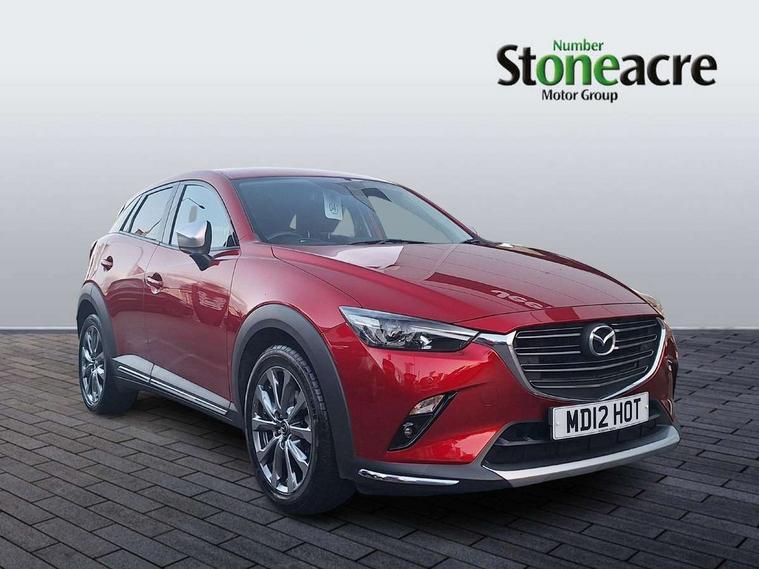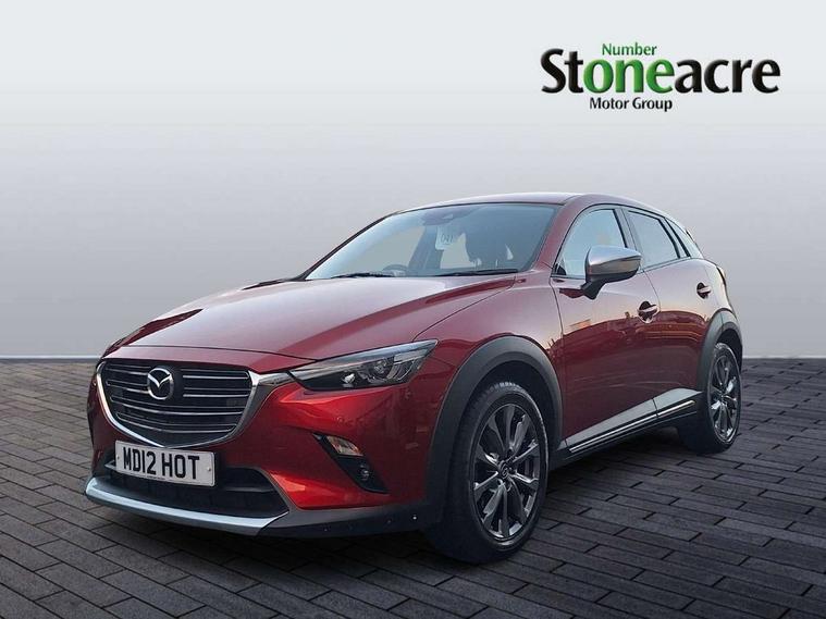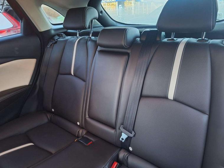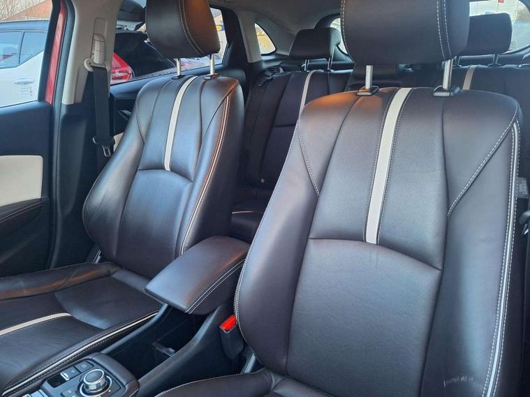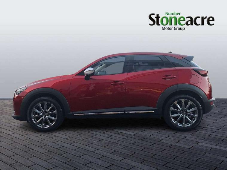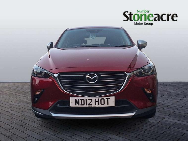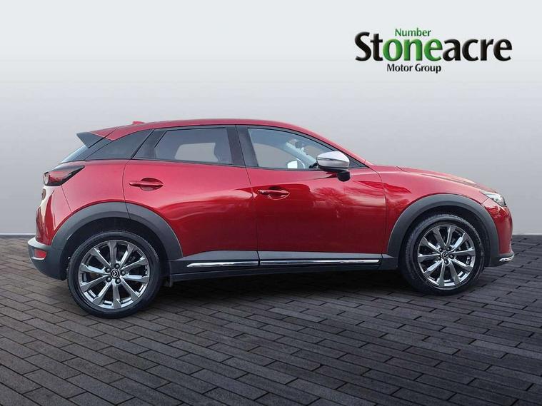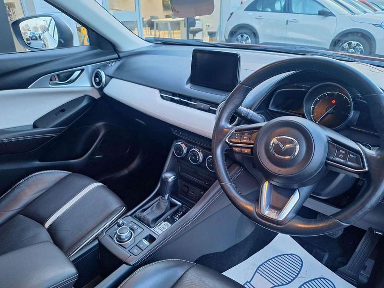7" touchscreen with multimedia commander and Aha and Stitcher app, Colour active driving display, Colour head up display, Cruise control + speed limiter, Digital speedometer, Drive mode selector, Electric power steering, Emergency stop signalling system, Engine start/stop button, Front and rear parking sensor with audible and visual warning, Internet access with app integration, Lane departure warning system, Navigation system, Reversing camera, Service interval indicator, Traffic sign recognition, Trip computer, i-stop, 2 USB/aux input socket, Bluetooth audio streaming, Bose Premium Audio system with 7 speakers, AM/FM, DAB radio and single CD/MP3, Steering wheel mounted audio controls, Adaptive front lighting system, Auto dimming rear view mirror, Automatic headlamp levelling, Body colour door handles, Bright silver door mirrors, Brilliant black roof spoiler, Coming/leaving home lighting function, Dual chrome exhaust, Dusk sensitive headlamps, Electric front/rear windows with one touch, Electrically adjustable/heated/auto power folding door mirrors with integrated indicators, Front bumper chrome garnish, Front grille, LED daytime running lights, LED front fog lights, LED Headlights, LED indicator lights, LED rear signature combination lamps, Matte silver front and rear bumpers under garnish, Rain sensing front wipers with adjustable speed and intermittent wipe, Rear privacy glass, Rear wiper, Shark fin antenna, 12V power outlet, 60/40 split folding rear seat, Black front knee pads with soft stitching, Chrome door sill trims, Climate control air conditioning, CX-3 branded floor mats, Driver/passenger sunvisors + vanity mirrors (drivers side with ticket holder), Electric driver's seat with memory, Flexible cargo board, Front and rear door pockets, Front centre armrest with 2 cupholders, Gearshift paddles, Grab handles front x 2, rear x 2 with integrated coat hooks, Heated front seats, Heated steering wheel, Height adjustable front/rear head restraints, Inner chrome door handle and surround, Interior courtesy light, Isofix system on outer rear seats, Leather gear knob with silver insert, Leather steering wheel, Luggage compartment lighting, Nappa leather upholstery with driver power and memory seat, Passenger glovebox, Passenger seat back pocket, Passenger seat height adjuster, Rear centre armrest with 2 cupholders, Tilt/telescopic adjustable steering wheel, Tonneau cover, Variable boot floor, White soft touch door panel inserts and dashboard panel, 3 rear 3 point seatbelts + pretensioners, ABS/EBD, Advanced Smart City Brake Support - SCBS, Driver/Front Passenger airbags, DSTC-Dynamic Stability and Traction Control, Electronic parking brake, Emergency brake assist, Front and rear curtain airbags, Front side airbags, G-Vectoring control, Height adjustable front 3 point seatbelts + pretensioners, Hill hold assist, Hill launch assist, Passenger airbag deactivate switch, Seatbelt reminder front and rear, Tyre pressure monitoring system, Remote central locking + deadlocks, Smart keyless entry, Thatcham category 1 alarm + immobiliser, 18" Silver alloy wheels, Tyre repair kit,