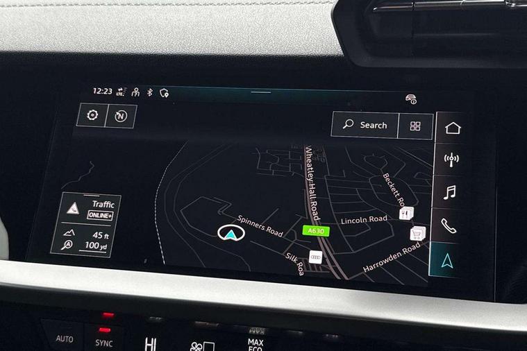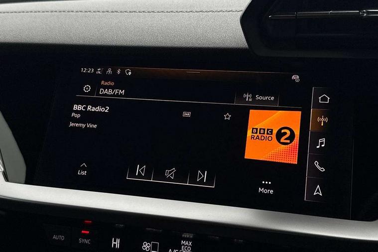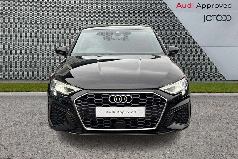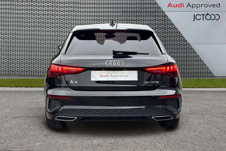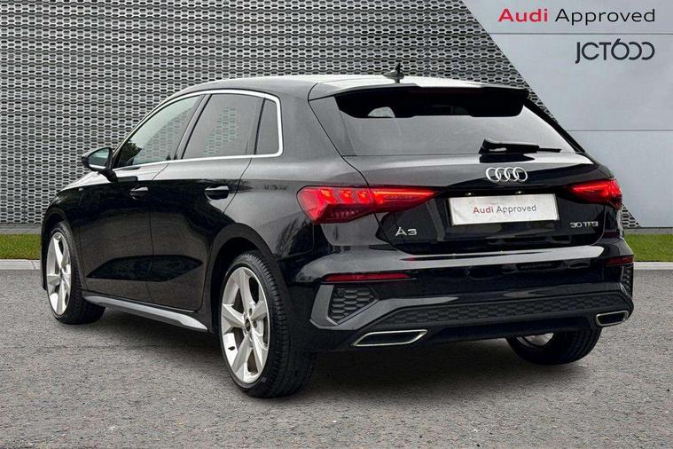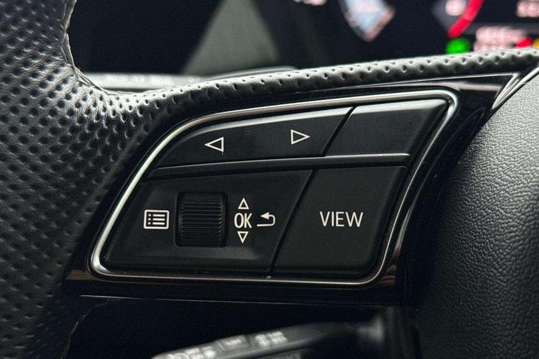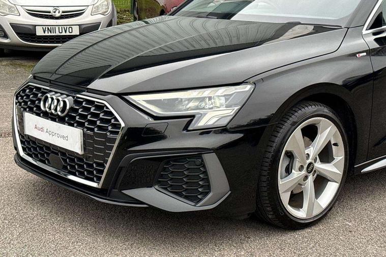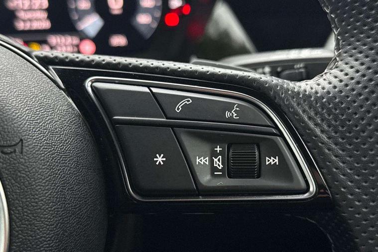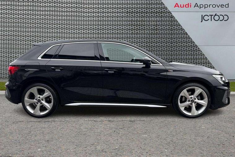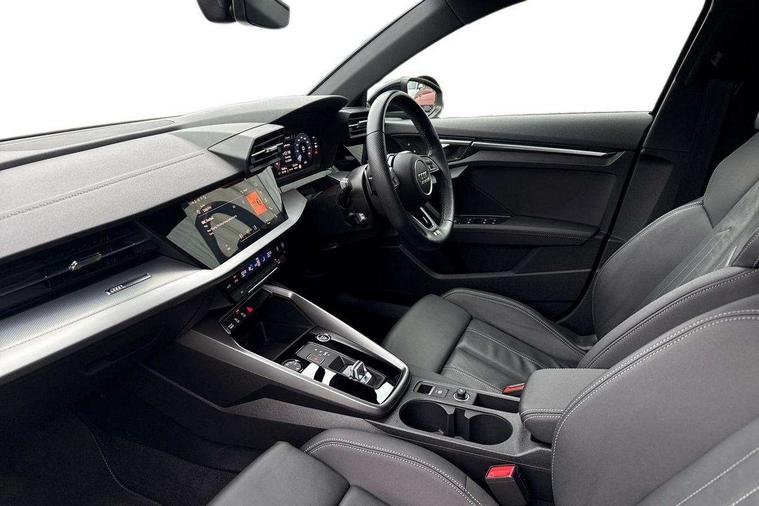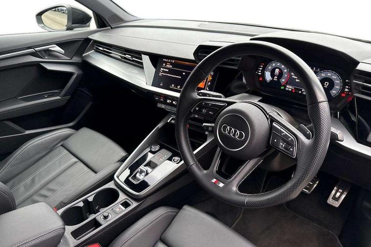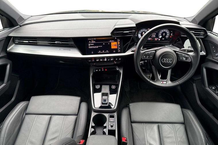 Audi drive select (Auto, Comfort, Dynamic and Individual), Audi smartphone interface, Audi Virtual Cockpit - 10.25" digital and colour instrument cluster, Automatic start/stop system with recuperation, Bluetooth interface, Camera based traffic sign recognition, Collision avoidance assistant, e-Call (emergency call), Electromechanical power speed sensitive steering, Lane departure warning system, MMI Navigation Plus with high resolution 10.1" colour touch screen display, Service indicator, Trip computer, Voice control system with natural language interaction, Sports suspension, 2xUSB-C connection with data and charging functions, 6 passive loudspeakers, DAB Digital radio, 3rd brake light, Acoustic glass windscreen, Aluminium window trim, Auto dimming frameless rear view mirror, Body colour exterior mirrors, Electrically adjustable/heated/folding/dimming door mirrors with kerb view includes integrated LED indications + kerb view function for passenger side, Front electric windows, Illuminated door sills with aluminium inserts at the front with S logo, LED daytime running lights, LED headlights with LED rear lights and dynamic rear indicators, Light and rain sensors, Privacy glass - dark tinted rear window, rear door and side windows, Rear electric windows, Rear side air outlets in grained matt black, Rear side wing doors, Rear wiper, S line bumpers, S roof spoiler, 12V socket and storage compartment in front centre console, 3 seat bench in 2nd row, 3 spoke leather multifunction steering wheel with paddle shift, 4 way electrically adjustable lumbar support for driver and front passenger, 60/40 split folding rear seat bench, Black cloth headlining, Dual zone electronic climate control, Front and rear centre armrest in artificial leather, Front and rear headrests, Front/rear floor mats, Height and reach adjustable steering wheel, Interior lighting - glove compartment light and right hand side, Luggage compartment floor covering, Manual boot compartment lid, Manually adjustable front seats, Seat side bolsters, Single front passenger seat, Stainless steel pedals and front footrest in black, Twin leather upholstery with front sports seats S embossed logo, Aluminium interior elements pack - A3 Sportback, LED interior lighting pack - A3 Sportback, S line styling pack - A3 Sportback, 3x3 point rear seat belts, Driver and front passenger airbag with passenger airbag deactivation, Electronic Stabilisation Control (ESC) including ABS, ASR and EDL, First aid kit with warning triangle and 2 safety vests, Front side airbags with head airbags and interaction airbag, Pre-sense front with pedestrian and cyclist detection, Seatbelt monitoring, Tyre pressure loss indicator, Anti theft alarm, Anti-theft wheel bolts, Electronically operated child locks, Immobiliser, Remote control central locking, Dark spectrum aluminium inlays, accent surfaces in the dashboard and centre console in platinum grey silk effect paint finish,