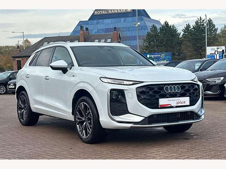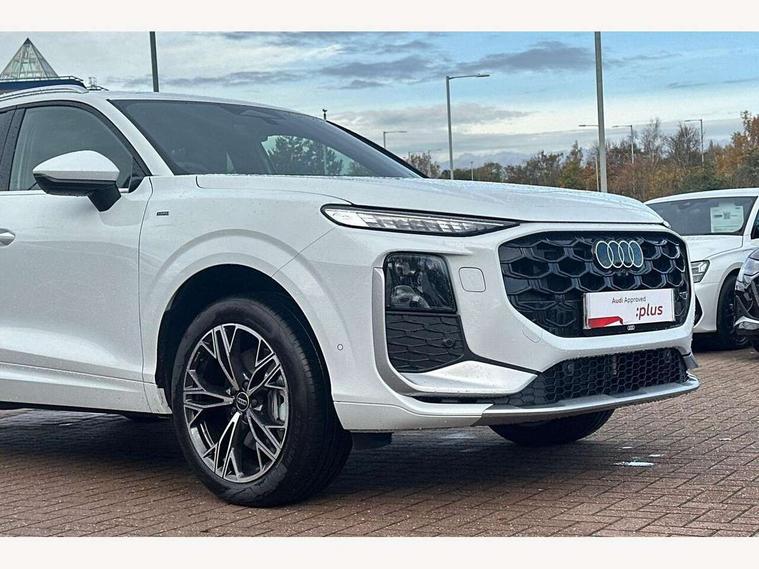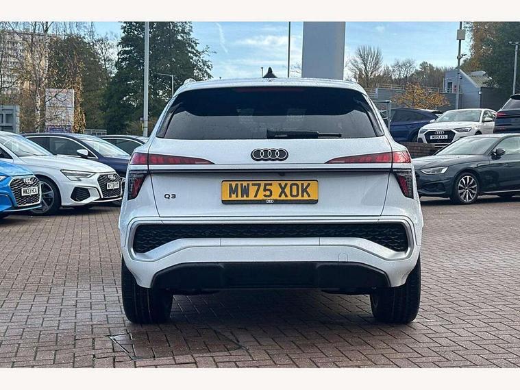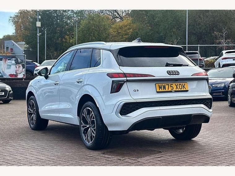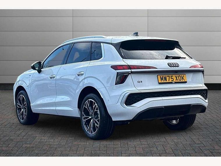 Adaptive cruise control, Audi connect emergency call and service, Audi connect remote and controls, Audi drive select (Balanced/Individual, effeciency, comfort and dynamic), Audi virtual cockpit plus - 11.9" display, Bluetooth interface, Camera based traffic sign recognition, Driver attention and fatigue monitor with driver monitoring, Front cross traffic assist, Lane departure warning with emergency assist, Panoramic curved display with 12.8" MMI navigation plus and MMI touch, Park assist plus with parking system and 360 display, Phonebox light with wireless charging, Reversing camera, Smartphone interface includes wireless Apple carplay/Android Auto, Start/stop system, Swerve assist and turn assist, Traffic sign based speed limiter, Voice control system with natural language interaction, 3 pin 10 amp domestic charging cable, Charging socket CCS type 2, Comfort suspension, Compact charging system, Industrial connector CEE 32A, 230V, Mode 3 charging cable for public charging, 22 KW (AC), Petrol Particulate Filter, 2 USB-C ports with charge and data functions, Audi sound system with 10 loudspeakers, subwoofer, 8 channel amplifier with 260 watts, DAB digital radio module, Acoustic glass for front door windows, Acoustic windscreen, Aluminium roof rails, Aluminium window trim, Audi Q3 lettering on the B-pillars, Auto dimming door mirrors, Auto dimming rear view mirror, Body colour door mirrors, Contrasting finish in volcano grey, Electrically folding, adjustable and heated door mirrors with integrated LED side indicators and kerb view function for passenger side, Full paint finish, Illuminated door sills with aluminium inserts at the front with S logo, LED daytime running lights, LED headlights plus with LED rear lights pro with continous light strip, illuminated Audi rings, rear, LED third brake light, Loading sill protector in stainless steel, Main beam assist, Privacy glass - dark tinted rear window, rear door and side windows, Projection light in the exterior mirrors - Projects a graphic element onto the ground, Q3 badging on the rear, Rain and light sensors, Rear side wing doors, Rear window, rear door windows and rear side windows in clear glass, Rear wiper, Sports bumpers, 3 seat bench in 2nd row, 3 spoke flat top and bottomed leather multi function sport steering wheel with gear shift paddles and "S" badging, 3-zone deluxe automatic air conditioning, 4 way lumbar support for the front seats - electric with horizontal and vertical adjustment in four directions, Black cloth headlining, Convenience auxiliary air conditioning, Front and rear floor mats, Front and rear headrests, Front centre armrest, Heated front seats, Height and reach adjustable steering wheel, Interior storage compartment, Leather/artificial leather upholstery combination with S emblem + front sports seats, Luggage compartment lid, electrically opening and closing, Manual front seats with height adjustment, Rear seat bench plus with split folded 40:20:40, Single front passenger seat, Stainless steel pedals, Steering wheel operating unit, gloss black, Storage compartment in front centre console, Ambient lighting package pro - Q3, S line exterior styling pack - Q3, 3x3 point rear seatbelts, Acoustic vehicle alerting system, Convenience key with safelock, Driver and front passenger airbag with passenger airbag deactivation, Electromechanical parking brake, Electronic stabilisation control including ABS, ASR and EDL, First aid kit with warning triangle and high visibility vests, Front emergency brake assist, Hill hold assist, i - Size child seat mounting on the front passenger side and i - Size and top tether on the outer rear seats, Power operated child locks, Seatbelt monitoring, Three point automatic belts with belt tensioner and height adjustment, Tyre pressure loss indicator, Anti theft wheel bolts, Remote central locking, Thatcham approved category 1 anti theft alarm, Dark aluminium divergence inlay, Interior elements in dinamica microfibre, Interior trims in aluminium look, Tool kit and Jack, Tyre repair kit,