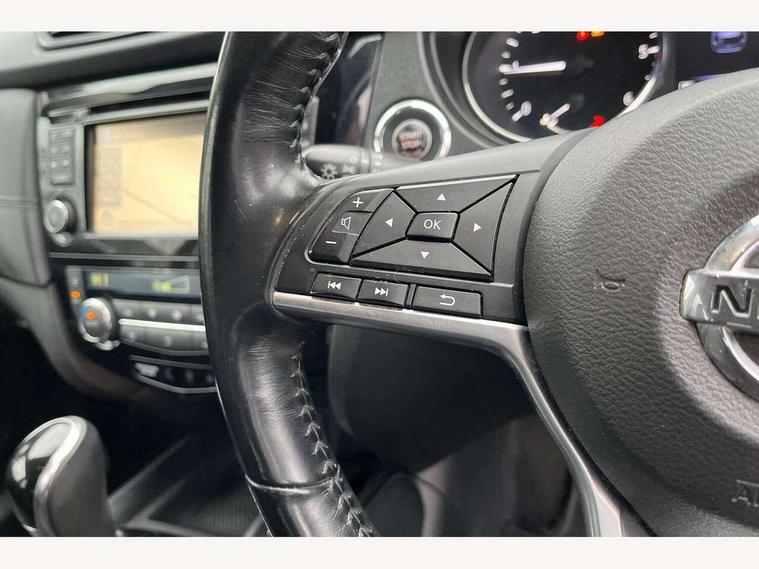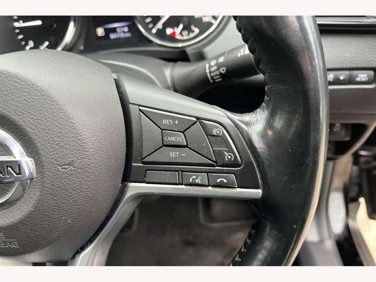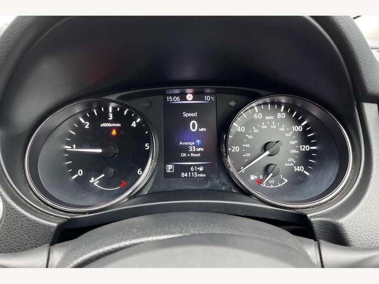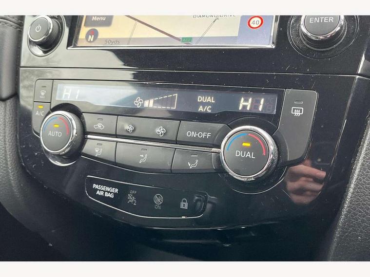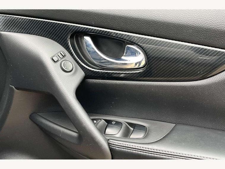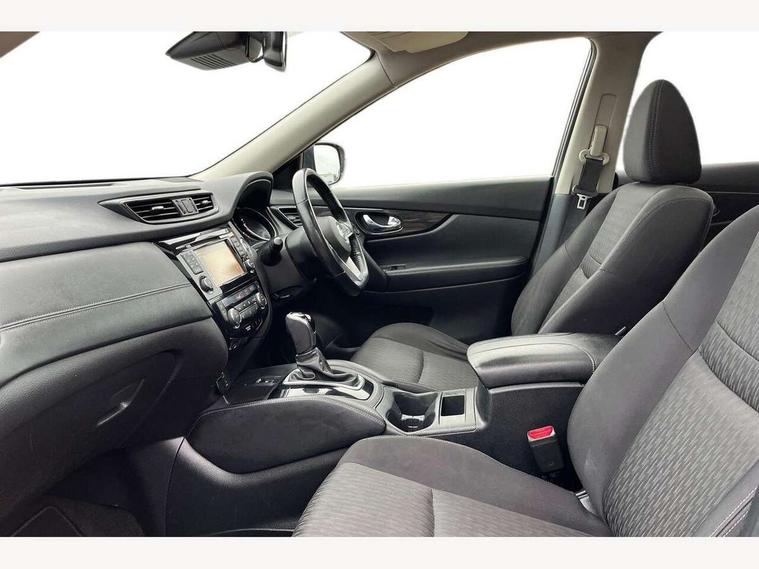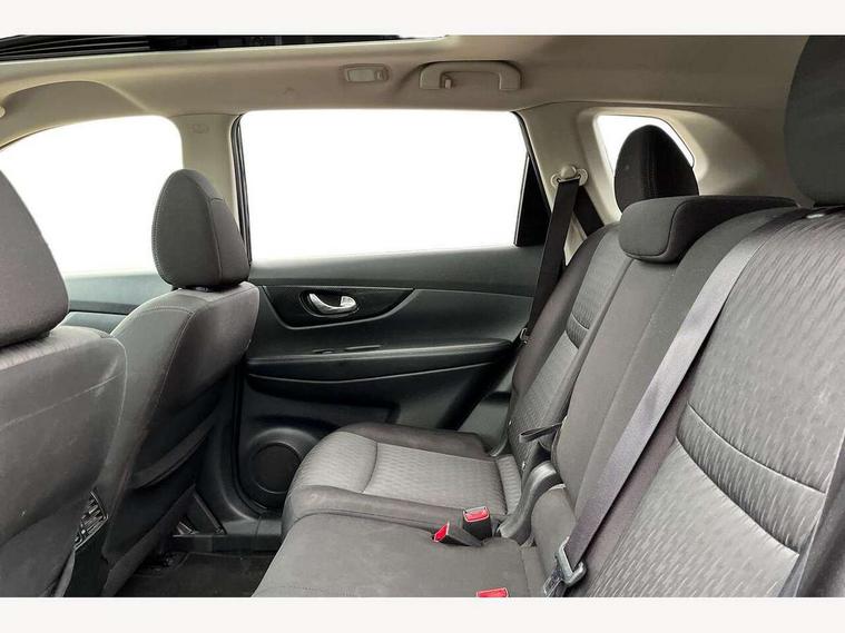 5" TFT driver information centre, Around View Monitor, Attention assist, Automatic tailgate opening, Bluetooth phone integration system, Cruise control + speed limiter, Engine start button, Front and rear parking sensors, Lane departure warning system, Nissan connect sat nav system, PAS, Traffic sign recognition, Trip computer, 6 speakers, Audio remote control in steering wheel, DAB Digital radio, Radio/CD, Smartphone apps, USB/aux input socket, Auto dimming rear view mirror, Automatic headlights, Automatic rain sensing wipers, Black honeycomb front grille, Body colour door mirrors, Chrome door handles, Chrome window surround, Electric folding door mirrors, Electric heated door mirrors, Front and rear power windows, Front fog lights, LED daytime running lights, Panoramic sunroof, Rear privacy glass, Satin silver roof rails, Shark fin roof aerial, 3 rear headrests, 60/40 split rear bench seat, Centre console storage box/armrest, Cloth upholstery, Configurable luggage board system, Dual zone climate control, Front and rear door pockets with bottle holders, Front cupholders, Height adjustable driver/front passenger seats, Height adjustable front headrests, Individual rear reading lights, Isofix child seat attachment, Leather steering wheel and gear knob, Lumbar support, Pollen filter, Rake/reach adjustable steering wheel, Rear armrest, Synthetic leather instrumental panel inserts, Synthetic leather knee pad, 3 point seatbelts on all seats, ABS, Child locks on rear doors, Driver and passenger airbags, EBD + Brake Assist, Electronic parking brake, ESP + traction control, First aid kit, Front and rear curtain airbags, Hill hold assist, Intelligent emergency braking with pedestrian recognition, Seatbelt warning, Tyre pressure monitoring system, Warning triangle, Alarm, Immobiliser, Intelligent Key, Remote central locking, 18" Alloy wheels, Full size spare wheel,