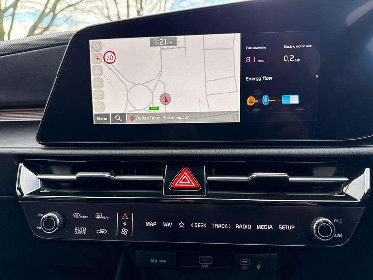 10.25" driver display screen, 10.25" touchscreen satellite navigation, Apple car play/Android Auto with voice control, Blind spot collision avoidance assist, Customisable Head Up Display, Drive mode select (Eco, normal, sport, snow), E-call, Emergency stop signalling system, Forward Collision-Avoidance Assist (FCA) 1.5 - City/Pedestrian/Cyclist/Junction turning, Front parking sensors, Highway Driving Assist (HDA), Intelligent speed limit assist, Kia Connect (UVO), Lane Following Assist (LFA), Lane keep assist, Motor driven power steering, Parking collision avoidance assist (PCA), Rear cross traffic collision avoidance assist (RCCA), Rear parking sensors, Remote smart parking assist, Reversing camera system, Safe exit warning (SEW), Smart cruise control with stop and go functionality, Smart power tailgate, Trip computer with distance/fuel consumption/average speed, Wireless Smartphone charger, 220v AC Inverter, 'Shark fin' mobile antenna, 6 speakers, Bluetooth with music streaming, DAB Digital radio, Steering wheel mounted controls, USB port for connection of a media device, Acoustic windshield, All round electric windows with drivers and front passenger auto up/down and safety function, Auto dimming rear view mirror, Automatic defog system, Automatic headlight control system, Black grille with chrome surround, Black window surrounds, Body colour bumpers, Body colour door mirrors, Body colour exterior door handles, Deluxe door scuff plates, Electrically adjustable and heated door mirrors with LED turn indicator, Electrically folding door mirrors, Front and rear chrome skid plates, Front fog lights, Gloss black wheel arches, Heated rear window, LED daytime running lights, LED Headlights, LED High mounted brake light, LED rear combination lights, Privacy glass - Rear windows and tailgate, Rain sensing front wipers, Rear fog lights, Rear roof spoiler, Rear side wing doors, Rear wiper, Roof rails, Solar glass windscreen, Sunroof with tilting and sliding function, Welcome and follow-me home light functionality, Windscreen Washer Level Warning, 12V socket in front, 12V socket in luggage compartment, 3 seat bench in 2nd row, 60:40 split remote folding rear seats, All-round height adjustable headrests, Alloy pedals, Artificial leather centre console storage box, Artificial leather steering wheel, Artificial leather upholstery, Automatic air conditioning, Centre console cupholder, Chrome coating interior door handles, Driver power adjusted memory seat, Driver/passenger sunvisors with illuminated vanity mirrors, Drivers seat power lumbar support, Front and rear door storage, Front passenger 1 x USB-C charging port, Front passenger power adjusted seat, Front passenger relaxation seat, Glove box, Heated front seats, Heated outer rear seats, Heated steering wheel, ISOFIX Child seat top tethers and anchor fixings, LED Front cabin, rear & luggage compartment lights, Luggage area load cover, Luggage board, Manually adjustable steering column, Paddle shifts, Power adjustable lumbar support on front passenger seat, Rear centre armrest with cupholder, Rear passenger 2 x USB-C charging ports, Seatback pocket - driver, Seatback pocket - front passenger, Shift by wire SBW, Single front passenger seat, Ventilated front seats, Ventiliation ducts to rear compartment, 3 point seatbelts on all seats, ABS, Automatic unlocking of doors in case of impact, Curtain and side airbags, Dual shell horn, Electric parking brake with auto hold function, Electronic stability control, Front airbags, Front passenger airbag cut-off switch, Height adjustable front seatbelts, Hill start assist control (HAC), Knee airbags, Seatbelt reminder warning, Traction control, Tyre pressure monitoring system, Customisable automatic door locking, Customisable automatic door unlocking, Deadlocks, Engine Start/Stop Button with Smart Entry System, Locking wheel nuts, Manual child locks, Rear occupant alert, Smart key with motion sensor, Thatcham category 2 security alarm and immobiliser, Visible vehicle identification number, Warranty - 7 Years/ 100, 000 miles, Centre fascia chopped carbon, 18" Alloy wheels, Tyre mobility kit,