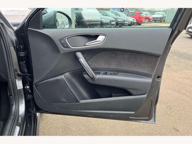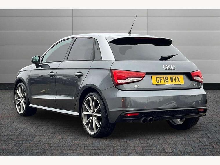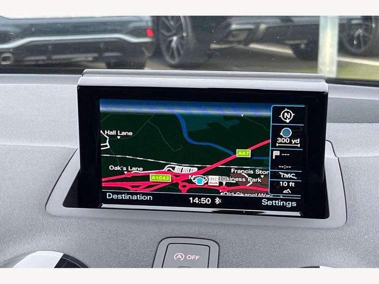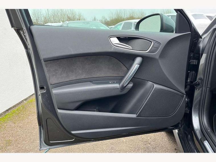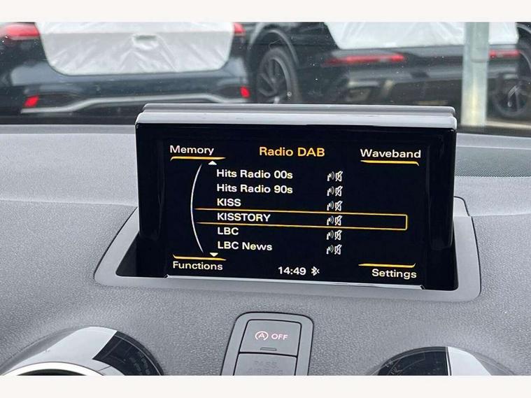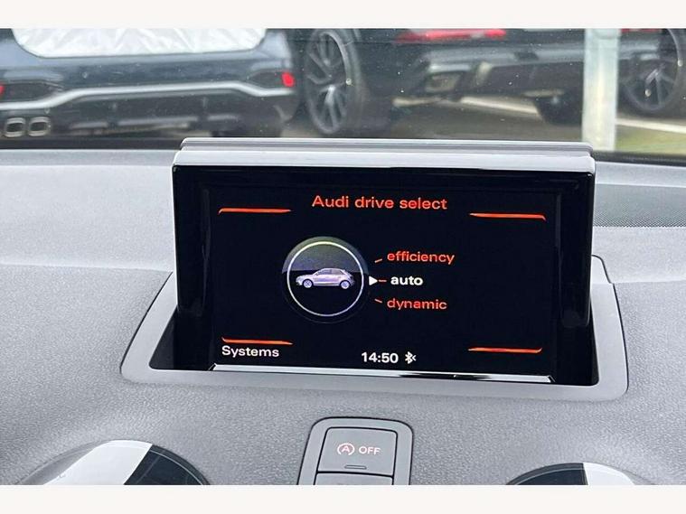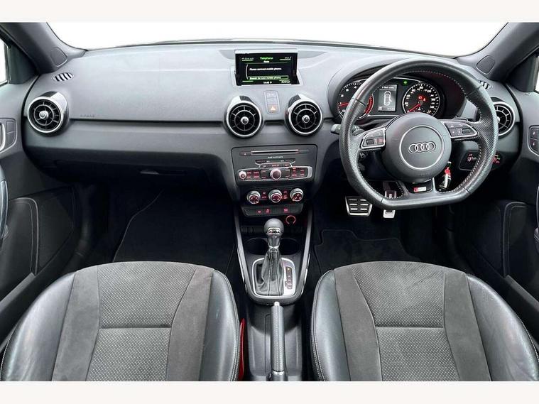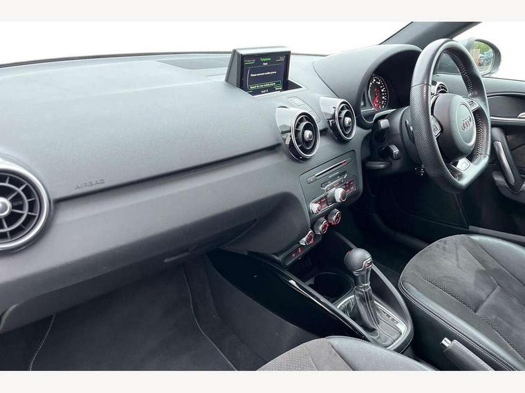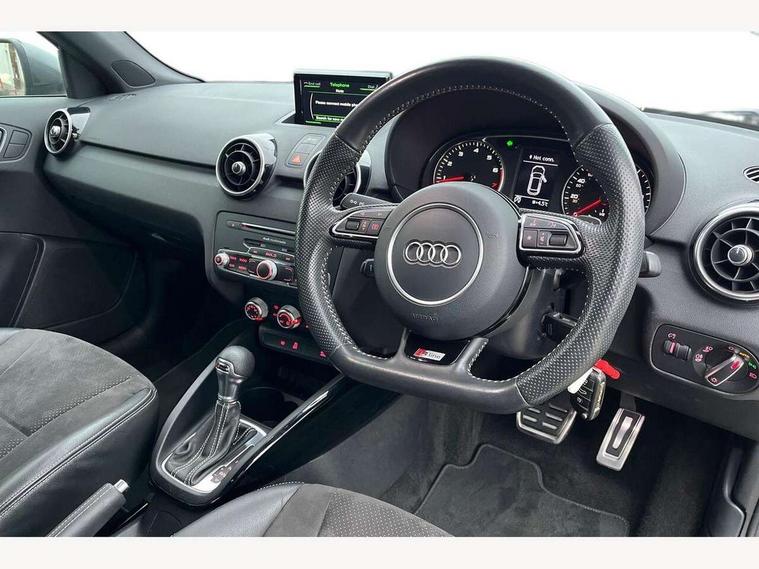 Audi drive select, Cruise control, Driver's information system, Electro-mechanical PAS, Low washer fluid indicator, Service interval indicator, Voice control system, Additional SD card reader, Audi music interface, Bluetooth audio streaming, DAB Digital radio, Adaptive brake lights, Body coloured bumpers, Body coloured door mirrors, Electric adjustable door mirrors, Electric front windows, Electric rear windows, Front fog lights, Heat insulating glass, Heated door mirrors, Heated rear windscreen, Privacy glass, Rain and light sensors, Rear diffuser, Rear wiper, Roof spoiler, S Line body styling, Twin oval high gloss black exhaust tail pipes, Xenon plus headlights including automatic headlights, LED daytime running lights, LED rear lights, dynamic range control and headlight washers, 12V Accessory socket in centre console, 3 rear seats, 3 spoke flat bottom multi-function leather steering wheel including paddle shift, Adjustable rear head restraints, Alcantara/leather upholstery, Black cloth headlining, Cupholders in centre console, Door sills trims with aluminium inlays, Electronic climate control (ECC), Front floor mats, Front head restraints, Front sports seats, Height adjustable front seats, Isofix attachments on rear seats, Jack and tool kit, Leather gear knob, Leather handbrake, Lumbar adjustment for front seats, Rake/reach adjustable steering wheel, Split folding rear seats, Stainless steel pedals, High-gloss black styling pack - A1, 3x3 point rear seatbelts, ABS/EBD, Brake assist function, Driver and passenger side airbags, Driver/Front Passenger airbags, EDL, ESP with ASR, First aid kit, Front and rear seatbelt reminder, Front passenger airbag deactivation, Head airbags, Height adjustable front seatbelts, Tyre pressure monitor, Warning triangle, Locking wheel bolts, Remote central locking with 2 remote folding keys, Thatcham category 1 alarm + immobiliser, Aluminium trim, High gloss black air vent sleeves, High gloss black centre console, Tyre repair kit,