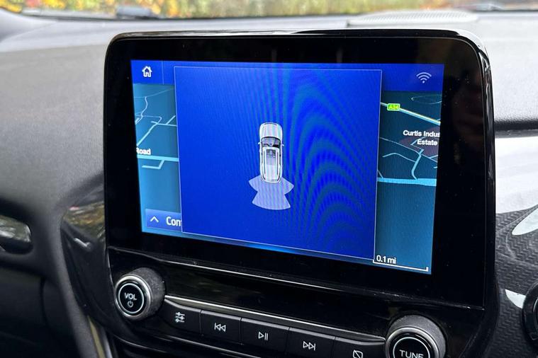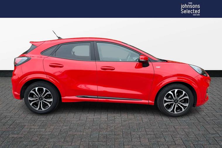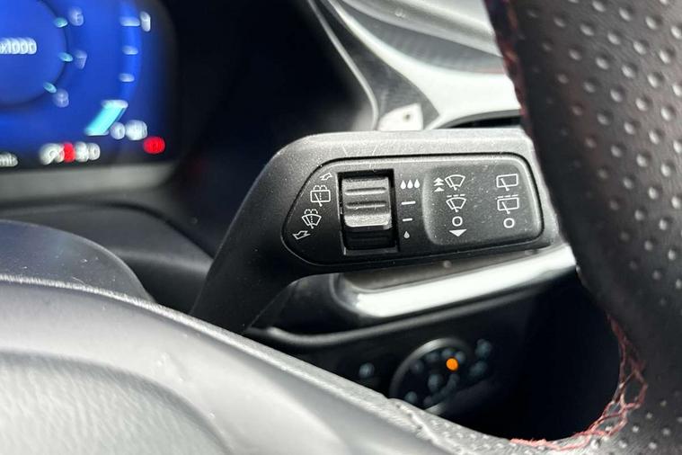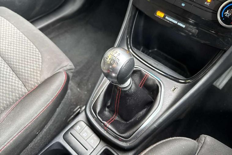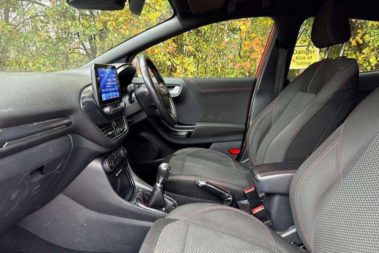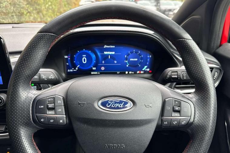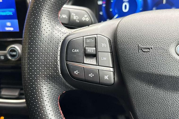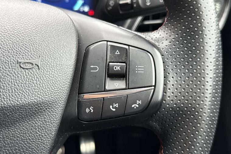 Ford easy fuel, Full digital 12.3" instrument cluster, Lane keeping aid with lane departure warning, Power assist steering, Rear parking sensor, Selectable drive modes(Normal, sport, Eco, trail, slippery), Wireless charging pad, Automatic headlights with rain sensing wipers and auto high beam, Body coloured door mirrors, Front fog lights with cornering lights and LED rear lamps, Power foldable heated door mirrors with puddle lamps, Quickclear heated windscreen, Rear wiper, ST-Line body kit with large rear spoiler wth sports suspension, Alloy sports pedals, Centre console with armrest and stowage, Court cloth upholstery with belgrano bolsters, Driver seat height/lumbar adjust, Ford megabox extended bootspace, Front and rear floor mats, Front and rear head restraints, Manual air conditioning, ST-Line flat bottomed sensico leather steering wheel with leather handbrake and aluminium gear knob, 3 rear seatbelts, Electronic stability control (ESC) and hill start assist, Pre-collision assist with autonomous emergency braking, pedestrian/cyclist detection & post-collision braking, Tyre pressure monitoring system (TPMS), Thatcham alarm, Tyre inflation kit,