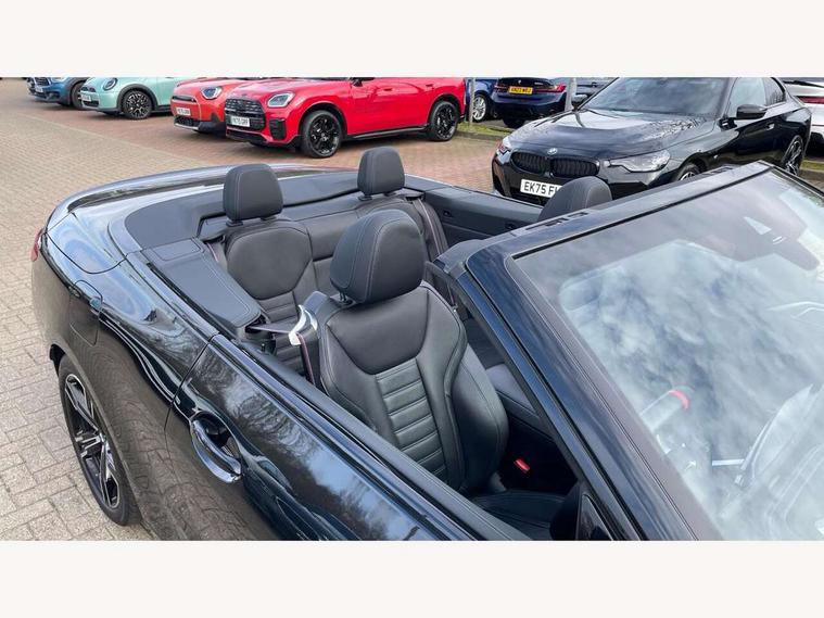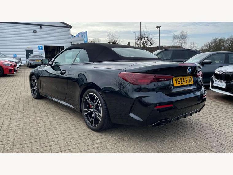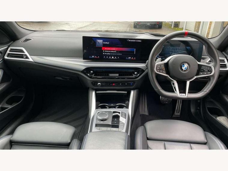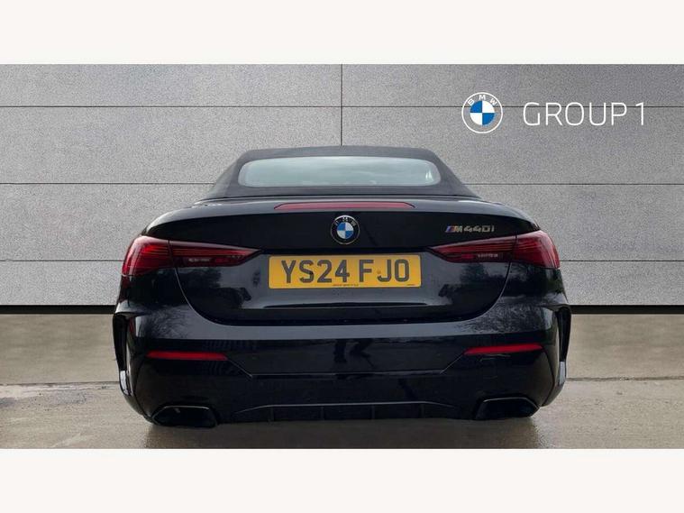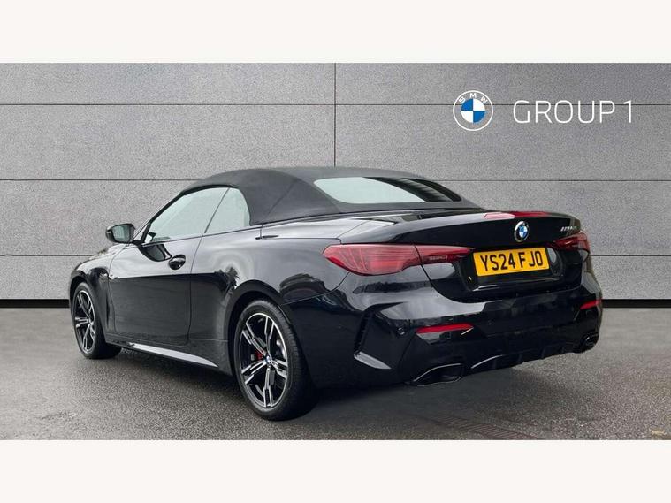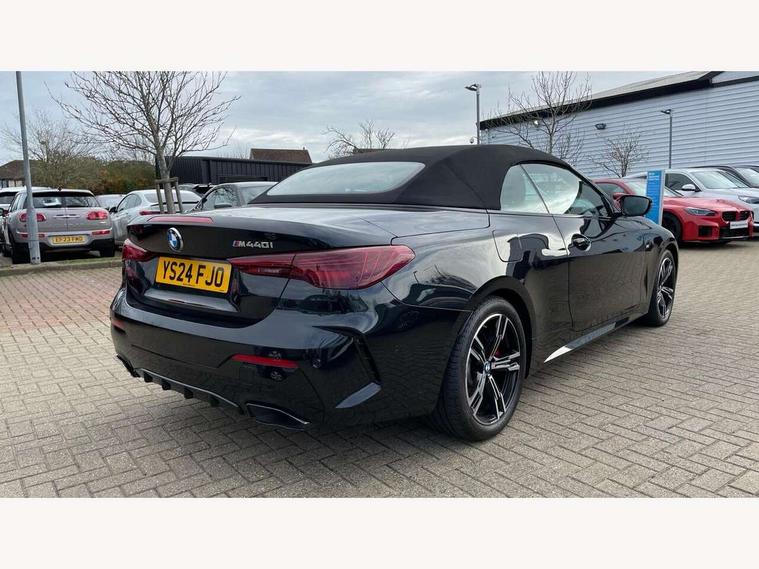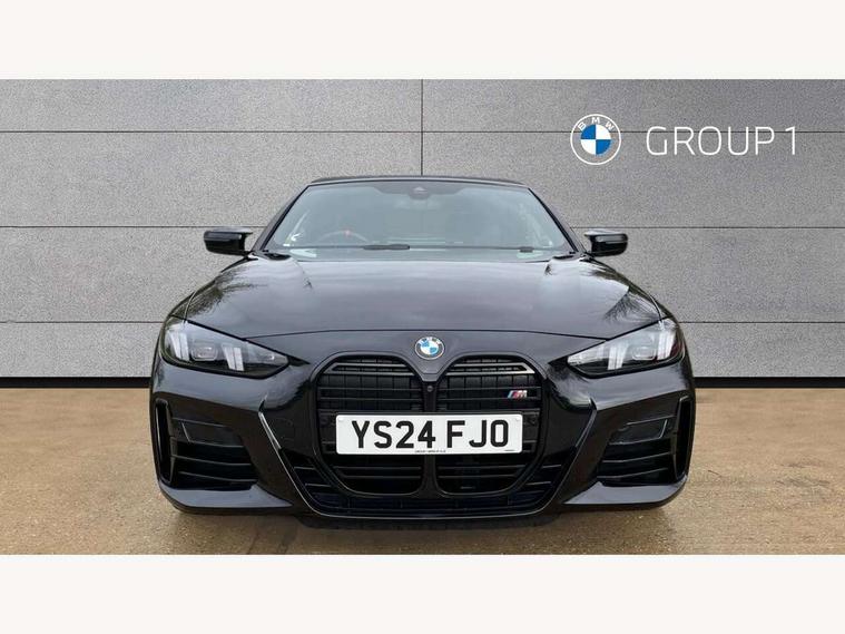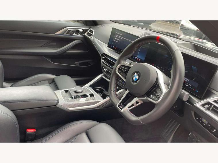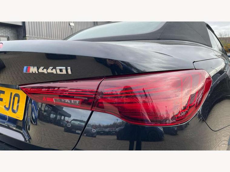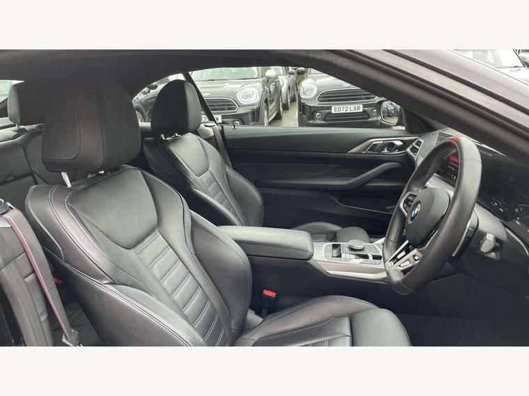 Active guard plus, Attentiveness assist, Auto start-stop, Bluetooth hands free facility with USB audio interface with audio streaming, BMW ConnectedDrive online services, BMW iDrive controller on centre console, BMW service history, BMW Teleservices, Brake pad wear indicator in front and rear, Check Control warning system for monitoring of lights and door/luggage compartment open warning, Condition based service, Electric power steering with Servotronic steering optimised at all speed ranges, Gearshift time display in manual mode, Instrument cluster with speedometer with mph readout, tachometer, fuel gauge and oil temperature gauge, Integrated owners handbook, Oil sensor for level and grade, warning by check control system, On board computer - average speed, fuel consumption, outside temp display with acoustic warning, clock/date, service interval, odometer/trip meter, Optimum shift indicator, Run flat indicator, Shifting point display, Smartphone integration compatible with Apple CarPlay and Android Auto, Variable sport steering, 48V Mild hybrid technology, 8 speed automatic steptronic transmission with gearshift paddles, Active sound design, Balanced 50/50 weight distribution, Double joint spring strut front axle, Drive performance control - ECO PRO, comfort and sport modes, Low centre of gravity, M Sport differential, Petrol Particulate Filter, Sprint mode, Stroke dependent dampers, xDrive system permanent all-wheel drive variable torque distribution, 1x USB type A with data transfer and 1.5 Amp charging function in the centre console, 1x USB type C with 3 Amp charging function in the front centre armrest, DAB tuner, Electronic service booklet, Acoustic glazing, Automatic headlight beam throw control with load dependent regulating reaction, dynamic compensation of braking dive and acceleration squat, Automatic windscreen wipers and automatic headlight, Automatically dimming electrochromatic rear view mirror, BMW emblem on engine compartment lid and tailgate, Body colour fuel filler flap, Body colour roof fin, Brushed aluminium inserts in the front door sill finishers with BMW designation, Door sill strips, Dynamic brake lights, Electric windows - front and rear, with open/close fingertip control, anti trap facility and comfort closing function all round, Exterior mirrors - electrically folding with anti-dazzle, Fading support, Follow me home headlights, Free form tailpipe finisher and side frame trim strip in high gloss black, Front and rear bumper system, Front apron plastic in body colour, Green tinted heat protection glazing, High gloss shadow line exterior trim, Illuminated bow type door handles in body colour drivers side with door lock, Interior rear view electrochromatic mirror with automatic anti dazzle function, LED daytime running lights, LED front fog lights, LED front indicators, Licence plate panel integrated into front bumper and tailgate, Lightweight engineering, M designation on front side panels, left and right, Model and M badges in pearl chrome, One piece front bumper cover including towing eye cover in body colour, Preparation for high beam assistant, Rear boot, Reversing light, Third brake light, Two part LED tailights in L-shape with components in smoked glass, brake light, LED turn indicator and rear fog light, Visible VIN plate, Welcome lights in interior and door handle area, Widened track and increased camber values for max transverse dynamics, agility and steering precision, Wind deflector, Window recess cover black high gloss, Windscreen wipers with integrated heated washing jets, xDrive designation on left tailgate, 12V power socket in front centre console, 2 2nd row folding seats, 2 front cupholder in centre console with clamping elements and matt black inlay, 2 Rear seat headrests, 2nd row centre armrest with built-in cupholders, 3 spoke flat bottom M sport leather multifunction steering wheel, 3 zone automatic air conditioning, 4 pieces lashing eyelets in luggage compartment, Anthracite headlining, Armrest integrated in front and rear door trim + front centre console armrest, Battery in luggage compartment, BMW ID, Driver seat backrest width adjustment, Electric seat adjustment with memory, Extended storage - Luggage compartment partition net on left side trim panel, Bag hook on both sides of the luggage compartment, Front and rear door pockets, Front and rear reading lights, Front sport seats, Heated driver and front passenger seats, Height adjustable front headrests, Height adjustable mechanically and infinitely variable steering column, Illuminated armrest storage compartment, Illuminated glove compartment with separate small compartment, Luggage compartment light, Make-up mirror lights, Single front passenger seat, Storage compartment in rear centre console, Sunvisors with illuminated vanity mirrors and ticket pocket, Toolkit located in luggage compartment, Velour front floor mats, Ambient lighting pack - 4 Series, Connected professional package - 4 Series, M sport exterior styling pack - 4 Series M440i, 2 x 3-point rear seatbelts, Battery safety cut-off, BMW emergency call, Brake energy regeneration, Braking pre-tensioning, Child seat ISOFIX attachment for the two outer rear seats, Coasting in idle in ECO PRO mode, Cornering brake control (CBC), Crash sensor activating of airbags, Unlocking doors, hazard warning lights, interior light, safety battery terminal, Driver and front passenger side airbags, integrated in the door side seat backrest bolsters for all seat variants, Driver/Front Passenger airbags, Dry braking, Dynamic brake control, Dynamic stability control + (DSC+) - Anti-lock Braking System (ABS) with brake assist and cornering brake control + Automatic Stability Control (ASC), Dynamic Traction Control - DTC, Electric parking brake including automatic hold function and automatic release of the parking brake when driving off, Electronic differential lock control (EDLC), Front and rear ventilated brake disc, Front passenger manual airbag de