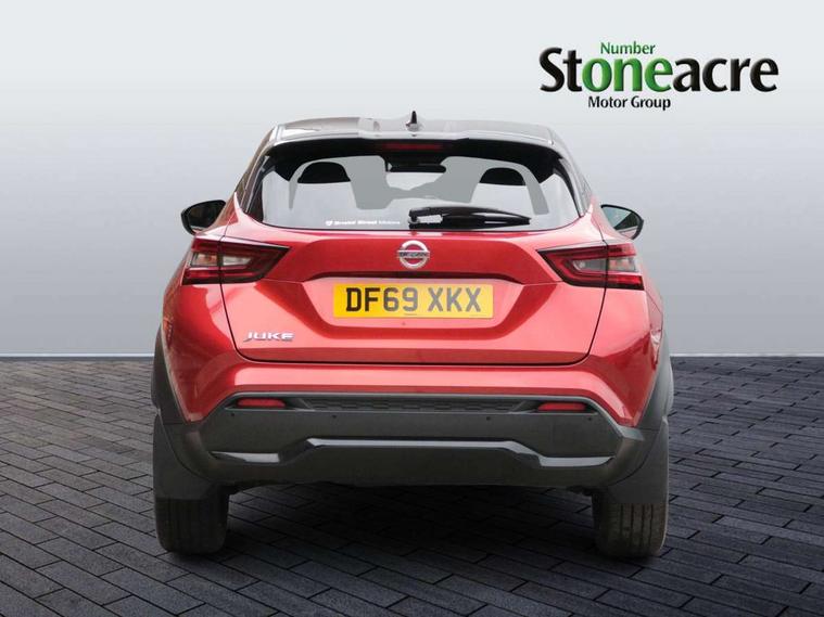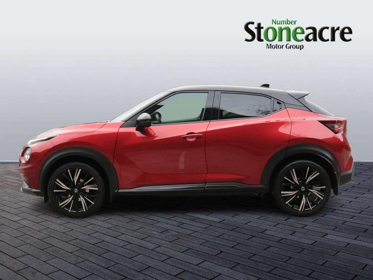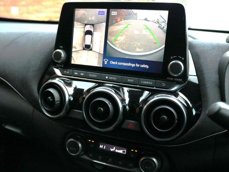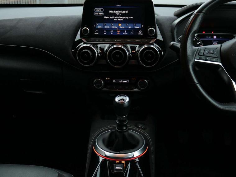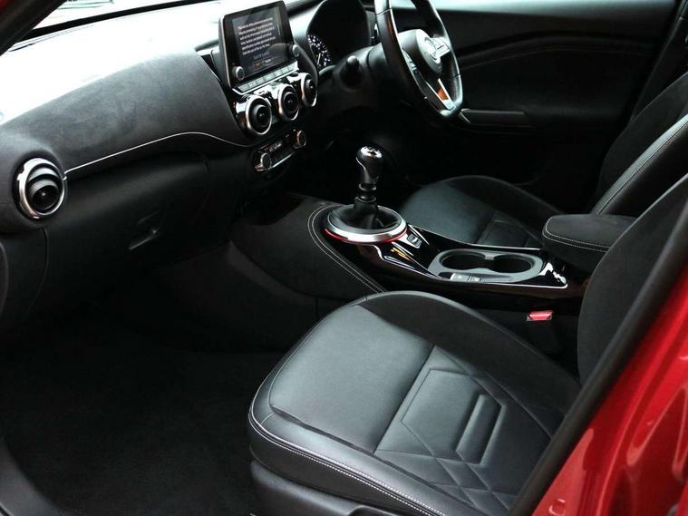 7" full colour TFT screen combimeter, 8" infotainment colour display with touch screen, Apple CarPlay and Google Android auto, Drive modes select (Eco, normal and sport), Emergency and breakdown call, Front parking sensor, Idle start/stop system, Intelligent lane intervention, Lane departure warning system, Nissan connect nav with TomTom traffic, Nissan connect services and Wifi connection, Outside temperature sensor, Power Steering, Rear parking sensor, Traffic sign recognition, Trip computer, Gasoline particulate filter, Bluetooth system, USB, Aux-in and 12V socket, Bose personal plus audio system with 8 speakers(4 speakers and 2 headrest speaker for driver and passenger seats), Bose personal sound stage control, DAB Digital radio, Front lower bumper painted in silver finisher, Rear console USB port, Auto dimming interior rear view mirror, Automatic hazard signal with emergency stop signal, Body colour bumpers, Body colour door handles, Electrically adjustable door mirrors with integrated indicators, Follow me home headlights, Front and rear electric window with one touch driver and passenger window, Heated and auto folding door mirrors, High beam assist, LED daytime running lights, LED front fog lights, LED headlamps, LED rear fog lamp, LED rear lamps, Rain sensor windscreen wipers, Rear privacy glass, Rear spoiler, Rear wiper, Thermaclear heated windscreen, Three blink turn signal, 3 height adjustable rear headrests, 60/40 split folding rear seat, Automatic climate control, Card holder on driver sunvisor, Door ambient lighting, Driver and passenger sliding and reclining seats, Driver seat back pocket, Driver side rear coat hanger, Driver/passenger sunvisors and illuminated vanity mirrors, Front and rear cabin lighting, Front armrest, Front door pockets with bottle holders, Front head restraints, Front passenger isofix child seat anchorage point, Front/rear passenger grab handles, Gear console ambient circle lighting, Grey synthetic leather kneepad, Heated front seats, Height adjustable driver's seat, Height adjustable passenger seat, Internal chrome door handles, Leather gearshift knob, Leather steering wheel, Luggage board, Luggage space lighting, Monoform sporty seats, Multifunction steering wheel, Passenger seat back pocket, Rear door bottle holders, Telescopic steering wheel adjustment, Two cupholders in front centre console, Two rear isofix child seat anchorage points with top tether, Voice recognition switch on steering wheel, Welcome light and console tray ambient lighting, Advanced safety shield pack - Juke, ABS with EBD and brake assist, Active ride control, Active Trace Control, Driver and passenger airbags, Driver and passenger side airbags, Electric handbrake with auto hold function, Electronic Stability Programme (ESP), Front and rear curtain airbags, Height adjustable seatbelts, Hill start assist, Intelligent emergency braking with pedestrian and cyclist recognition, Seatbelt reminder for driver/front passenger and rear seats, Single tone horn, Three 3 point rear seatbelts, Traction control, Tyre pressure monitoring system, VDC Dynamic Vehicle Control, Ventilated rear brake discs, Alarm, Immobiliser, Intelligent Key with push button starter, Remote central locking, 19" Akari alloy wheels,