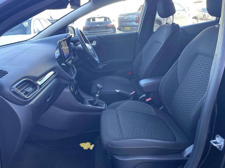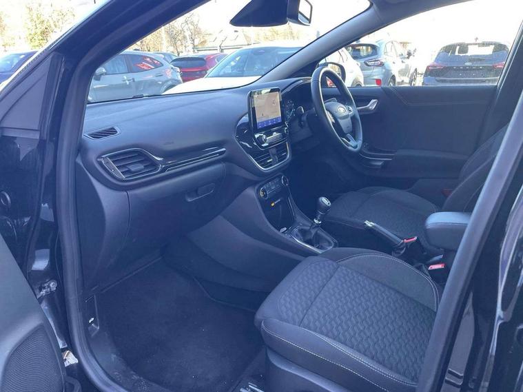 Driver impairment monitor, Emergency call service, Ford easy fuel, Lane keeping aid with lane departure warning, Power assist steering, Power start button, Rear parking sensor, Selectable drive modes(Normal, Eco, Sport, Slippery and Trail), Speed sign recognition, Standard suspension, Automatic headlights with auto high beam, Automatic rain sensing wipers, Body colour rear spoiler, LED rear lamps, Power foldable heated door mirrors with puddle lamps, Projector headlamps with LED day time running lights and front fog lamps, Quickclear heated windscreen, Rear side wing doors, Rear wiper, Third brake light, 3 seat bench in 2nd row, Centre console with armrest and stowage, Electronic automatic temperature control (EATC), Ford megabox extended bootspace, Front and rear head restraints, Front floor mats, Manual 2 way passenger seat adjustment, Manual 4 way driver seat adjust with lumbar adjustment, Sensico leather steering wheel/gear knob/handbrake, Single front passenger seat, Titanium cloth upholstery, Ford SYNC 3 navigation pack - Puma, 3 rear seatbelts, Child safety lock, Electronic stability control (ESC) and hill start assist, Pedestrian/cyclist detection & post-collision braking, Pre collision assist system, Tyre pressure monitoring system (TPMS), Thatcham alarm, 17" 10 spoke absolute black machined finish alloy wheel,