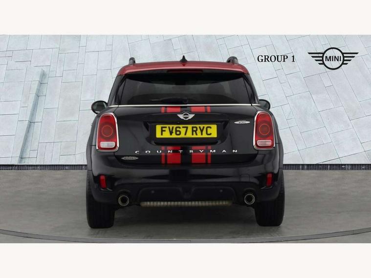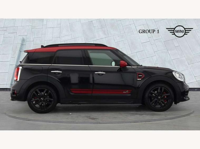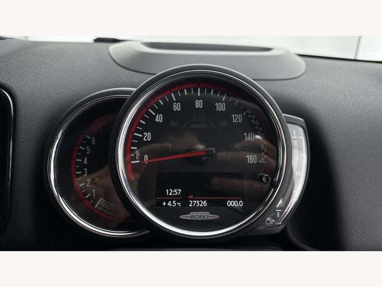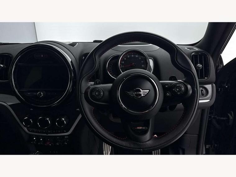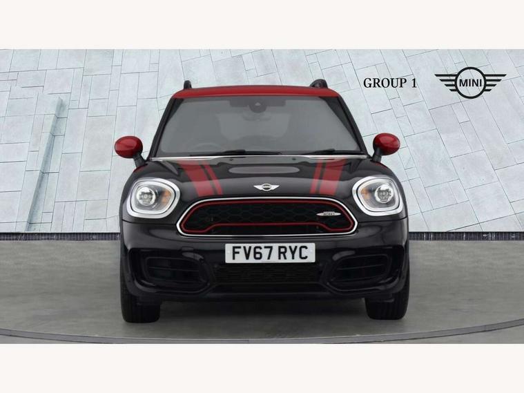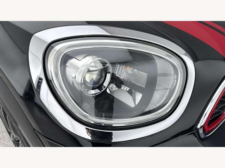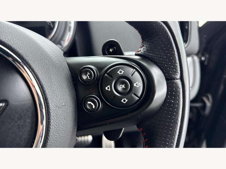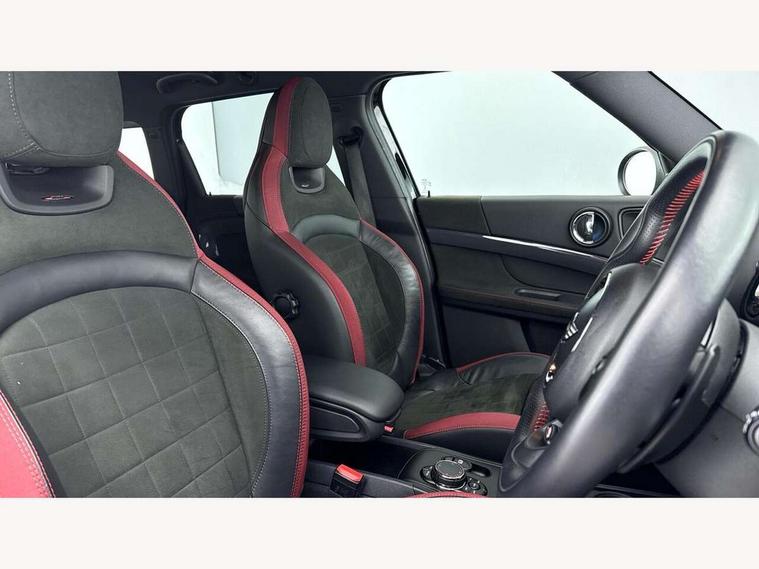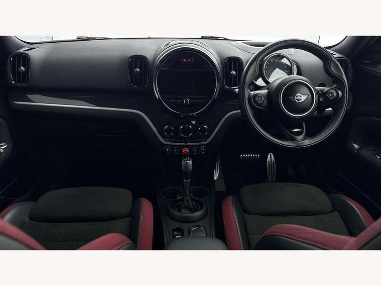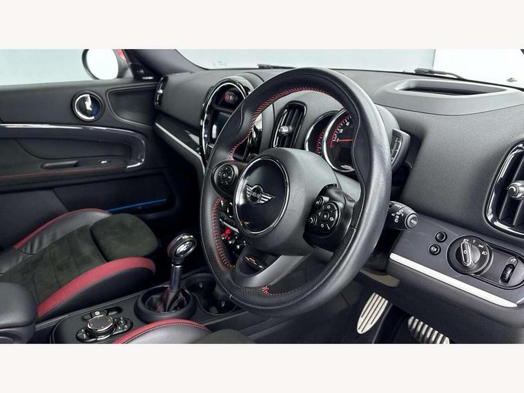 Brake pad wear indicator warning light, Central display with LED ring and 6.5" colour touch screen, DTC - Dynamic traction control, Exterior temperature gauge, Intelligent emergency call, MINI Driving Modes - centre toggle switch to control driving setting (sport, mid and green), MINI TeleServices, Navigation system, On board computer, Personal Profile, Service interval indicator, Servotronic speed sensitive power steering, Electronic differential lock, Performance Control, Sports suspension, Auxiliary input socket, DAB digital radio module, MINI Connected, MP3 compatible radio/single CD player, Radio visual boost, Aerodynamic body kit, Anti dazzle rear view mirror, Blue tinted glass, Body colour scoop integrated into engine- compartment lid, Body coloured bumpers, Chili red side scuttle, Chrome door handles, Chrome headlight surround, Chrome plated radiator grille, Chrome window surround, Electric front windows + one touch + anti-pinch, Electrically adjustable door mirrors, Follow me home headlights, Front fog lights, Heated door mirrors/heated windscreen washers, Heated rear window with automatic switch off, John Cooper Works roof spoiler, LED headlights with cornering lights, LED tail lights and LED daytime running lights, Metal look door sill finishers, Rain sensor including auto headlights activation, Rear wiper, Twin chrome exhaust tailpipes, White indicator lights, 12V power point front, 2 cupholders in front centre console, 4 lashing points to secure luggage, 40:20:40 split folding rear seats, Anthracite headlining, Centre console storage box, Chrome interior door handles, Driver/passenger sunvisors, Front and rear headrests, Front and rear Isofix child seat preparation, Front and rear velour floor mats, Front centre armrest with storage compartment, Front interior light, Front seat backrest storage nets, Heater with recirculation function, Height/reach adjust steering wheel, Luggage compartment lighting, Multifunction steering wheel, Rear grab handles, Sensatec gearshift and handbrake, Sport front seats, Storage compartments in doors, Toolkit in luggage compartment, Interior lights pack - Countryman, MINI Excitement Pack - Countryman, 3 point automatic seatbelts, 3 point seatbelts on all rear seats, ABS, Cornering brake control (CBC), Crash Sensor - activates hazard/interior lighting + unlocks doors, Driver and passenger airbags, Driver and passenger side airbags, DSC - Dynamic Stability Control, Electronic brake force distribution, Electronic parking brake, Front curtain airbags, Front passenger airbag deactivation, Fuel cut off safety device, Hill start assist, Pyrotechnically pre-tensioned front seatbelts, Tyre pressure warning, Automatic door locking, Comfort access system, Keyless start, Locking wheel bolts, RF remote control central locking, Second remote key, Thatcham category 1 alarm + immobiliser,