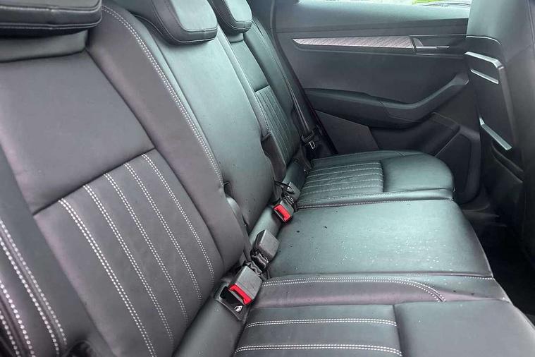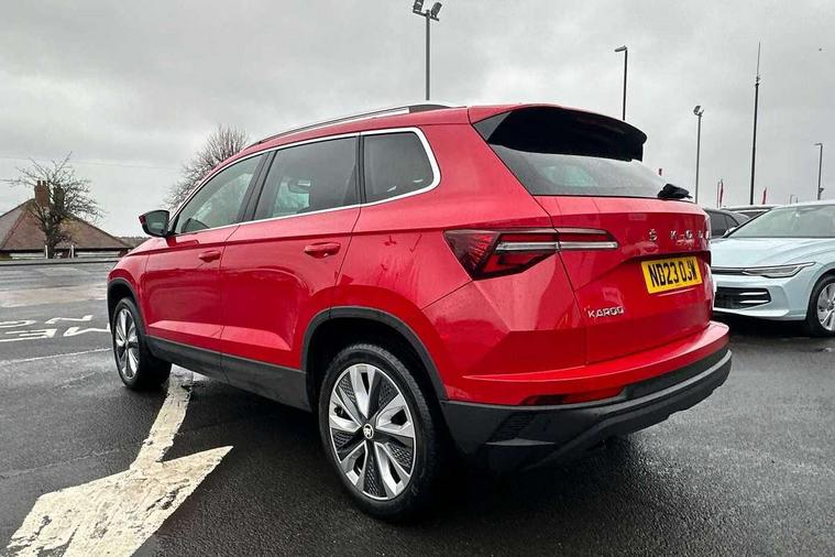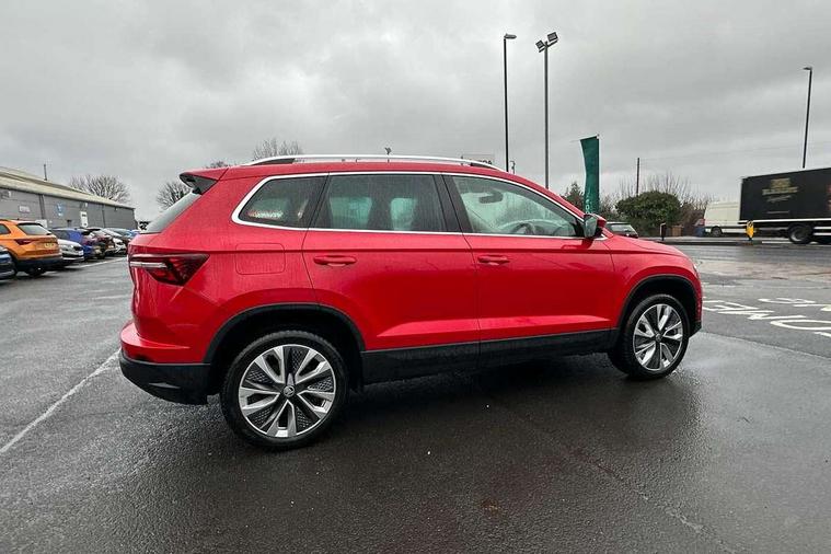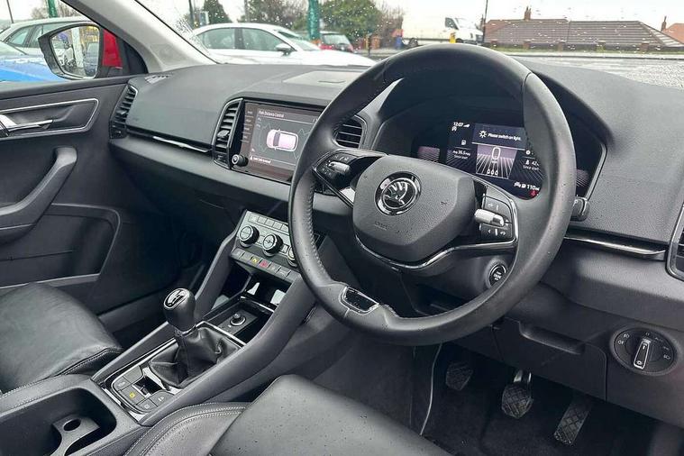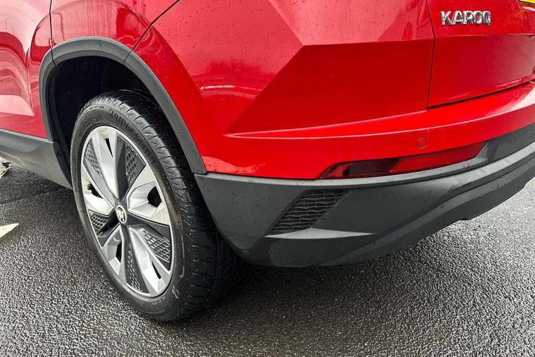 8" Digital display, Care connect, Drive mode selector, Driver fatigue sensor, Electro-mechanical PAS, Emergency services call system, Outside temperature gauge, Service interval indicator, SmartLink wireless for Apple and wired for Android, Start/stop system with regenerative braking, USB C Port x 2 in front centre console, 8 Speakers, DAB radio with Bluetooth, USB connection, Acoustic glass, Aero front windscreen wipers with intermittent function, Auto dimming rear view mirror with light and rain sensors, Black electric window control buttons, Body colour door mirrors and handles, Dynamic headlight range control with cornering light function, Electric front and rear windows with child proof lock, Heated rear windscreen, LED daytime running lights, LED rear lights with high functionality welcome effect and dynamic indicators, Light assistant (coming/leaving home/tunnel light), Plastic scuff plates, Privacy glass, Rear side wing doors, Rear spoiler, Rear window wiper with washer system and intermittent control, Safety reflectors on front doors, Third brake light, 1.5 litre bottle holders in driver and front passenger door panels, 12V socket in boot, 12v socket in front centre armrest with storage compartment and rear air vents, 2 spoke leather heated multifunction steering wheel, 2 x Tablet holder, 3 rear height adjustable headrests, 3 seat bench in 2nd row, 4 foldable roof handles with rear coat hooks, Black floor carpet, Chrome inner door handles, Decorative door sills with KAROQ badging, Double sided boot floor, Foldable hooks in the boot, Front head restraints, Height adjustable front three point seats belts with tensioners, Height/reach adjust steering wheel, Ice scraper, Illuminated glovebox, Illuminated luggage compartment, Isofix child seat preparation for front passenger seat, Isofix child seat preparation outer rear, Manual lumbar support for front seats, Pen holder, Pollen filter, Rear boot cover, Rear reading lights, Rubbish bin door, Safety vest holder, Single front passenger seat, Storage box in upper central dashboard closed, Sunvisors with illuminated vanity mirrors, Textile floor mats, Ticket holder, VarioFlex seats with standard rear seat release, Boot pack - Karoq, Chrome roof rails + chrome pack - Karoq, Parking pack - Karoq, Automatic door unlocking in case of crash, Automatic fuel cut off in case of crash, Child locks on rear doors, Driver airbag, Electronic parking brake with auto hold function, Emergency rear braking signal, ESC including ABS, MSR, ASR, EDS, HBA, DSR, RBS, MKB and traction control, Front side airbags, Hill hold control, Knee airbags, Passenger airbag with switch-off function, Pedestrian monitor, Seatbelt reminder signalisation and pretensioner for all seats, Three point seatbelts rear, Two tone horn, Tyre pressure display, Tyre pressure monitor, Alarm with interior monitoring, back up horn and tilt sensor with safe function, Electronic engine immobiliser, Keyless entry and start/stop, Remote central locking with 2 remote folding keys, Chrome framed air vents, 18" Miran alloy wheels in black, Anti-theft wheel bolts protection, Storage on wheel cover, Tool kit,