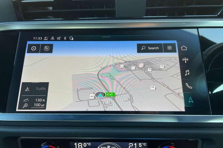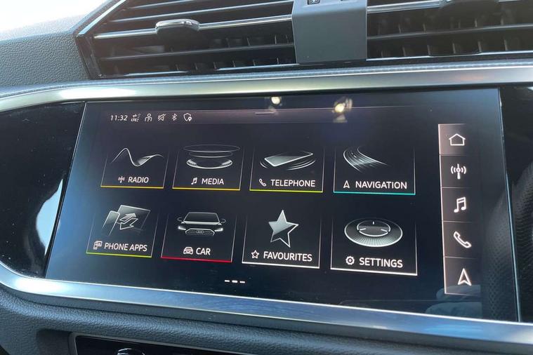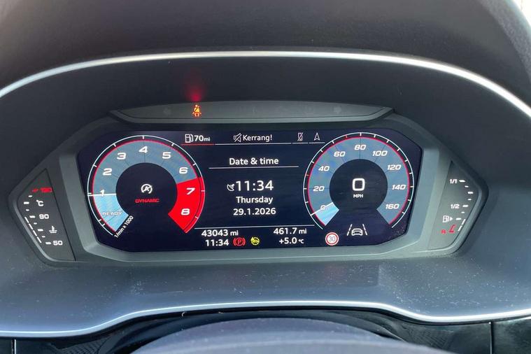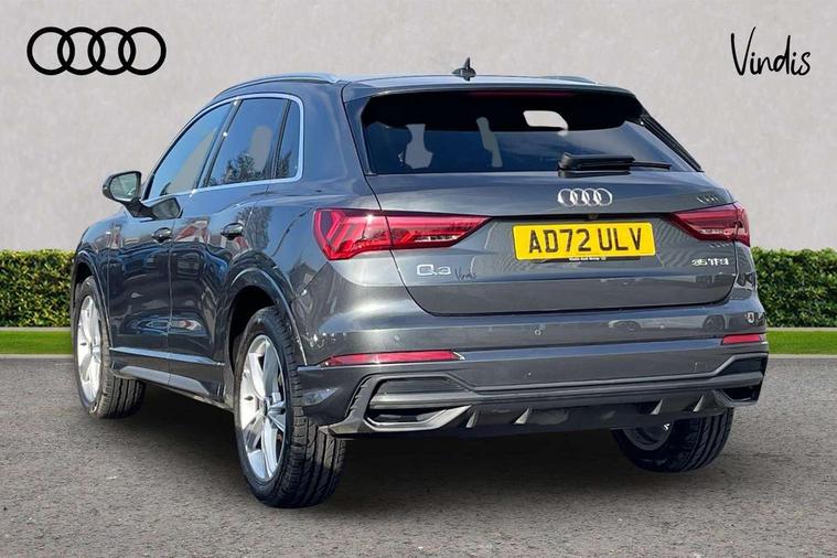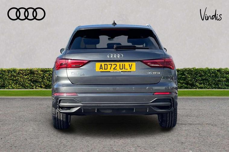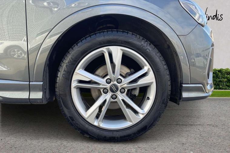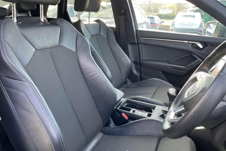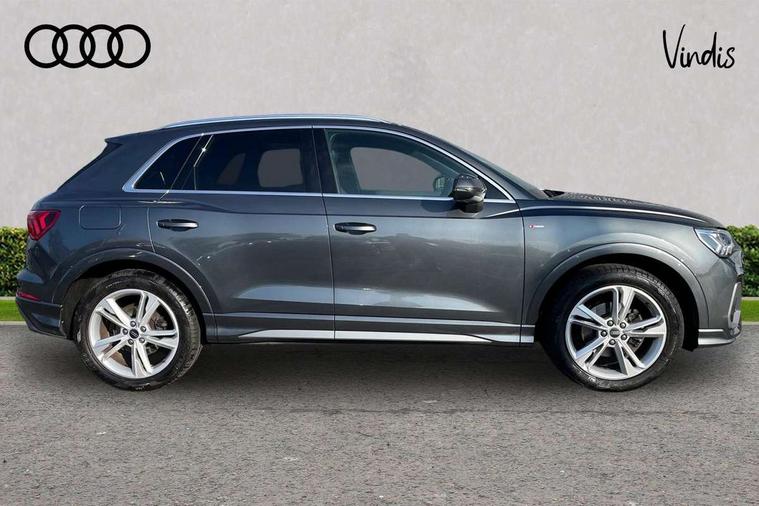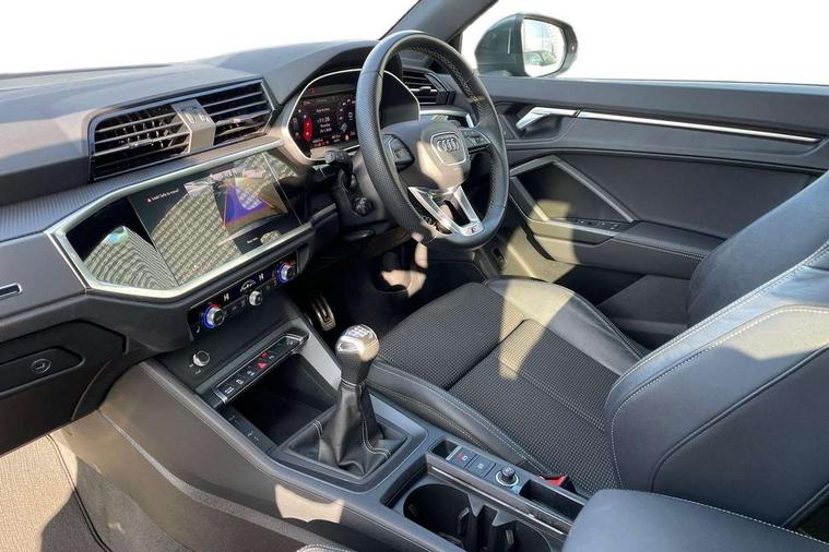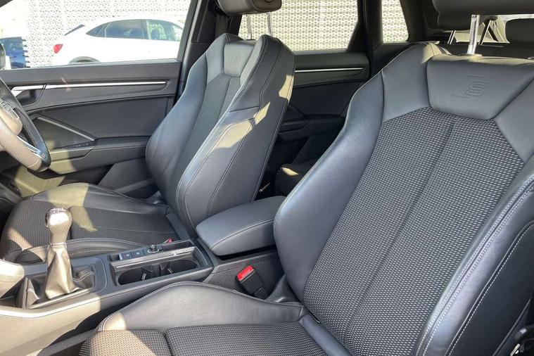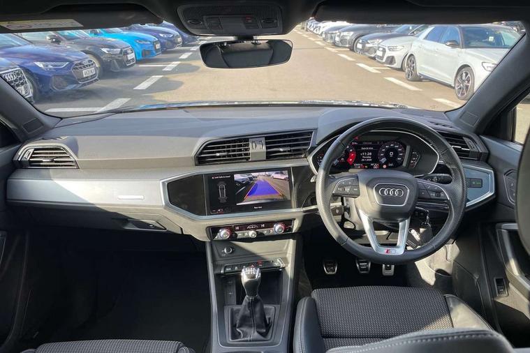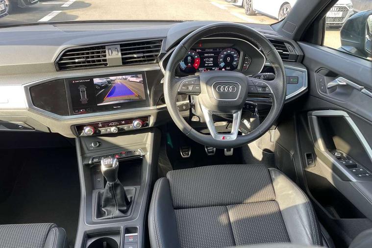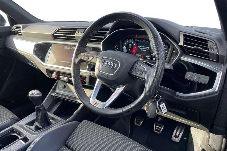 Amazon alexa Integration, Audi drive select, Audi lane departure warning, Audi Virtual Cockpit - 10.25" display, Bluetooth interface, Camera based traffic sign recognition, Cruise control + speed limiter, Legal emergency call, MMI Navigation Plus with high resolution 10.1 inch touchscreen colour display, Power operated tailgate, Progressive steering, Rear parking sensors, Service interval indicator, Smartphone interface includes wireless Apple carplay/Android Auto, Start stop system with recuperation, Voice control system with natural language interaction, Sports suspension, 2 USB-C ports with charge and data functions, 6 passive loudspeakers, DAB digital radio module, Acoustic windscreen, Aluminium roof rails, Aluminium window trim, Auto dimming frameless rear view mirror, Body colour front spoiler blade, Body coloured bumpers, Electrically folding, adjustable and heated door mirrors with integrated LED side indicators and kerb view function for passenger side, Front and rear electric windows, Front fog lights, Front side air inlets in matt platinum grey, Grille vertical bars in aluminium silver/Matt, High gloss black finish B and C pillars, LED Dynamic rear indicators, LED headlights with LED daytime running lights, LED rear lights, LED third brake light, Privacy glass dark tinted rear and rear-side windows (from B-pillar backwards), Rain and light sensors, Rear diffuser grille in grained matt black, Rear diffuser strip in matt titanium black, Rear side wing doors, Rear wiper, S line badges on front wings, S Line front and rear bumpers, Side skirt insert in matt Platinium grey, Titanium black radiator grille, Variable front intermittent wipers, 12V socket in rear centre console, 3 seat bench in 2nd row, 40:20:40 folding with manual adjustment for 60:40 forwards/backwards position and backrest angle, Adjustable rear seat bench/backrest with centre armrest and cupholder, Black cloth headlining, Dual zone electronic climate control, Front and rear black floor mats with contrast stitching in rock grey, Front and rear headrests, Front and rear roof module including reading lights, Front centre armrest, Glove compartment lighting, Height and reach adjustable steering wheel, Illuminated door sill trims with S logo, ISOFIX child seat mounting for front passenger with airbag deactivation and outer rear seat including top tether attachment point for outer rear seats, Luggage compartment light, Manual front seats with height adjustment, Perforated leather gearknob, Single front passenger seat, Stainless steel luggage compartment sill finisher, Stainless steel pedals, Ambient lighting pack - Q3, Non smoking pack - Q3, 3x3 point rear seatbelts, 6 airbags - Driver, front passenger, curtain and side windows, Audi pre-sense front with pedestrain and cyclist recognition, Electrically operated child locks on rear doors, Electromechanical parking brake, Electronic stabilisation control including ABS, ASR and EDL, Front seatbelt reminder, Hill descent control, Hill hold assist, Pre sense basic, Seatbelt monitoring, Tyre pressure warning, Warning triangle and first aid kit, Anti theft alarm, Anti theft wheel bolts, Immobiliser, Remote central locking, Dark matt brushed aluminium inlay, Detail dashboard around MMI touch colour display in glass look, black with surround in aluminium look, Leatherette door armrest,