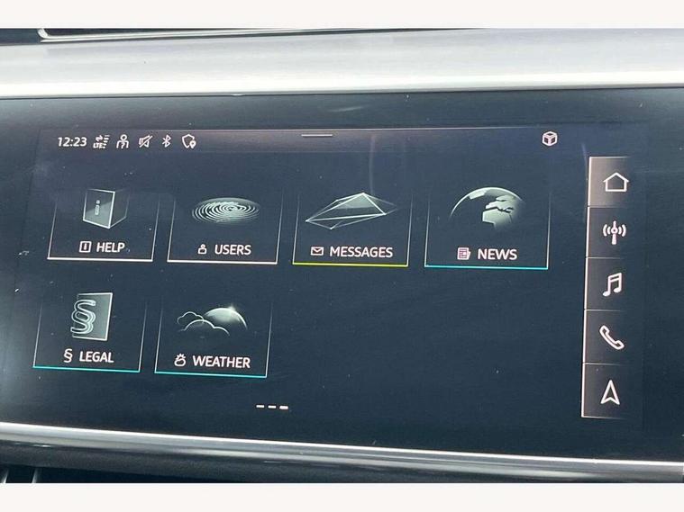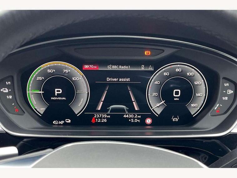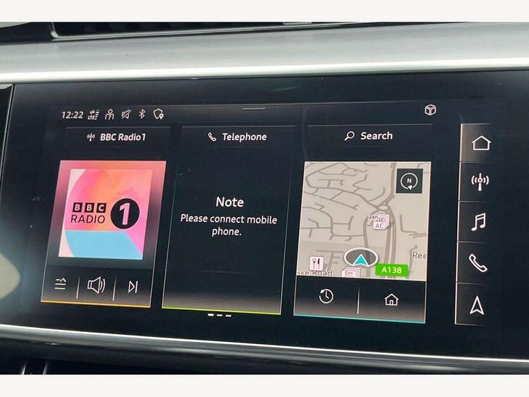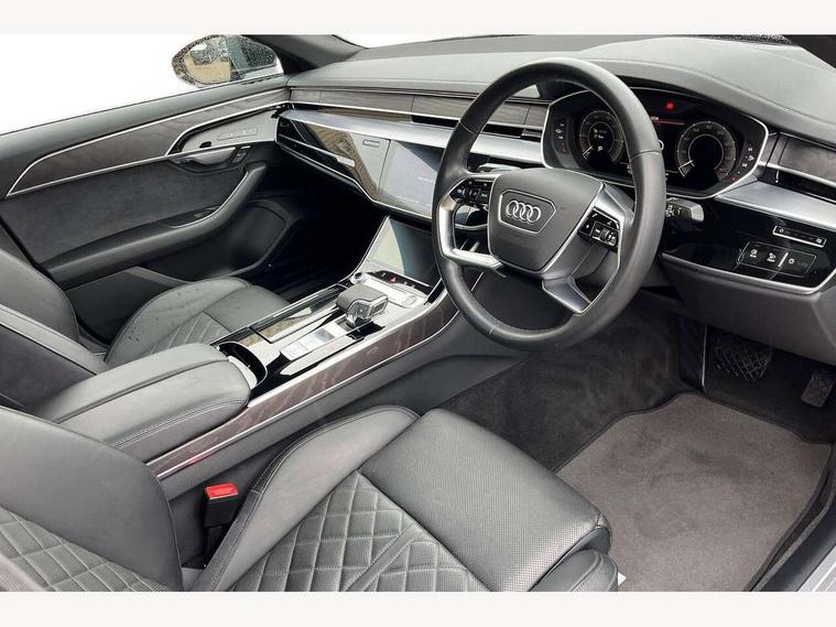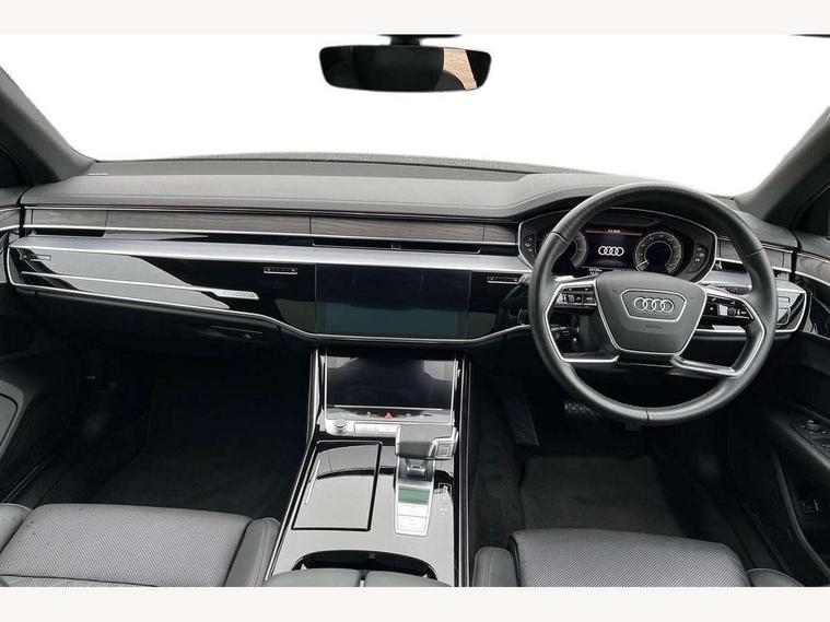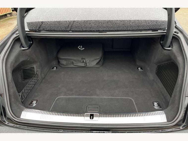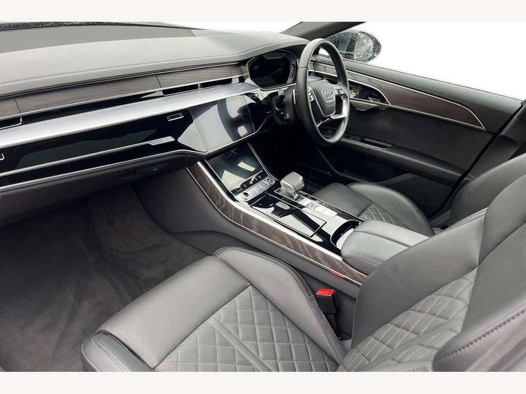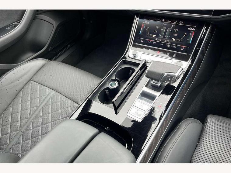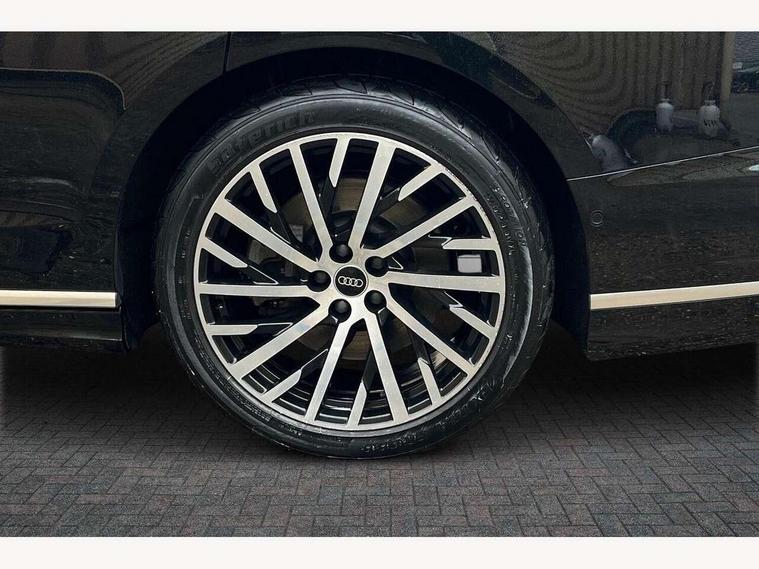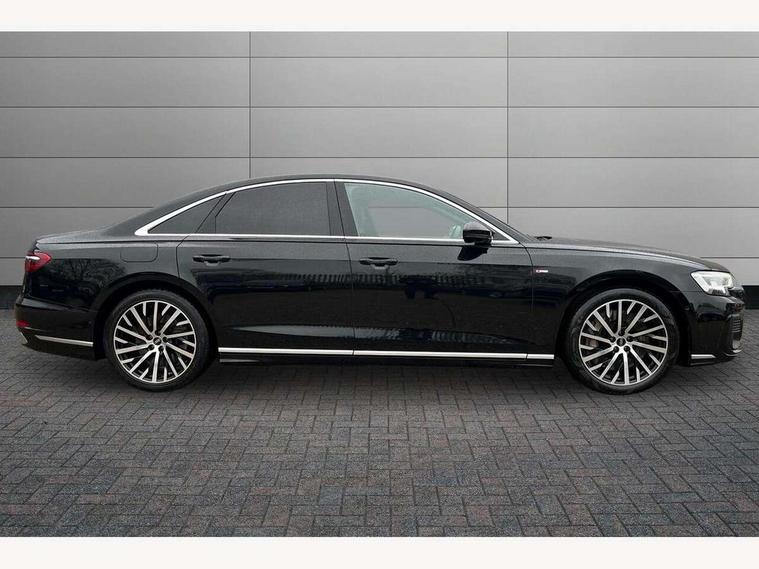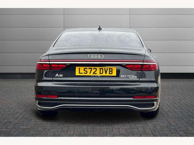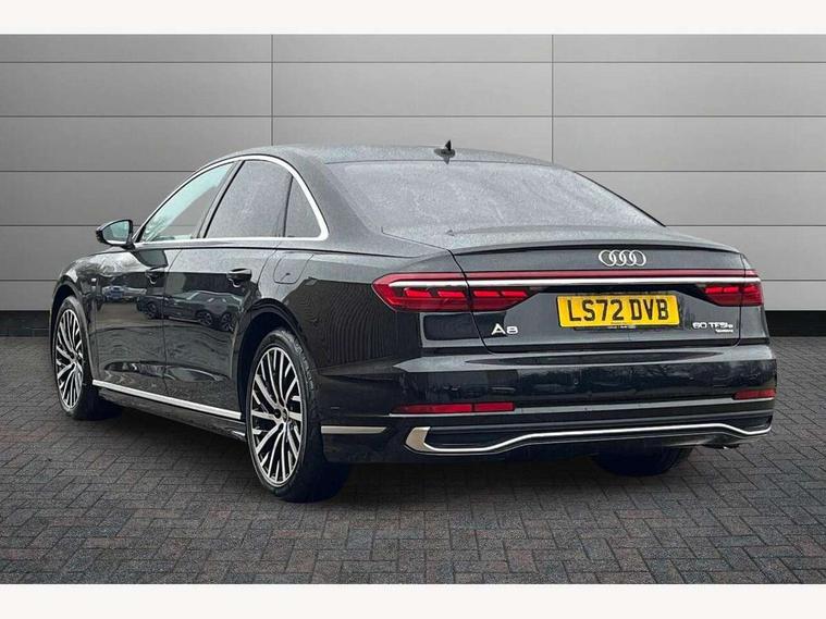 'Lights On' Reminder warning buzzer, Adaptive cruise control with cruise assist, emergency assist, efficiency assist, swerve assist, turn assist and speed limiter, Audi connect safety and service (e-call), Audi drive select, Audi parking system plus with front and rear sensors, Audi phone box with wireless charging, Audi virtual cockpit, Audi wireless smartphone interface, Bluetooth interface, Camera based traffic sign recognition, Convenience key, Electro - mechanical power assisted steering, Head up Display, MMI navigation plus with MMI touch + Twin touch screens with haptic feedback, Operating buttons in black, glass look with haptic feedback including extended aluminium look, Power door closure, Power operated tailgate, Rear view camera, Remote fuel filler release, Service interval indicator, 3 pin 10 amp domestic charging cable, 65 litre fuel tank, 7.4 kW onboard charger, 8 speed transmission with hill hold assist, Adaptive air suspension, Hybrid drive system PHEV, Industrial connector CEE 32A, 230V, long and straight for the e-tron charging system, Mode 3 charging cable for public charging (AC), Quattro all wheel drive with self locking centre differential, Type 2 socket for AC charging, Audi music interface, Audi sound system, DAB digital radio module, DVD System, MMI radio plus, USB connection, Acoustic double glazing, Audi space frame, Auto dimming rear view mirror, Body colour bumpers, Body colour door handles, Body colour exterior mirror housings, Body colour side protection with aluminium trim strips, Electric front windows, Electric rear windows with isolation switch, Electrically adjustable heated folding + automatically dimming exterior mirrors with memory function and integrated LED indicators, Headlight cleaning system, Heat insulating glass in side and rear windows, Heat insulating glass windscreen, Heated rear window, Heated windscreen washer jets, High beam assist, LED brake lights, LED daytime running lights, OLED rear lights with changeable rear light signature, Privacy glass, Rear boot, Rear side wing doors, Side skirts, Third brake light, 12V socket, 3 seat rear bench with centre armrest in 2nd row, 4 way electric lumbar support for driver and front passenger, 4 zone control automatic air conditioning, Auxiliary climate control with remote precondition, Black cloth headlining, Centre console with cupholders, Comfort centre armrest, Door pockets with bottle holder, Driver and front passenger side sunvisors with illuminated vanity mirrors, Dust/pollen filters, Electric front seats with memory function, Electric sunblinds for rear window and rear door windows, Front floor mats, Glove compartment cooling, Heated front seats, Height/reach electric steering column with easy exit function, Isofix child seat mounting points on outer rear seats, Leather gearknob, Passenger footwell storage net, Reading lights, Rear floor mats, Rear headrests, Roof mounted sunglasses holder, Single front passenger seat, Valcona leather upholstery with front sports seats in diamond quilted, Chrome exterior pack - A8, High gloss styling pack - A8, LED interior lighting pack - A8, S line exterior styling pack - A8, 3 point seatbelts on all rear seats, ABS/EBD, Acoustic vehicle alerting system, Active front headrest system, ASR traction control, Audi pre sense basic, Audi pre sense front, Driver/Front Passenger airbags, EDL traction control, Electromechanical parking brake, ESP, Extended pedestrian protection measures, Front and rear side airbags with head airbag system, Front brake discs, callipers painted black, Front passenger airbag deactivation, Rear brake discs, callipers painted black, Rear child proof door locks, Seatbelt reminder + electric contact in buckle + advanced safety equipment, Tyre pressure loss indicator, Warning triangle and first aid kit, Anti theft alarm tow away protection, Anti-theft wheel bolts and wheel loosening detection, Remote central locking, Dark matt brushed aluminium lower inlays, Tyre repair kit,