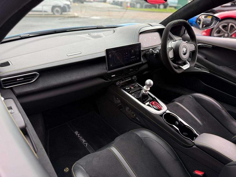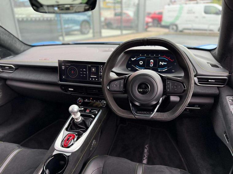 10.25" touchscreen MMI, 12.3" TFT supervision cluster display, Apple car play/Android Auto, Bluetooth system, Cruise control, Drive mode selector, eCall emergency call system, Embedded navigation system, Hydraulic PAS, Rear parking sensors, Limited slip differential, DAB Digital radio, KEF premium branded 10 channel audo (340w), USB port, Automatic lights, Daytime running lights, Door mirror memory, First Edition badges, LED headlamps, Lotus sill kick plates, Metallic paint, Power folding and heated door mirrors, Rear boot, Rear LED lights, Third brake light, Welcome home lighting, 12 way electrically adjustable front seats with driver's memory function, 12V Accessory socket, Centre console armrest, Cup holders, Front head restraints, Heated seats, Height/reach adjustable steering column, Illuminated passenger vanity mirror, Open gear change mechanism with mesh grille, Premium black Lotus branded driver and passenger footwell over mats, Satin chrome interior trim finishers, Single front passenger seat, Single zone air conditioning, Stowage - door bin, glovebox, centre console, White ambient lighting, Convenience pack - Emira, Lotus drivers pack - Emira, Lower black pack - Emira, 3 point seatbelts, Branded brake calipers, EBA, Two piece brake discs, Tyre pressure monitoring system, Immobiliser, Keyless start,