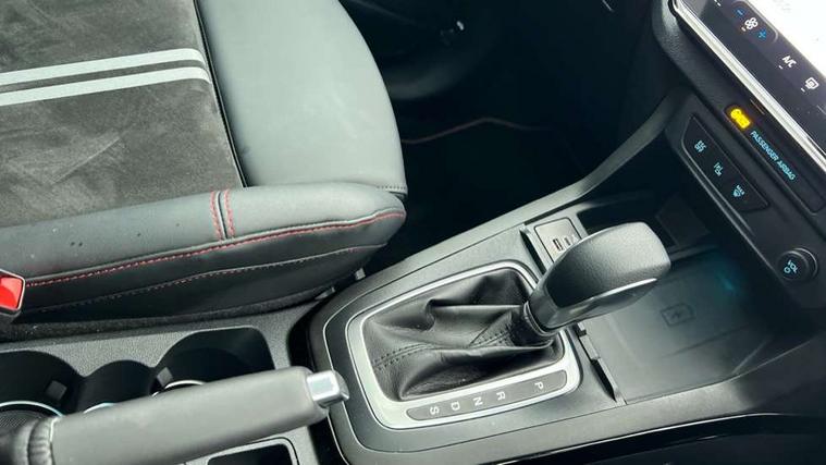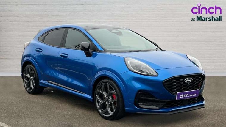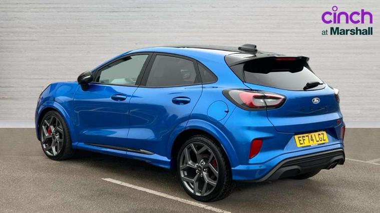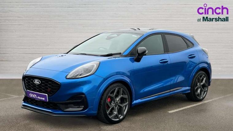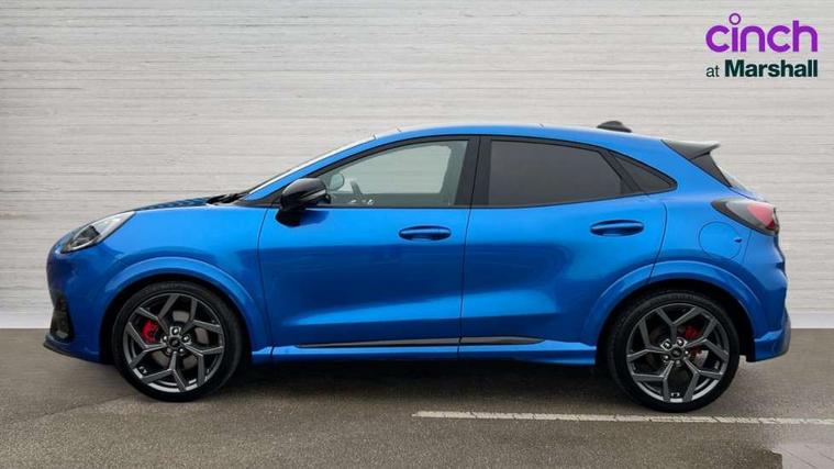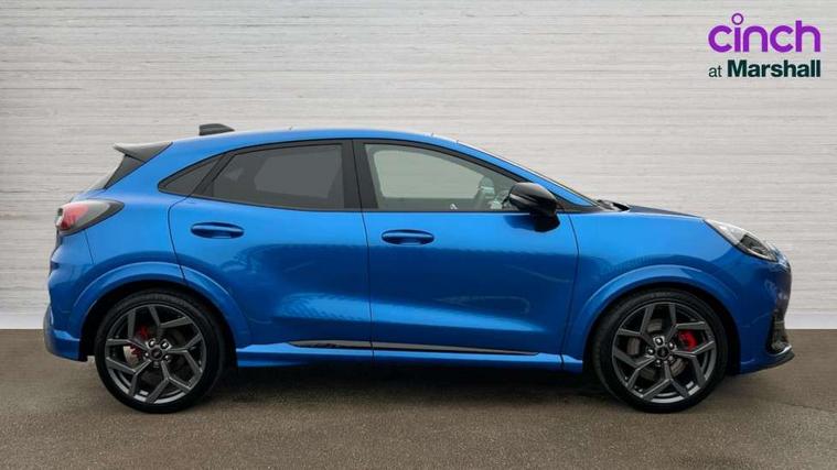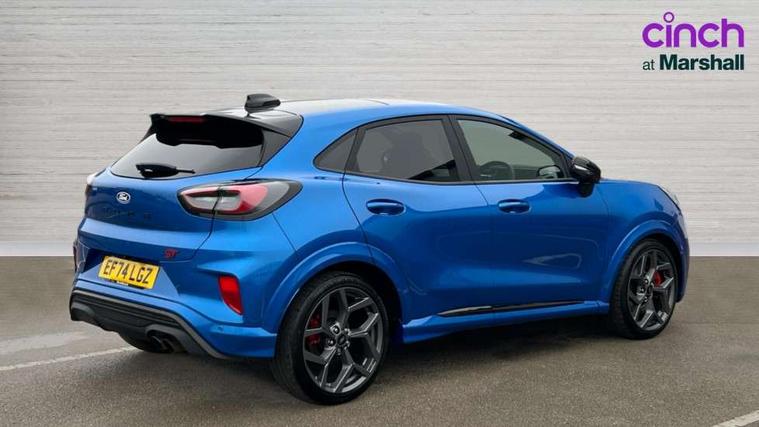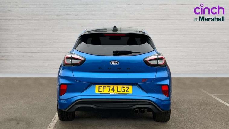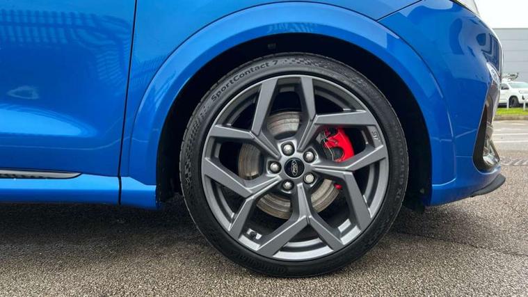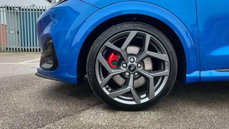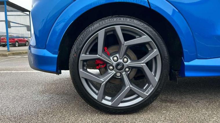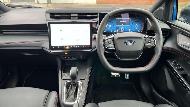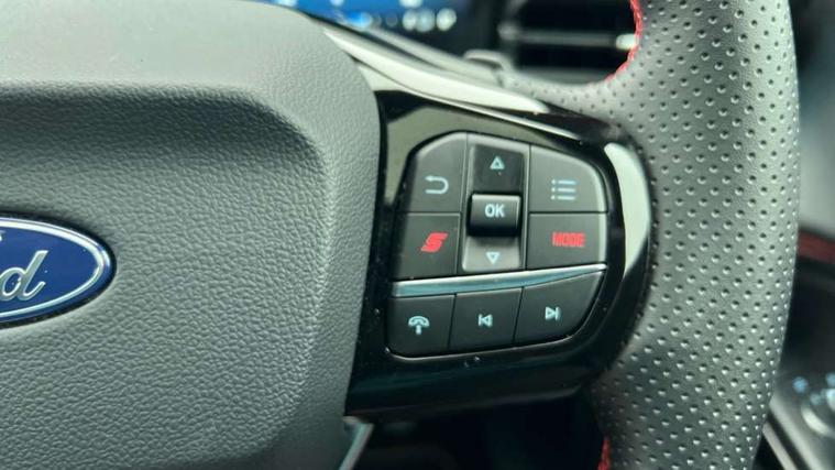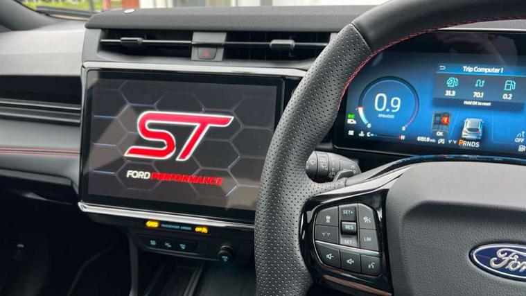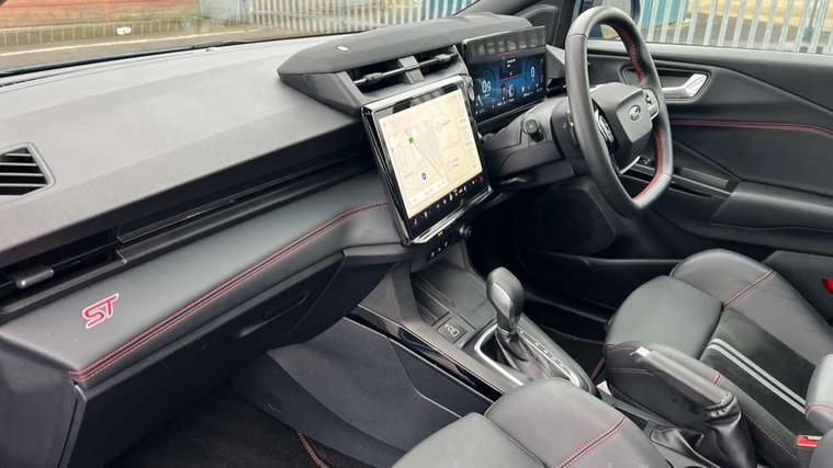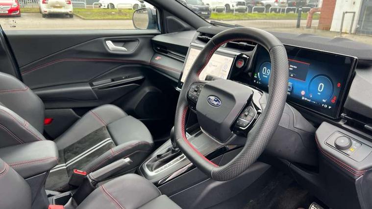 Driver impairment monitor, Emergency call service, Ford easy fuel, Full digital 12.8" instrument cluster, Lane keeping aid with lane departure warning, Power assist steering, Power lift tailgate, Selectable drive modes (normal, sport, eco, track), Speed sign recognition, ST suspension, 12" landscape touchscreen display with wireless apple car play and android auto premium B&O audio system with 10 speakers, Ford pass connect and emergency assistance, Ford SYNC4 with connected navigation, Automatic headlights with rain sensing wipers and auto high beam, Front fog lamps, Glare-free matrix LED headlamps, LED daytime running lights, LED rear lamps, LED third brake light, Power foldable heated door mirrors with puddle lamps and puma logo protection, Quickclear heated windscreen, Rear privacy glass, Rear side wing doors, Rear wiper, Unique ST body styling kit including wing mirrors and Ford Performance embossed splitter, 3 seat bench in 2nd row, Centre console with armrest and stowage, Electronic automatic temperature control (EATC), Ford megabox extended bootspace, Ford Performance seats premium synthetic leather upholstery, Front and rear head restraints, Front floor mats, Manual 6 way driver seat adjust with lumbar adjustment, Manual 6 way passenger seat with lumbar seat adjustment, Single front passenger seat, ST flat bottomed steering wheel with metal grey stitching, Driver assistance pack with blind spot information system - Puma for automatic transmission, Winter pack - Puma, 3 rear seatbelts, Child safety lock, Electronic stability control (ESC) and hill start assist, Pre-collision assist with autonomous emergency braking, pedestrian/cyclist detection & post-collision braking, Red brake calipers, Tyre pressure monitoring system (TPMS), Keyless entry and power start button, Keyless start and wireless charger, Thatcham alarm, 19" alloy wheels with magnetite dark finish, Tyre inflation kit,