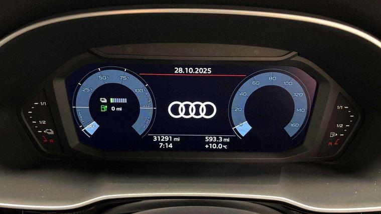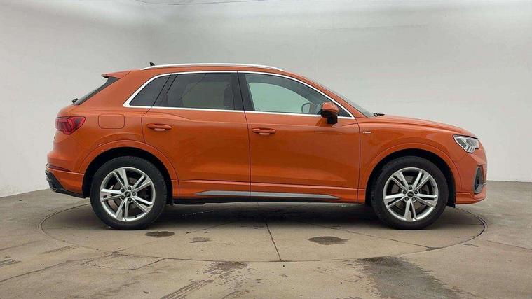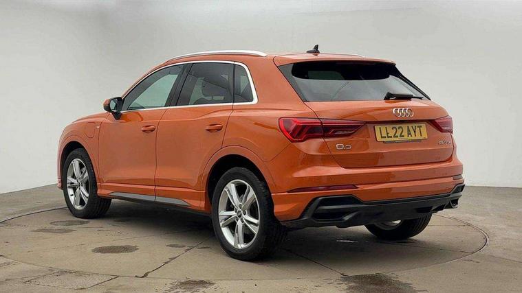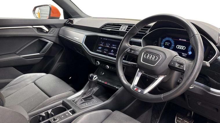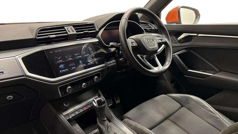 Amazon alexa Integration, Audi drive select, Audi lane departure warning, Audi Virtual Cockpit - 10.25" display, Bluetooth interface, Camera based traffic sign recognition, Legal emergency call, MMI Navigation Plus with high resolution 10.1 inch touchscreen colour display, Power operated tailgate, Progressive steering, Service interval indicator, Smartphone interface includes wireless Apple carplay/Android Auto, Start stop system with recuperation, Voice control system with natural language interaction, 3 pin 10 amp domestic charging cable, 3.6 kw On-board charger, Type 2 mode 3 32 amp charging cable, Type 2 socket for AC charging, 2 USB-C ports with charge and data functions, 6 passive loudspeakers, DAB digital radio module, Acoustic windscreen, Aluminium roof rails, Aluminium window trim, Auto dimming frameless rear view mirror, Body coloured bumpers, Electrically folding, adjustable and heated door mirrors with integrated LED side indicators and kerb view function for passenger side, Front and rear electric windows, Front fog lights, Front side air inlets in matt platinum grey, Front spoiler blade in matt platinum grey, Grille vertical bars in aluminium silver/Matt, High gloss black finish B and C pillars, LED headlights with LED daytime running lights, LED rear lights, LED third brake light, Privacy glass dark tinted rear and rear-side windows (from B-pillar backwards), Rain and light sensors, Rear diffuser grille in grained matt black, Rear diffuser strip in matt titanium black, Rear side wing doors, Rear wiper, S line badges on front wings, S Line front and rear bumpers, Side skirt insert in matt Platinium grey, Titanium black radiator grille, Variable front intermittent wipers, 12V socket in rear centre console, 3 seat bench in 2nd row, 40:20:40 folding with manual adjustment for 60:40 forwards/backwards position and backrest angle, Adjustable rear seat bench/backrest with centre armrest and cupholder, Black cloth headlining, Dual zone electronic climate control, Front and rear black floor mats with contrast stitching in rock grey, Front and rear headrests, Front and rear roof module including reading lights, Front centre armrest, Glove compartment lighting, Height and reach adjustable steering wheel, Illuminated door sill trims with S logo, ISOFIX child seat mounting for front passenger with airbag deactivation and outer rear seat including top tether attachment point for outer rear seats, Luggage compartment light, Manual front seats with height adjustment, Perforated leather gearknob, Single front passenger seat, Stainless steel luggage compartment sill finisher, Stainless steel pedals, Non smoking pack - Q3, 3x3 point rear seatbelts, 6 airbags - Driver, front passenger, curtain and side windows, Audi pre-sense front with pedestrain and cyclist recognition, Electromechanical parking brake, Electronic stabilisation control including ABS, ASR and EDL, Front seatbelt reminder, Hill descent control, Hill hold assist, Manual child lock in rear doors, Pre sense basic, Seatbelt monitoring, Tyre pressure warning, Warning triangle and first aid kit, Anti theft alarm, Anti theft wheel bolts, Immobiliser, Remote central locking, Dark matt brushed aluminium inlay, Detail dashboard around MMI touch colour display in glass look, black with surround in aluminium look, Leatherette door armrest, Tool kit, Tyre repair kit,