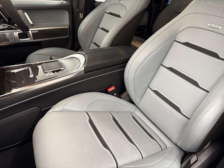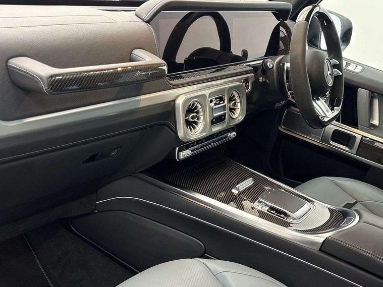360 degree parking camera, Active parking assist with PARKTRONIC, AMG instrument cluster with dual bonded 12.3" widescreen displays, AMG specific IWC design analogue clock, Attention assist, Bluetooth interface for hands free telephone, Communications module (LTE), MBUX augmented reality for navigation, Mercedes connect me, Mercedes-Benz emergency call, PAS, Passive person presence reminder, Remote Services Premium, Service indicator (ASSYST), Smartphone integration with Apple CarPlay and Android auto, Trip computer, Widescreen cockpit with dual bonded 12.3" widescreen displays, Wireless charging, 4MATIC permanent four wheel drive, AMG Active Ride Control with hydraulic roll stabilisation, AMG SPEEDSHIFT 9G-TRONIC sports transmission, Differential lock, Low range gear reduction (Electronically selectable while driving), Petrol Particulate Filter, Aux-in socket, Burmester 3D surround sound system, DAB digital radio tuner, MBUX multimedia system, Sound personalisation, 3rd brake light, Adaptive highbeam assist plus - automatic low high beam switching, AMG bodystyling with exclusive Mercedes AMG G 63 front aprons with cooling air intakes and AMG flared wheel arches in vehicle colour, AMG carbon-fibre exterior mirror housings, AMG Crest on engine hood, AMG Crest projection in outside mirror, AMG fuel cap, AMG specific radiator grille, AMG-specific radiator shell in dark chrome, Automatic headlamp activation, Automatically dimming rear view mirror, Carbon fibre spare wheel cover, Dark tinted heat insulated glass, Darkened indicators, tail lights and headlights, Door mirrors - Electrically adjustable/heated/integrated indicators, front area lighting and automatically dimming driver's mirror, Electric sunroof sliding, with one-touch opening, Exterior protective moulding with decorative inlay in carbon design, Front and rear bumper inserts in carbon fibre, Front and rear electric windows, Front simulated underguard in carbon fibre, Heated windscreen, LED daytime running lights, Memory function for exterior mirrors, Multibeam LED headlights with anti-dazzle feature, Privacy glass - Dark glass from B-pillar backwards, Rain sensor windscreen wipers, Rear side wing doors, Rear simulated underguard in carbon fibre, Rear wiper, Tail lights featuring LED technology, Towbar, Trailer coupling with ESP trailer stabilisation, Transparent Bonnet, V8 BITURBO lettering, 1/3 to 2/3 split folding rear seats, 12V socket in centre console, rear and load compartment, 2 cup holders in front and rear, 3 seat bench in 2nd row, Ambient lighting with 64 colours and projection of brand logo, AMG floor mats with AMG lettering, AMG Performance steering wheel in carbon fibre/MICROCUT microfibre, AMG sports seats, AMG steering wheel buttons, Centre armrest between front seats with integrated stowage compartment, Cushion length adjustment with gapless cushion, Designo dinamica microfibre roof lining in Black, Electrically adjustable steering column, with automatic adjustment for entry/exit, Front head restraints, Heated rear seats, Heated steering wheel, Illuminated AMG door sill panels with AMG lettering at front and rear, Ionisation of interior air including fine particle activated charcoal filter system, Luggage compartment cover, Memory function for front seats, Memory function for head restraints and steering wheel, Partition net, Rear head restraints, Single front passenger seat, THERMOTRONIC automatic climate control system with 3 climate zones and 3 climate styles - Medium, Diffuse and Focused, Stowage space pack - G class, 3x3 point rear seatbelts, ABS with Brake Assist, Airbags - windowbags, AMG high performance braking system with internally ventilated and perforated brake discs, Driver/Front Passenger airbags, Electronic four wheel traction control, ESP with ASR, Front side airbags, Hill start assist, i-Size child seat attachment system for the outer rear seats, PRE-SAFE system for preventive occupant protection, Rear door child safety locks, Rear side airbags, Red painted AMG brake calipers, Seat belts, 3-point design in black, Seatbelt pretensioners, Tyre pressure monitoring system, Anti-theft alarm system/interior protection with tow-away protection and interior monitoring systems, Dashcam, Guard 360 degree vehicle protection plus, Immobiliser, Keyless Go starting function, AMG carbon fibre trim, Full size spare wheel,