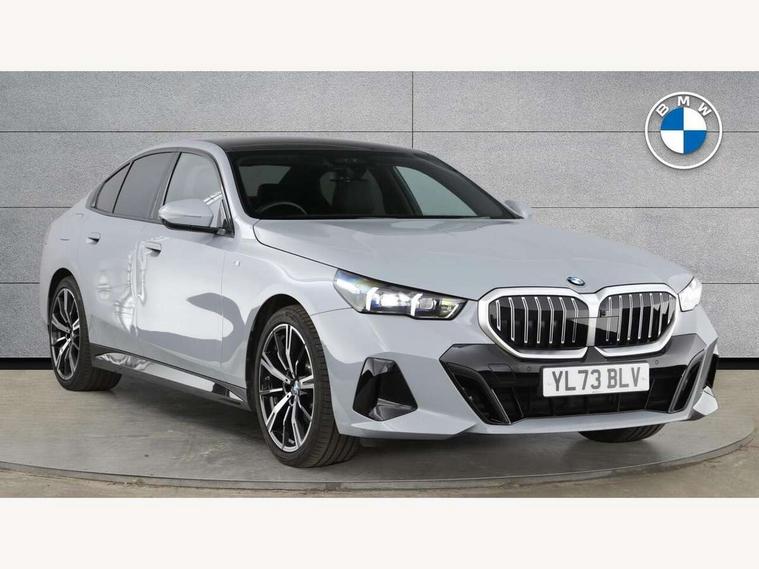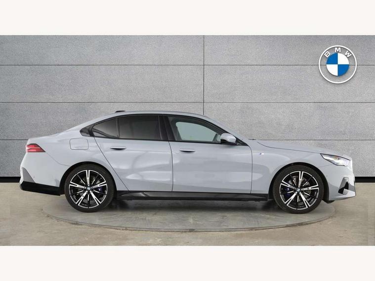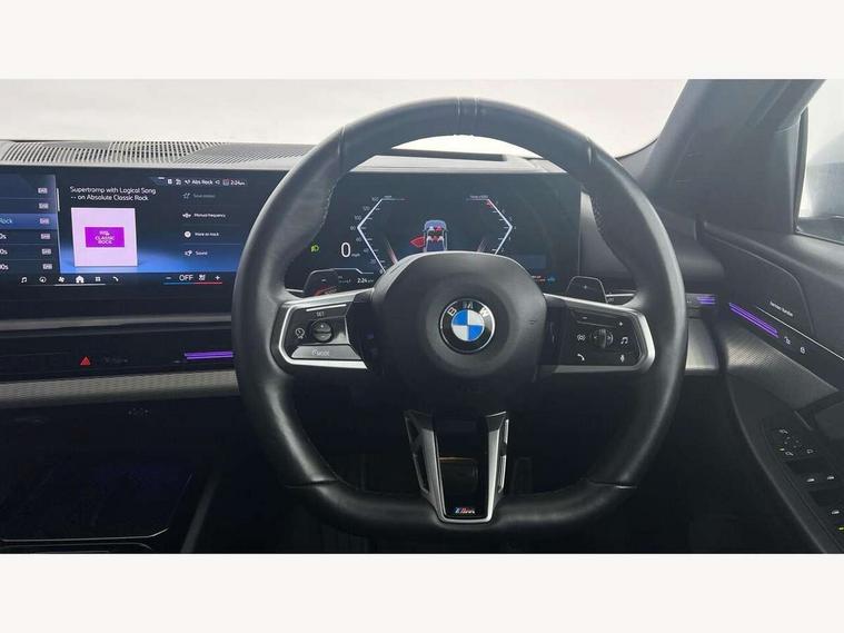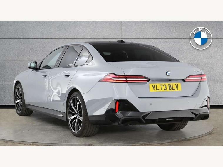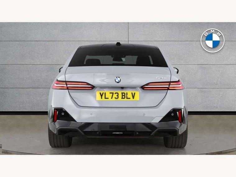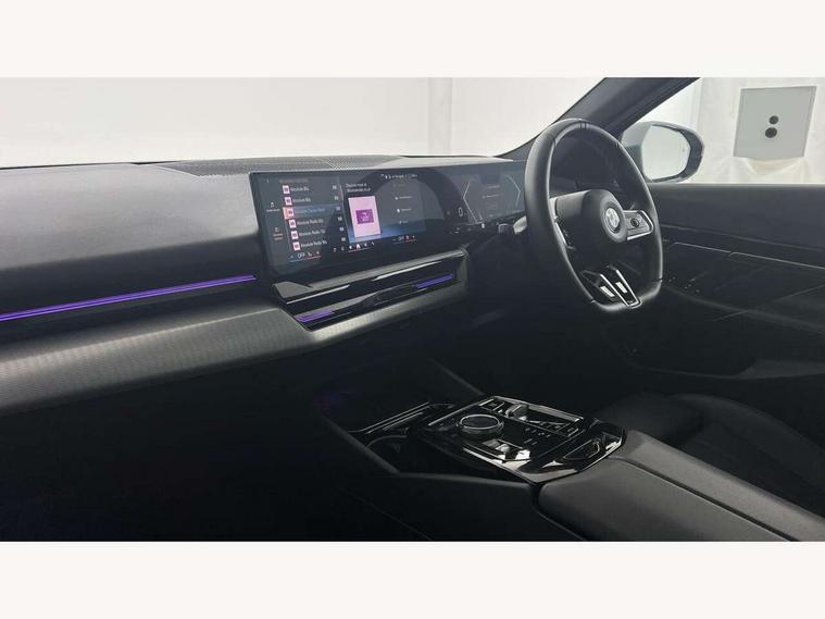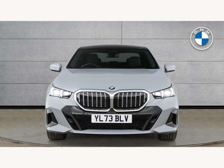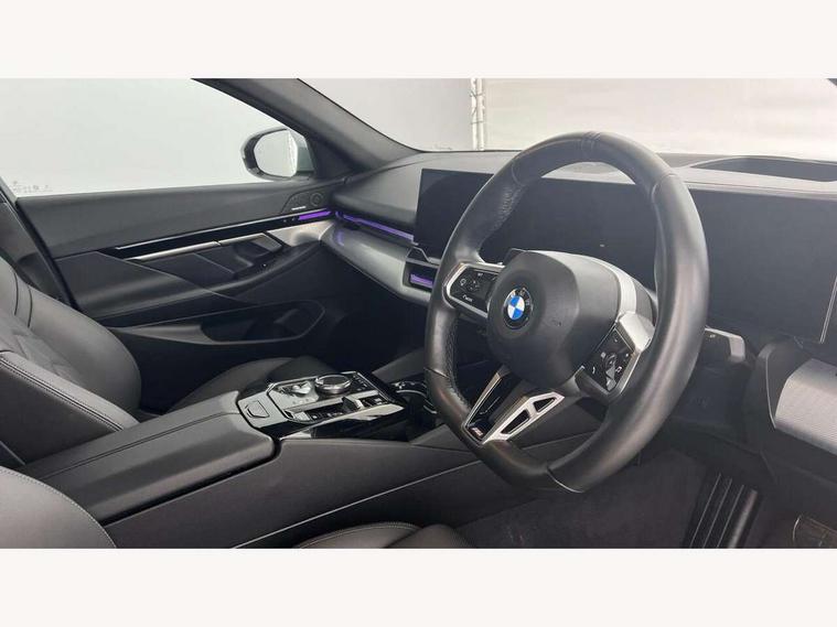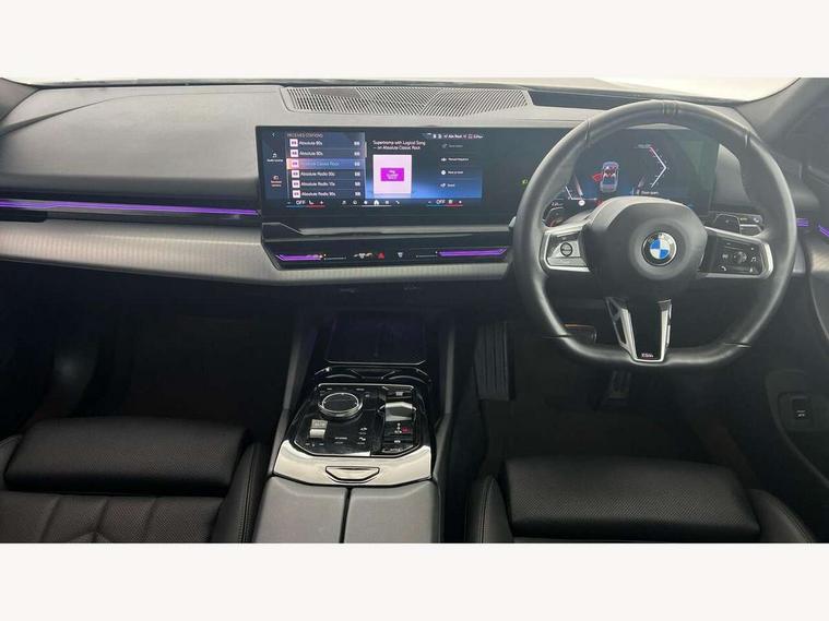 BMW ConnectedDrive online services, BMW legal emergency call, BMW Teleservices, Brake pad wear indicator, Cruise control with brake assist, Multifunctional instrument panel, Oil sensor for level and grade, On board computer inc. average speed, fuel consumption, liquid crystal Info display, journey computer, outside temperature display, personal profile, On-board diagnosis - OBD, PAS, Powered by Operating System 7.0, Run flat indicator, Service interval indicator, Stop/start button, 8 speed automatic steptronic transmission with gearshift paddles, M sport suspension, DAB tuner, Personal eSim, Acoustic glazing, Adaptive LED headlights with high beam assist, Automatic cornering lights, Automatic windscreen wipers and automatic headlight, BMW selective beam, Body colour door handles, Body coloured bumpers, Dynamic brake lights with LED technology, Electric adjustable door mirrors, Electric front and rear windows with fingertip open/close + anti-trap facility and comfort closing function, Follow me home headlight function, Heated windscreen washer jets, LED daytime running lights, LED third brake light, Rear boot, Rear side wing doors, 2 zone automatic air conditioning, 3 seat bench in 2nd row, 3 spoke leather M steering wheel in BMW M specific design with M badge, 40/20/40 split folding rear seats with backrest, Armrest - front and rear integrated door trim, centre console includes storage compartment, rear centre includes 2 cupholders, Child seat ISOFIX attachment with rear outer seats includes top tether, Electric adjustable steering column, Electrically adjustable lumbar support for driver and front passenger, Front sport seats, Heated driver and front passenger seats, M Anthracite headlining, M Sport pedal covers in stainless steel, Partially electric front seat adjustment, Rear headrests, Single front passenger seat, Through load system, Velour floormats, Wireless charging tray, Ambient lighting pack - 5 Series/I5, Connected package professional - 5 Series/I5, Driving assistance pack - 5 Series/I5, Expanded exterior mirror package - 5 series/I5, M high gloss shadow line pack - 5 Series/ I5, M Sport exterior styling pack - 5 Series/I5, 3 rear three point seatbelts, Active protection, Anti-lock braking system (ABS), Brake assist, Brake energy regeneration, Cornering brake control (CBC), Crash sensor activating central locking release, hazard warning lights, fuel cut off and interior lighting, Driver and front passenger airbags, Driver central airbag, Driver/front passenger side airbags, DSC - Dynamic Stability Control, Dynamic brake control, Dynamic Traction Control - DTC, Electromechanical parking brake with automatic drive away release and auto hold function, Electronic brake force distribution, Engine drag torque control, Front and rear brake discs with interior ventilation, Front and rear curtain airbags, Front head restraints with anti-whiplash, Head airbags for first and second row seats, Hill start assist, Locking of doors after driving off, M Sport brake in dark blue metallic painted brake callipers with M designation, Mechanical child proof lock on rear doors, PC iBrake PostCrash approach control warning with light braking function, Side impact protection, Trailer stability control, Two tone horn, Tyre pressure monitoring system, Warning triangle and first aid kit, Alarm system, BMW digital key, Locking wheel bolts, Tyre repair kit,