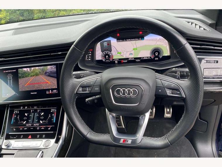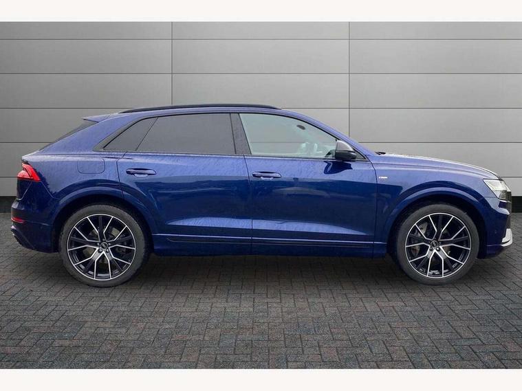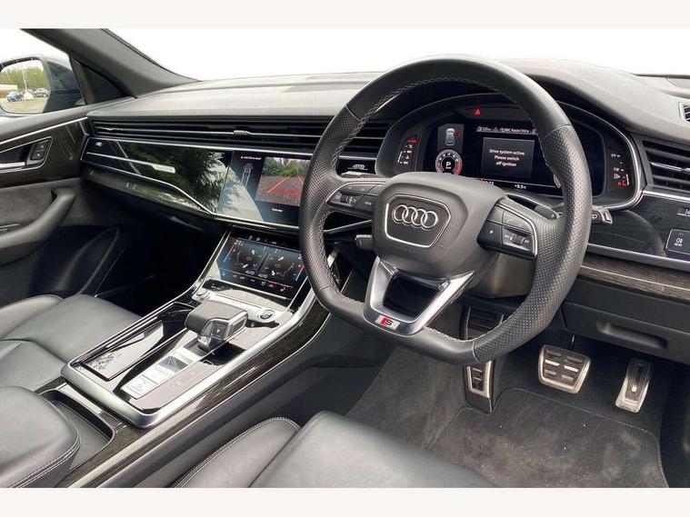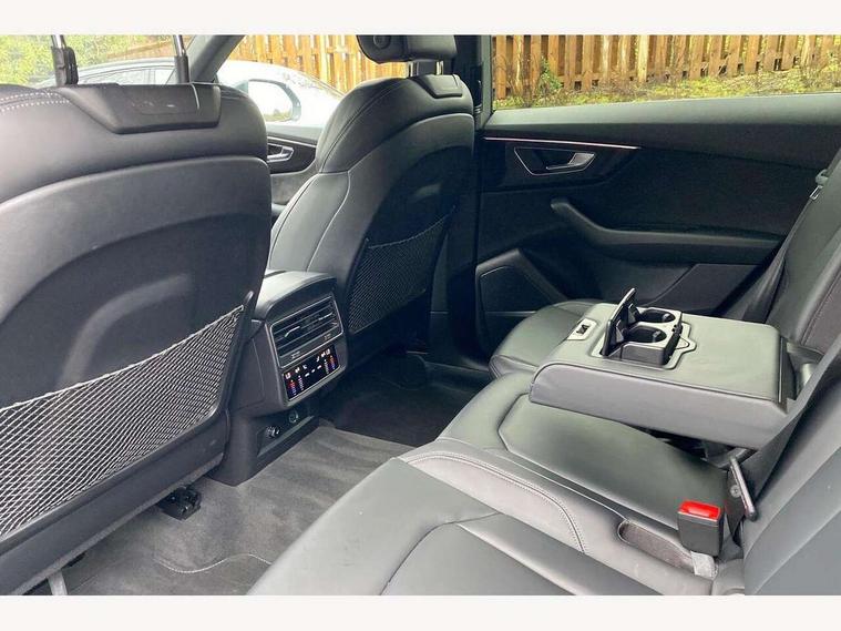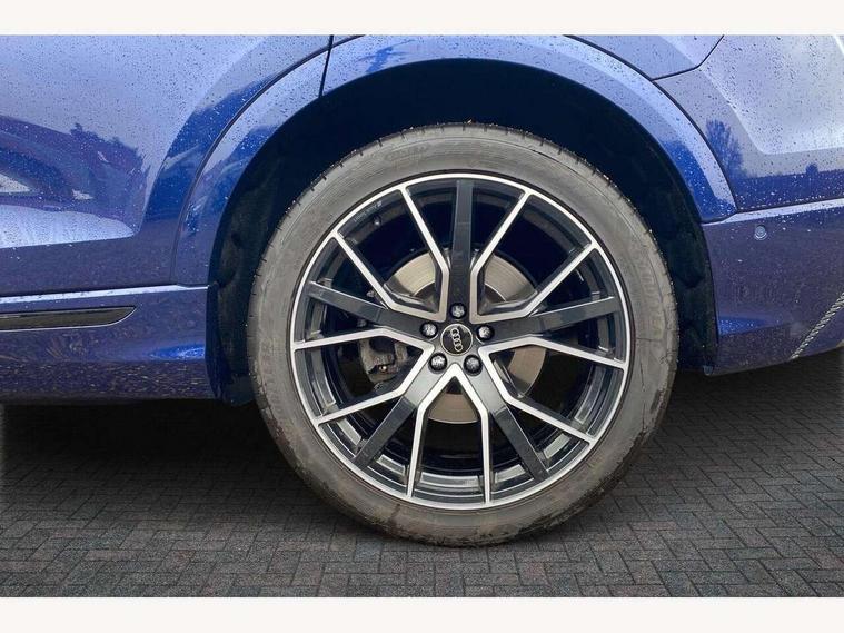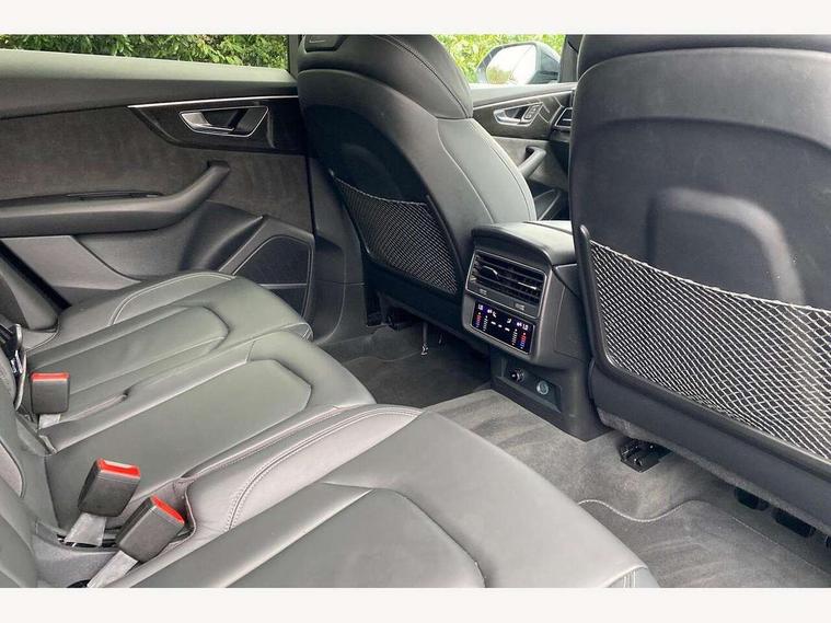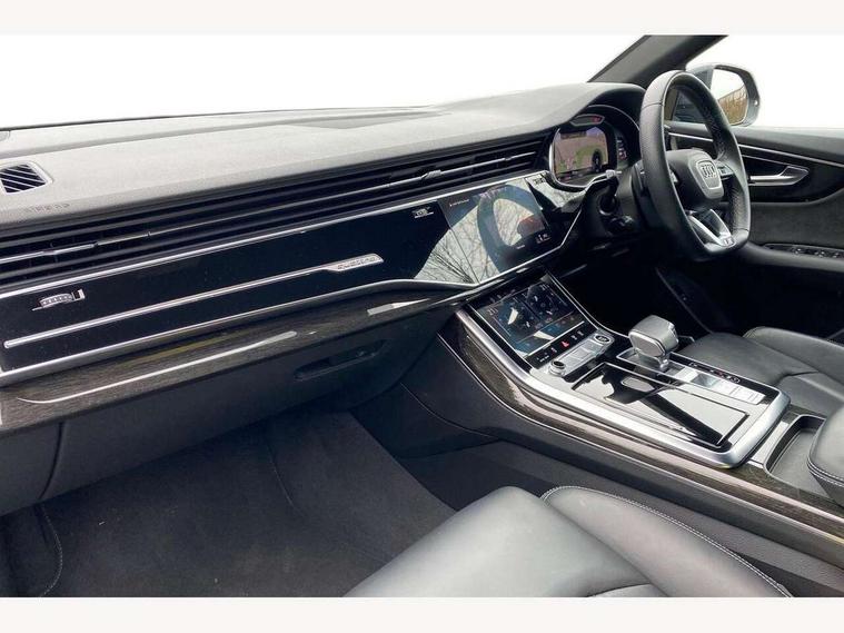 10.1" and 8.6" Dual colour touchscreens, Audi connect safety and service (e-call), Audi connect with Amazon Alexa Integration, Audi drive select, Audi parking system plus includes 360 degree display with front and rear sensors, Audi smartphone interface includes wireless Apple carplay/Android Auto, Audi virtual cockpit - 12.3" high resolution LCD display with fully customisable instrument cluster, Automatic start/stop system, Electro-mechanical PAS, Low washer fluid indicator, MMI - Multi Media Interface control system, MMI navigation plus with MMI touch, Natural voice recognition, On board computer, Operating buttons in black, glass look with haptic feedback, Power operated tailgate, Rear view camera, Service interval indicator, 48V Mild hybrid technology, 85 litre fuel tank, Adaptive sport air suspension, Quattro all wheel drive with self locking centre differential, Audi music interface with 2 USB ports with charge and data functions, Audi sound system with 6 channel amplifier, 180 watt amplifying capacity and 10 loudspeakers including subwoofer, Aux-in socket, DAB Digital radio, 3rd brake light, Acoustic windscreen, Audi HD Matrix LED headlights with dynamic front and rear indicators, Auto dimming frameless rear view mirror, Coming/leaving home lighting function, Electric front+rear windows, Electrically folding auto dimming/adjustable/heated door mirrors with memory function, LED side indicators and kerb view function for passenger side, Headlight washers, Heat insulating glass in windshield, LED signature daytime running lights, Platinum grey front spoiler lip and diffuser insert, Privacy glass - dark tinted rear and rear side windows from B-pillar backwards, Rain and light sensors, Rear side wing doors, Rear wiper, 3 bench rear seats in 2nd row, 4 zone deluxe automatic climate control, 4-way lumbar support for front seats, 40:20:40 split folding rear bench seat, Black cloth headlining, Comfort front centre armrest, Driver seat memory function, Electrically adjustable front seats, Front head restraints, Front/rear floor mats, Heated front seats, ISOFIX child seat mounting for front passenger seat and 2 outer rear seats with top tether child seat mounting for all 3 rear seats, LED interior ambient lighting, Luggage compartment sill protection in stainless steel, Rear centre armrest with 2 cupholders, Rear headrests, Single front passenger seat, Stainless steel pedals, Sunvisors with illuminated vanity mirrors, Tool kit, Titanium Black Styling Pack - Q8, 3 point seatbelts on all seats, Audi pre sense front, Child locks on rear doors, Driver and front passenger, front side and curtain airbags, Electromechanical parking brake, Electronic Stability Control (ESC) including ABS, ASR and EDL, Front passenger airbag deactivation, Hill descent control, Hill hold assist, Predictive pedestrian protection, Seatbelt monitoring, Traction control, Tyre pressure loss indicator, Warning triangle and first aid kit, Anti theft alarm with tow away protection, Anti-theft wheel bolts and wheel loosening detection, Immobiliser, Keyless go with remote central locking, Polished oak trim with grey finished, Tyre repair kit,