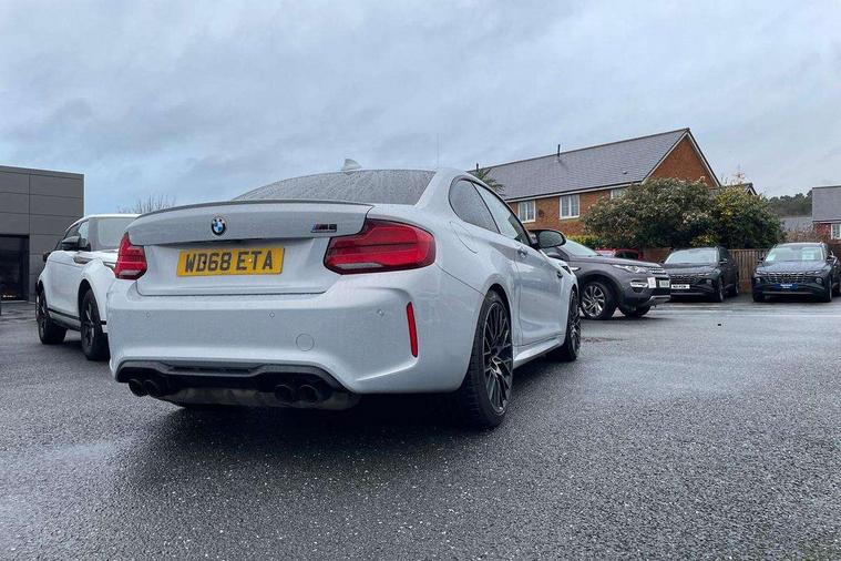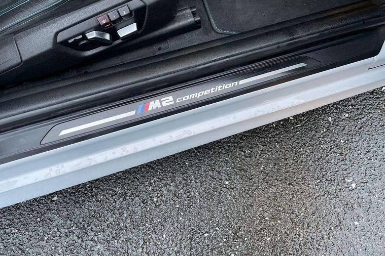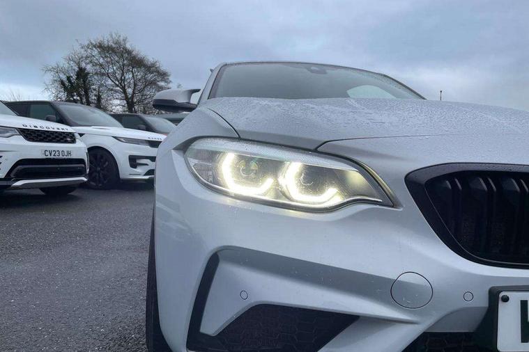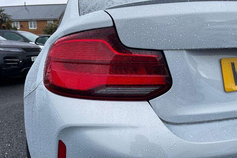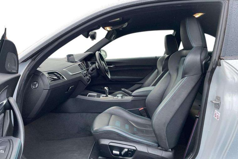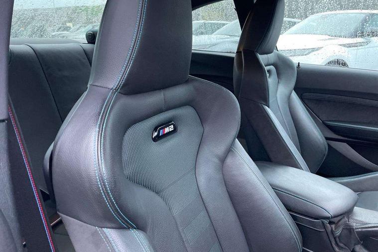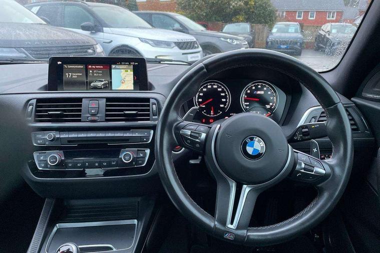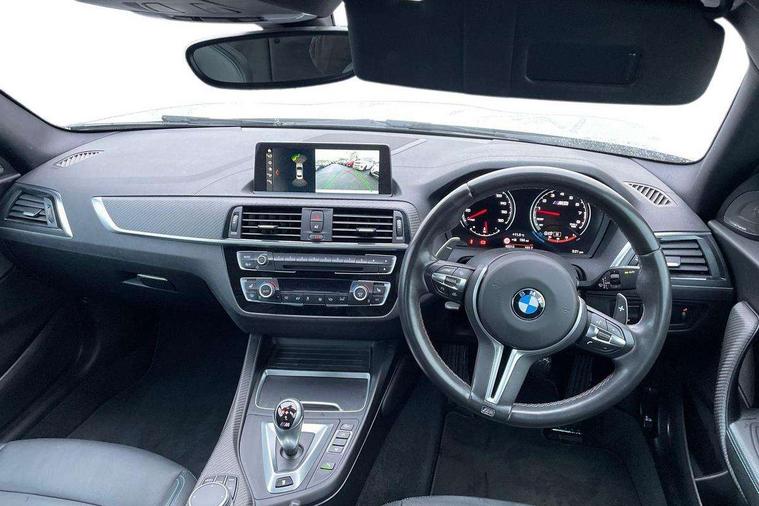 Auto start-stop, BMW Online services, BMW remote services, BMW Teleservices, Cruise control with braking function, Door/boot open warning, Front and rear Brake pad wear indicator, Front/rear Parking distance control, Instrument cluster with speedometer with miles per hour read out, tachometer and fuel gauge, Lights on warning by audio warning signal when ignition is switched off, M Servotronic power steering, Oil sensor for level and grade, warning by check control system, Oil temperature display via on board computer in instrument cluster, On board computer - average speed+fuel consumption, service interval, clock/date, odometer/trip meter, outside temperature display and ice warning, Optimum shift indicator, Personal Profile - automatic lock when driving away selectable, Real time traffic information, Speed limiter, Battery age recognition function, Drive performance control with ECO PRO comfort + sport mode, Engine cover with BMW roundel twin power turbo designation, M sport suspension, Oil dipstick, DAB Digital radio, 2 speed adjustable intermittent wipers with wash/wipe function, Automatic headlight beam throw control, Automatically dimming rear view mirror, Black chrome exhaust, Body colour bumpers, Body colour door handles, Body colour mirror caps, Body colour roof mouldings, Clear lenses direction indicator lights, Daytime driving lights, Direction indicator side lights integrated exterior mirrors, Dual dark chrome exhaust tailpipes, Dynamic brake lights, Electric windows - front and rear, with open/close fingertip control, anti-trap facility and comfort closing, Electrically adjustable and heated M specific exterior mirrors, Follow me home headlights, Front apron with large air inlets, Green tinted heat protection glazing, Headlight range control, Heated windscreen washer jets, High gloss black kidney grille with M double rod vertical slats and M2 badging, High gloss black M side strakes with M2 designation, High gloss shadow line, High level third brake light, LED rear lights, LED welcome home lights, M rear spoiler, M2 specific aerodynamic body styling with unique kidney grille, front bumper, rear bumper and side skirts, Rain sensor with automatic headlight activation, Rear bumper with high gloss black finish, Rear fog lights, Reversing light in rear light cluster, Shark fin roof aerial, Visible VIN plate, Welcome lighting, 12V power socket in centre console, 12V power socket in passenger footwell, 4 grab handles, Anthracite headlining, Anthracite Velour floor mats, Conditioned based service, Dakota leather upholstery, Driver and front passenger lumbar support, Folding rear seat head rests, Folding storage compartment with glasses holder + coin tray, Front and rear side armrests integrated into door trim, Front door sill finishers with M designation, Front door storage bins, Front head restraints, Front sliding armrest, Glove box handle with chrome surround, Isofix child seat for two outer rear seats, Leather gearknob, Leather handbrake lever, Luggage compartment access via BMW roundel, M multifunction nappa leather steering wheel, M Sports seats, Manually adjustment steering wheel column, Rear coat hooks, Rear folding head restraints, Storage compartment in rear centre console, Two cupholders with sliding cover and inlay mat, Two extra lashing eyes in luggage compartment, Interior comfort pack - 2 Series/M2, Media pack - Professional - 2 Series/M2, Active differential brake (ADB), electronic differential lock in DSC-OFF mode, Airbag - Front driver and passenger, front and rear head, front side, curtain head protection, manual deactivation of front passenger airbag possible, Anti lock braking system (ABS) with brake assist, Automatic Stability Control (ASC), Battery safety cut-off, BMW emergency call, Brake drying, Brake energy regeneration, Braking readiness, Cornering brake control (CBC), Crash sensor activating central locking release with hazard warning lights and interior lighting + battery safety cut-off, Dynamic brake control, Dynamic stability control + (DSC+), Dynamic Traction Control - DTC, Front pyrotechnic belt tensioners and belt force limiter, rear coaded belt buckles, Hill start assist, M dynamic mode, M Sport seatbelts, Seat belt security check for driver and front passenger, Side impact protection, Twin horns, Tyre pressure monitoring with 3 level warning strategy, Warning triangle and first aid kit, Central locking switch for all doors, fuel filler cap and luggage compartment, Check control system for monitoring of lights and door/luggage compartment open warning, Drive away door locking, Locking wheel bolts, Remote control including integrated key with blue insert, Thatcham category 1 alarm system with remote control and engine immobiliser, Carbon fibre interior trim with black high gloss finish, BMW mobility system, Reduced rolling resistance tyres,