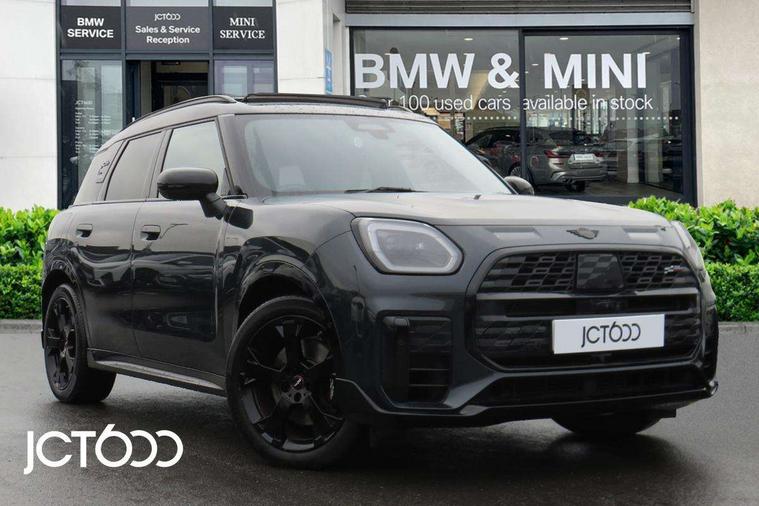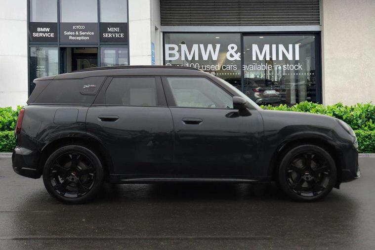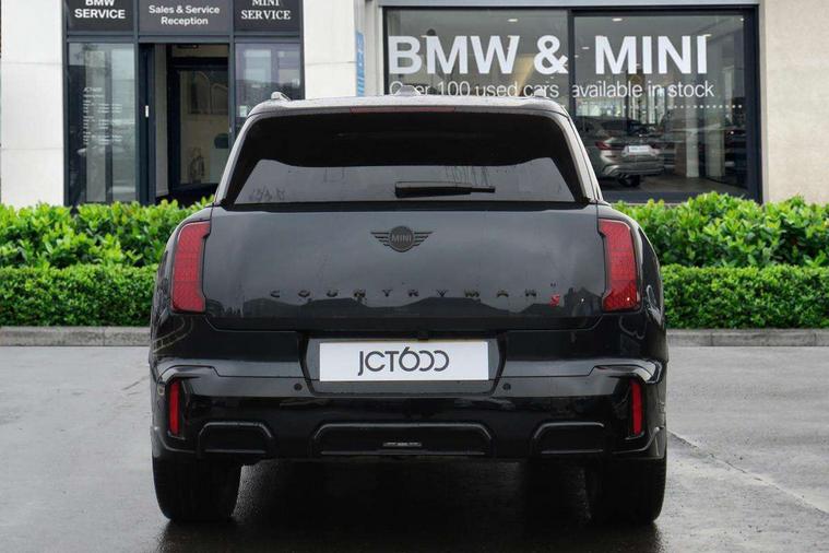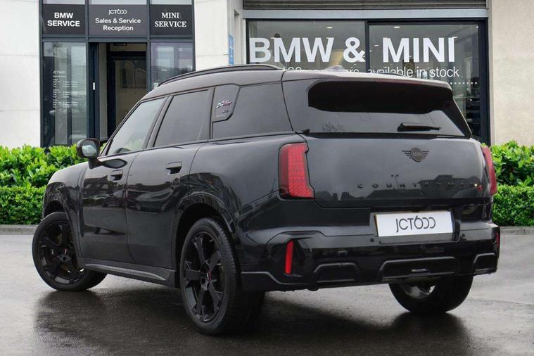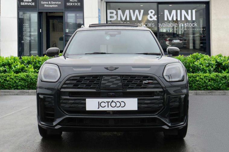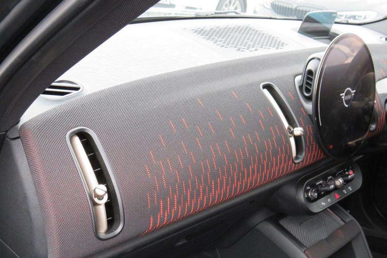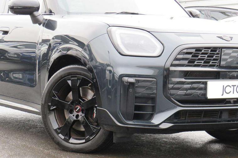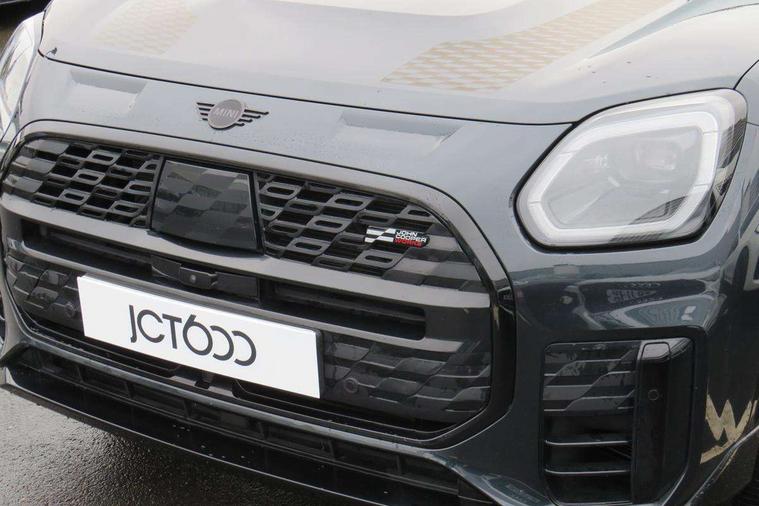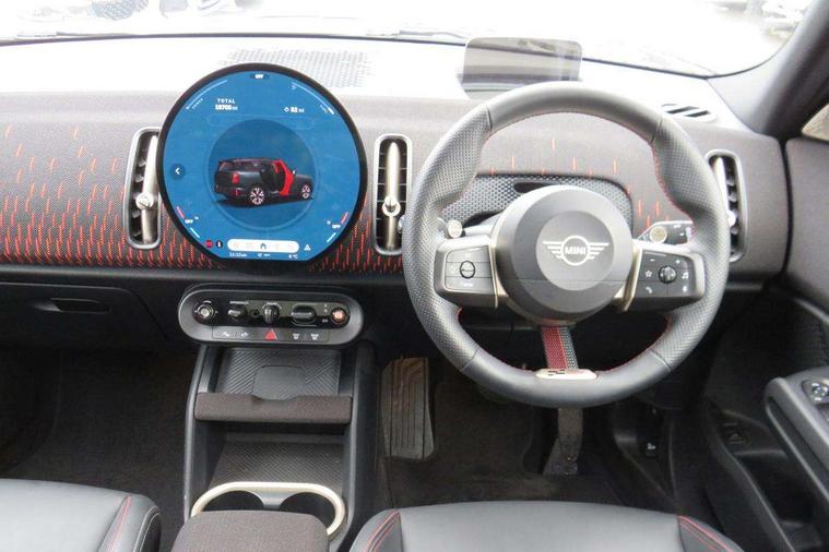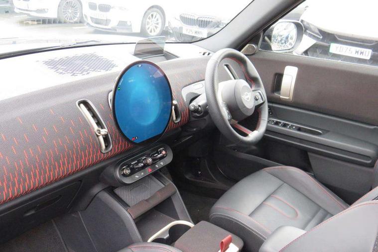 Bluetooth connection, Circular OLED Screen, Compatible mobile phone bluetooth with audio streaming, Cruise Control (DCC), Digital dashboard display, Driving Assistant Plus Preparation, E-call, Electro-mechanical speed dependant steering assistance, MINI Experience Modes, MINI Head up display, Mini navigation system, MINI TeleServices, Parking assistant in camera and ultrasound based assistance system, rear view camera, parking aid and distance control, Double clutch sports transmission, Larger capacity fuel tank, 6 speakers, DAB Digital radio, Auto tailgate, Electric adjustable heated door mirrors, Front and rear apron, Front and rear electric windows, Heated rear window, High beam assistant, High gloss hexagonal patterned grille surround, Interior rear-view mirror with automatic anti-dazzle function, LED daytime running lights, LED headlights with extended contents including Adaptable light signatures, LED rear lights, LED third brake light, Rain sensor with auto headlights, Rear roof spoiler with airblades, Rear side wing doors, Rear window wiper, Roof rails, 3 Seat sliding rear bench in 2nd row, 60/40 split rear bench seat, Anthracite headliner, Auto air conditioning, Driver and front passenger seat heating, Floor mats, Front armrest, Front headrests, Heated steering wheel, Height and length steering column adjustment, JCW Front sports seats, Lidded storage box in Black/Red knit, Luggage compartment separating net, Perforated Vescin steering wheel, Rear headrests, Seat adjustment for rear seats, Single front passenger seat, Sunvisors with vanity mirrors, Vescin/Cloth upholstery, Wireless charging tray, Interior and exterior mirror package - Mini Countryman, 3x3 point rear seat belts, 6 Airbags - front, side, head and seat belt tensioners, ABS, Brake calipers in Black with JCW badge, DSC - Dynamic Stability Control, Electronic handbrake, Electronic Stability Programme (ESP), Front ISOFIX (iSize), Hill hold assist, Hill start assist, JCW Sport Brakes, Manual rear child locks, Traction control, Tyre pressure monitoring system, Warning triangle, Alarm system with tilt sensor, monitoring doors, bonnet interior and tailgate, Auto drive away locking, Comfort access system, Deadlocking function, Electronic vehicle immobiliser, Locking wheel bolts, Remote control locking, Start/stop toggle with keyless go, JCW Black/Red dashboard knit, MINI Mobility Kit,