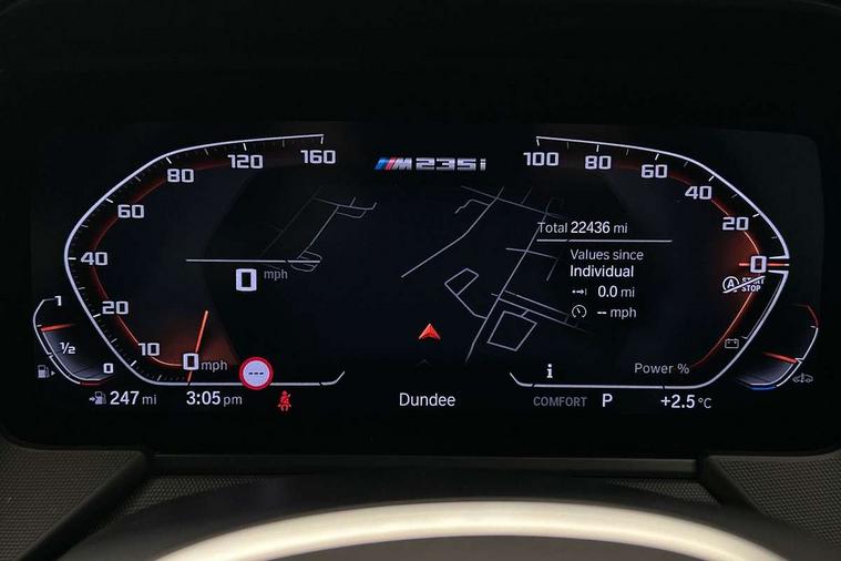 Active guard plus, Attentiveness assist, Auto start-stop, BMW ConnectedDrive online services, BMW Intelligent Personal Assistant, BMW Live Cockpit Professional with 10.25" high resolution instrument and control display, BMW Online services, BMW operating system with 7.0 mid interface, BMW Teleservices, Check Control warning system for monitoring of lights and door/luggage compartment open warning, Cruise control with braking function, Electro hydraulically controlled multi plate clutch in rear axle, Energy efficient operating strategy, iDrive controller with 7 short cut favourite buttons on centre console, Integrated navigation data with map data via USB +features such as 3D landmarks and micro city models, Integrated owners handbook, Intelligent voice assistant, Lane departure warning system, M Sport steering with M235i xDrive M performance specific settings, On board computer - average speed+fuel consumption, service interval, clock/date, odometer/trip meter, outside temperature display and ice warning, Optimum shift indicator, Personal Profile, Pull away assistant, Speed limiting function, 2 balance shafts, 8 speed sport automatic transmission with electronic selector lever, auto P function, coasting idle, race track, sport, gearchange display manual mode, Aluminium lightweight construction, BMW TwinPower twin-scroll Turbo four-cylinder petrol engine, Double VANOS, Drive performance control with ECO PRO comfort + sport mode, Electronic differential lock, Engine cover with M performance designation, High precision injection, Larger fuel tank capacity (50 litres), Launch control, M235i specific heavily de-throttled engine intake air guide, M235i specific high-performance cooling package, M235i specific larger turbocharger with integrated divert-air valve, Performance Control, Petrol Particulate Filter, Power transmission of front wheel drive on the rear axle via angle transmission on the front axle differential and two part cardan shaft, VALVETRONIC engine management, Variable, stepless and infinitely adjustable distribution of drive torque between the front and rear axles, xDrive intelligent all wheel drive with M235i specific reinforced components, 2x USB Type C ports (for charging and data transfer), 4G LTE Connectivity with hard wied 4G network sim card, DAB digital radio, MP3 players and RDS double tuner, Auto wipers, Automatically dimming rear view mirror, Body colour door handles, Direction indicator side lights integrated exterior mirrors, Electric windows - front and rear, with open/close fingertip control and trap release, Exterior mirrors - electrically folding with anti-dazzle, Fading support, Follow me home headlights, Front and rear bumper system with replaceable deformation elements, Front door sill finishers in black plastic with M235i designation, Heated, electrically adjustable exterior mirror aspheric on driver side, convex on passenger side, High gloss black B pillar finish, High gloss shadow line exterior trim, High level third brake light, LED daytime running lights, Lightweight engineering, M Performance exhaust system with valve control and minimised exhaust back pressure, M rear spoiler, Model designation on right side of tailgate includes xDrive designation onleft handside for M235i xDrive, Preparation for high beam assistant, Rain sensor with automatic headlight activation, Rear boot, Rear fog lights, Rear side wing doors, Reinforced crank drive, new pistons and adapted con rods, Reversing light in rear light cluster, Welcome lighting, 12V power socket in centre console, 2 cupholders in front centre console, 3 rear seat head restraints, 3 rear seats, 3 spoke M sports design leather steering wheel finished in nappa leather with specific M badge, Additional under floor storage in luggage compartment, Anthracite finished floor mats with contrasting surround, Anthracite headlining, Automatic two zone climate control air conditioning, Child seat ISOFIX attachment for two outer rear seats and front passenger seat with anchorage points, Conditioned based service, Driver and front passenger seat heating, Front and rear door pockets including bottle trays, Front and rear side armrests integrated into door trim, Front armrest foldable with integrated storage compartment, Front centre interior light over interior mirror and rear centre automatic interior light when door is opened/ignition switched off or via remote key, Front head restraints, Front M Sport seats, Front passenger seat, Glove compartment, Glovebox with light, Luggage compartment lighting, Manually adjustment steering wheel column, Multi-function controls for steering wheel, Shift-by-wire selector shift, Steering wheel paddles, Sun visors with vanity mirrors and insert tab, Through loading system with 40/20/40 split folding rear seat, Two lashing eyes, Additional interior lighting pack - 2 Series Gran Coupe, Connected pack professional - 2 Series Gran Coupe, Extended storage pack - 2 Series Gran Coupe, M Sport exterior styling aerodynamics pack - 2 Series Gran Coupe 235i, 2 tone horn, Airbag - Front driver and passenger, front and rear head, front side, curtain head protection, manual deactivation of front passenger airbag possible, Anti lock braking system (ABS) with cornering brake control, BMW emergency call, Brake drying, Braking readiness, City braking function, Crash sensor activating of airbags, Unlocking doors, hazard warning lights, interior light, safety battery terminal, Dynamic stability control + (DSC+), Dynamic Traction Control - DTC, Electrically operated hand brake, Integrated torsen mechanical limited slip differential on front axle, M Sport braking system in blue high gloss + blue painted brake calipers with M designation, M sport seatbelt, Rear brake discs, Rear child proof door locks, Seat belt security check for driver and front passenger, Seatbelt warning, Side impact protection, Three point seat belts on all seats including front belt stopper, pyrotechnic belt tensioners and belt forc
