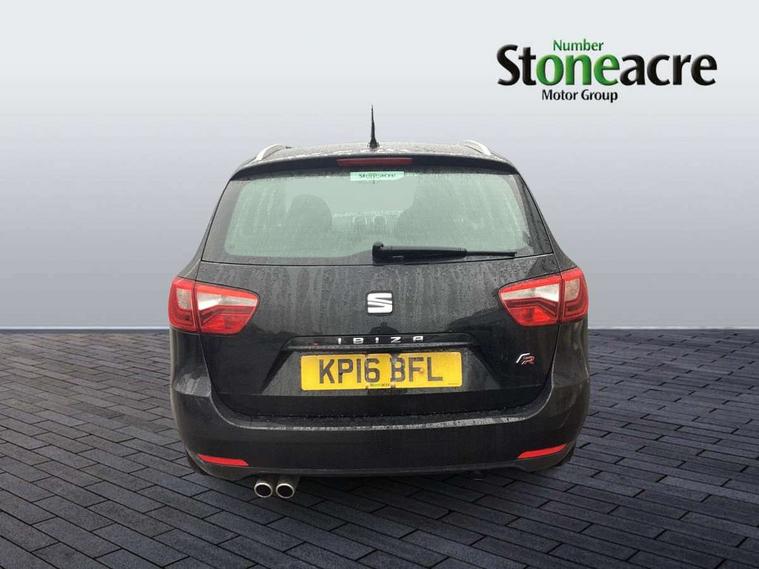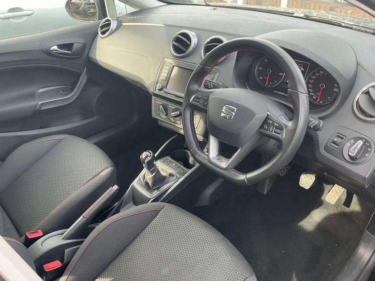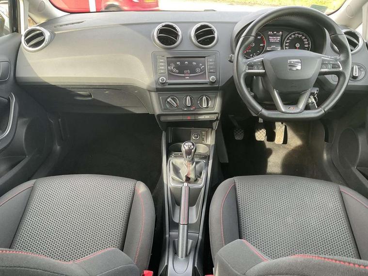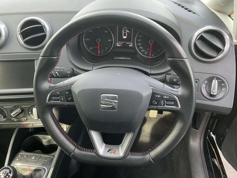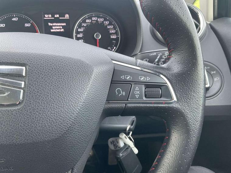 'Lights On' Reminder warning buzzer, Bluetooth system, Digital clock, Low fuel warning light, Outside temperature gauge, Satellite navigation system, SEAT logo boot release, Service interval indicator, Speed sensitive power steering, Trip computer, Diesel particulate filter, Sports suspension, XDS electronic differential lock, 6 speakers, Auxiliary input socket, Digital Audio Broadcast (DAB) Tuner, Steering column with mounted audio controls, Auto dimming rear view mirror, Automatic headlights, Automatic rain sensing wipers, Body colour door handles, Chrome roof rails, Coming home headlight function, Cornering front fog lights, Electric folding door mirrors, Electric headlight adjustment, Electrically adjustable and heated door mirrors, Exclusive FR front and rear bumpers, LED daytime running lights, LED tail lights, One touch electric front windows, Rear wiper, Twin exhaust pipes, 12V accessory power point in centre console, 3 cupholders, Boot light, Driver/passenger sunvisors and vanity mirrors, Dust/pollen filter, Flat bottom sports leather steering wheel, Front and rear door pockets, Front courtesy lights, Front reading lights, Front seat and rear pockets, Front/rear floor mats, Height adjustable driver's seat, Height adjustable front/rear head restraints, Height adjustable passenger seat, Height/reach adjust steering wheel, Illuminated glovebox, Isofix system on outer rear seats, Leather gear knob, Split folding rear seats, Underfloor storage compartments in luggage area, Driver pack - Ibiza, Full link media system pack - Ibiza, 3 point seatbelts on all 3 rear seats, ABS, Active front headrests, Child locks on rear doors, Driver and passenger airbags, ESP+EBA+EDL, Front passenger airbag deactivation, Front side airbags, Multi-Collision braking, Seatbelt warning, Tyre pressure monitoring system, 2 folding remote keys with window open/close function, Deadlocks, Electronic engine immobiliser, Locking wheel bolts, Remote central locking, Volumetric alarm with back up horn,