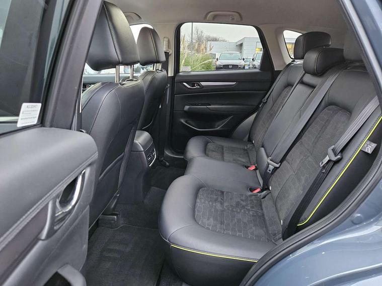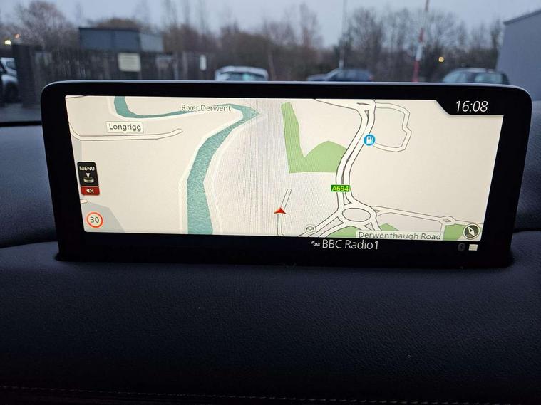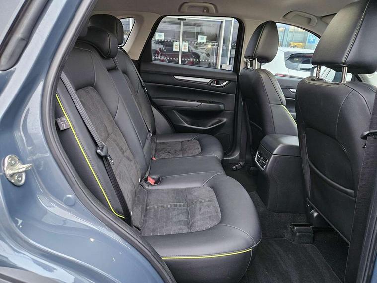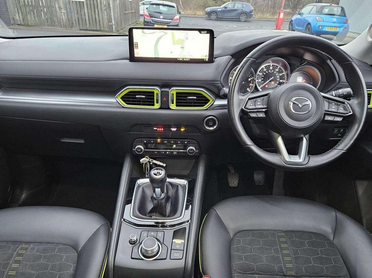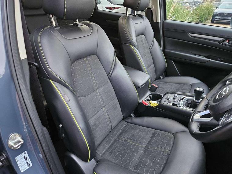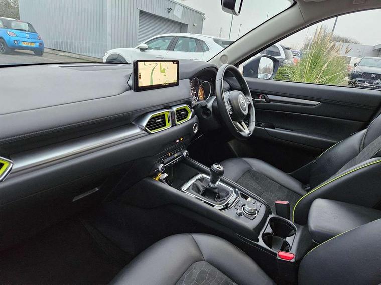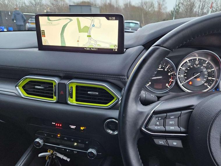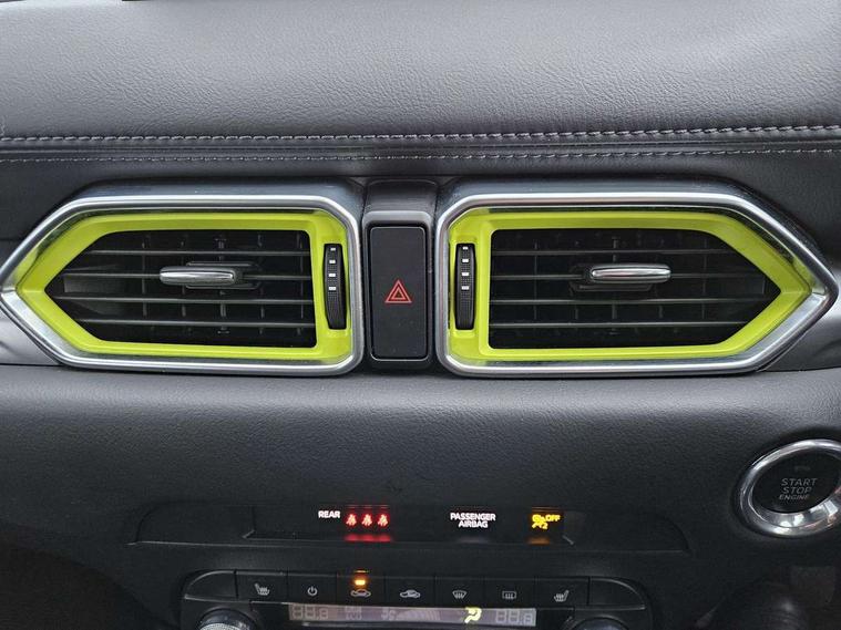10.25" display with Mazda Connect infotainment, Apple car play/Android Auto, Blind spot monitoring with rear cross traffic alert, Bluetooth connectivity with voice control, Collision prevention assist, Connected services, Electric power steering, Emergency stop signalling system, Engine start/stop button, Forward collision warning, Front and rear parking sensors, High meter TFT display, Integrated navigation system, Intelligent speed assist, Lane departure warning system, Lane keep assist, Radar cruise control, Service indicator, Trip computer, Cylinder Deactivation, i-stop, 2 USB sockets in rear, 2x USB sockets in front, 6 speakers, AM/FM radio, Bluetooth audio streaming, DAB Digital radio, Multimedia Commander including separate volume dial, Steering wheel mounted audio controls, Adaptive front lighting system, Auto dimming rear view mirror, Automatic headlights, Black mirror caps, Body colour roof spoiler, Body coloured front and rear black lower bumper mouldings, Bright finish signature wing, Coming/leaving home lighting function, Door mirror integrated indicators, Dual chrome tailpipes, Dusk sensitive headlamps, Electric front/rear windows with one touch auto up/down, Front and rear silver under garnish and side skirt, Front and rear silver under guard and side garnish, Front grille in material black finish, High beam assist, Intermittent rear wash/wipe, LED auto levelling, LED daytime running lights, LED front fog lights, LED Headlights, LED third brake light, Lime green air vent louvre inlay dashboard panel, Lime green front grille accent color, Louver bezel inner lime green accent, Power folding and heated door mirrors, Privacy glass (rear side windows only), Rain sensing front wipers, Rear side wing doors, Satin black B and C pillars, Satin black side mouldings, Scuff plates, Shark fin antenna, Signature LED rear combination lights, Vinyl with lime green door trim panel, 12v electrical power outlet, 3 seat bench in 2nd row, 3 stage heated front seats, 40:20:40 Karakuri fold-flat seat system, 6 way power adjustable driver seat, Driver seat lumbar adjustment, Driver seat power slide, recline and height adjustment, Driver, Front passenger and two rear grab handles with coat hooks, Driver/passenger front seatback pockets, Driver/passenger sunvisors + illuminated vanity mirrors (drivers with ticket holder), Dual zone climate control, Folding centre armrest with 2 cup holders, Front and rear door pockets, Front centre storage with two cupholders, Front passenger seat manual slide, recline and height adjust, Gear shift indicator, Height adjustable passenger seat, Humidity sensor, Illuminated glovebox, Interior dome light with integral spotlight, ISOFIX child seat anchorage points attached on outer rear seats, Karakuri tonneau cover, Leather wrapped steering wheel and gear knob, Leatherette door trim, Leatherette/suede upholstery, Light roof lining, Luggage compartment LED lighting, Luggage compartment power outlet, Rear air vents, Rear headrests, Rear seat recline, Reversible waterproof cargo board, Roof mounted sunglasses holder, Single front passenger seat, Three height adjustable head restraints, Tilt/height adjustable steering wheel, White interior LED illumination lighting, 3 point front seatbelts with pre-tensioners, 3 rear 3 point seatbelts, ABS, Advanced Smart City Brake Support - SCBS, Child locks on rear doors, Driver and front passenger side airbags, DSTC-Dynamic Stability and Traction Control, Dual front airbags, Electronic brake force distribution, Electronic parking brake with auto hold, ESP, Front and rear curtain airbags, Front passenger airbag deactivation, G-Vectoring control, Hill hold assist, Seatbelt reminder front and rear, Single stage passenger airbags, Smart brake support with forward obstruction warning, Tyre pressure monitoring system, Automatic door locking when moving off, Deadlock, Immobiliser, Power door locks, Remote central locking, Thatcham Cat.1 alarm, 19" diamond cut black alloy wheels, Tyre repair kit,