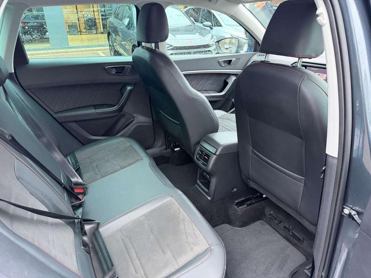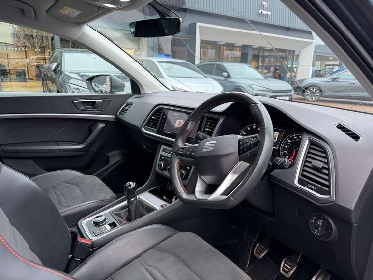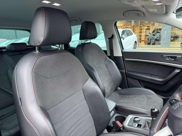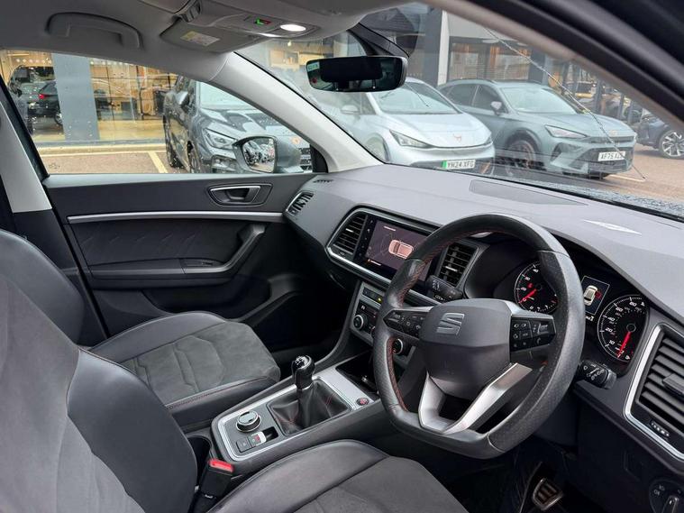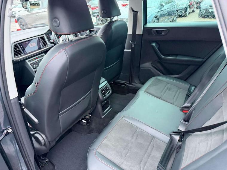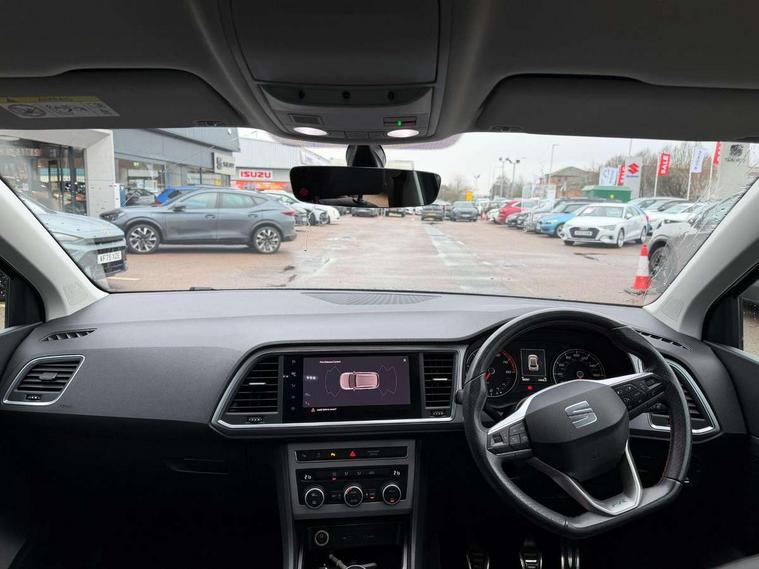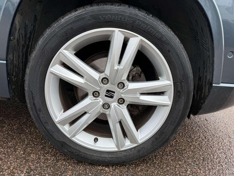 Cruise control system with speed limiter, Outside temperature gauge, Progressive power assisted steering, SEAT drive profile with driving experience button - Normal, Sport, Eco and Individual mode, steering and throttle response, Self parking functionality (includes front and rear parking sensors), Trip computer, Wireless full link smartphone integration, Wireless phone charger, Steering wheel mounted audio/phone controls, Body colour bumpers, Body coloured wheel arch surrounds, Chrome roof rails, Chrome side window trim, Cosmo grey front grille frame, Dark tinted rear windows, Daytime running lights, Door mirrors with welcome light silhouette, Dynamic headlight range control with self adjusting whilst driving, Electric adjustable/heated/folding door mirrors, Front and rear electric windows, Full LED headlamps with lens and LED front fog lamps with cornering function, Illuminated aluminium front door sill, LED rear tail lights with dynamic indicators, Rear fog lights, Rear spoiler, Rear wash/wipe, Simulated exhaust pipes in chrome frame, 12V socket in front, 60/40 split folding rear seat, Aluminium pedals, Dual zone climate control, Front and rear head restraints, Front centre armrest, Front seat back storage pockets, Height adjustable driver and passenger seat with lumbar adjustment, ISOFIX points in outer rear seats with top tether anchorage points, Leather steering wheel and gear knob, Microsuede upholstery with front sports seats, Multicoloured ambient lighting with LED interior illumination, Rear armrest and easy back seat release mechanism from boot, Storage compartment in roof console for sunglass, Storage compartment under driver's seat, Convenience pack - Ateca, Interior lighting pack - Ateca, Navigation system pack with DAB - Ateca, 3x3 point rear seatbelts, ABS, Traction control system (TCS), Electronic stability control (ESC) and Electronic differential lock system (XDS), Airbags - Driver and front passenger airbag with deactivation, front side, two curtain and driver's knee airbags, Electric parking brake with auto hold function, Front and rear seatbelt reminder, Front assist with autonomous emergency braking, Hill hold control, Tiredness recognition system, Traction control, Tyre pressure monitoring system, Alarm, Keyless entry, Locking wheel bolts, Chrome interior detailing, 18" Brillaint silver alloy wheels,