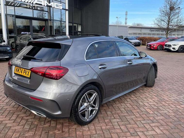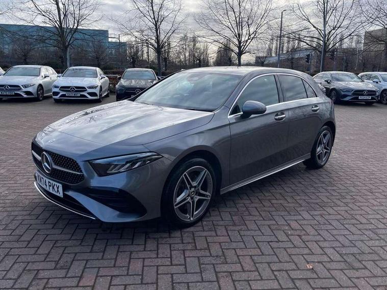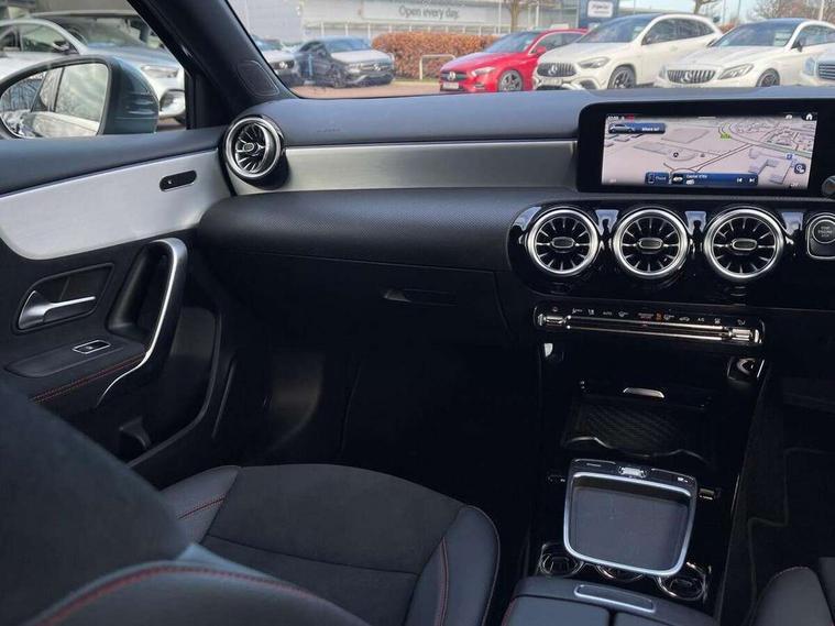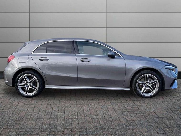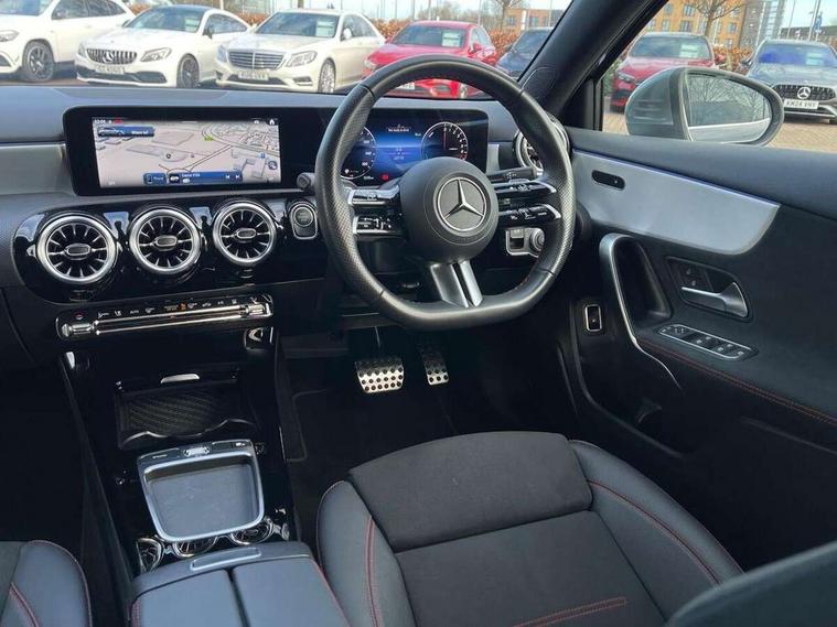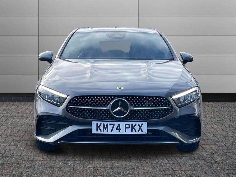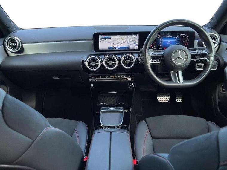 10.25 inch touchscreen central media display, 10.25" Digital instrument cluster display screen, Acoustic ambient protection, Attention assist, Blind spot assist, Brake pad wear indicator warning light, Car wash mode, Cruise control + speed limiter, Direct steering, Direction indicators with lane change function, Dual bluetooth interfaces, DYNAMIC SELECT with a choice of driving modes (ECO, Comfort, Sport and Individual), Easy pack tailgate hands-free access, ECO start/stop function, Engine start/stop button, Fingerprint scanner, Fluid level warning indicator for fuel, oil, coolant and washer fluid, Fluorescent jacket for driver, Hard-disk navigation, Hey Mercedes Voice activation, Lamp failure indicator, Lane keeping system, Mercedes me connect including emergency call system, accident recovery, breakdown and maintenance management, Mercedes me remote services, Outside temperature gauge, Owners manual in English, Pre-installation of private car share, Preinstallation for Mercedes Benz link, Remote and charging services plus, Remote boot closing, Service indicator (ASSYST), Smartphone integration with Apple CarPlay and Android auto, Speed limit assist, Speed sensitive power steering, Tailgate, Trip computer in multifunction display with current consumption indicator, Wireless charging, Charging system - AC charging system rated at 11kW, Charging system - DC charging system rated at 22 kW, Comfort suspension, Mode 2 charging cable for domestic socket with 5m up to 1.8kW, Mode 3 charging cable for wallbox and public charging stations with 4m upto 22 kW, DAB Digital radio, MBUX multimedia system, Mercedes Benz sound system (100 W) with 6 speakers, 4 Electric Front and Rear windows, Adaptive brake lights, AMG body styling - AMG front apron with front splitter and AMG rear apron and visible exhaust tailpipe trim elements, Body colour bumpers, Body colour door handles with chrome inserts, Body colour side skirt, Body coloured door mirrors, Chrome beltline strips, Diamond radiator grille with pins in fine star pattern, Electric adjustable and heated door mirrors with integrated LED side indicators, Exhaust system with 2 visible tailpipe trim elements and rear apron, Headlamp assist automatic headlamp activation, Heat insulating dark tinted rear and rear side windows, Heated glass rear windscreen + timer control, LED High level third brake light, LED High Performance headlamps including integral LED daytime running lamps and adaptive highbeam assist, LED tail lamp, Privacy glass, Radio aerial, Rain sensing windscreen wipers with two sensitivity settings, Rear fog lights, Rear side wing doors, Rear windscreen wiper, Window line trim strip in chrome, 3 seat bench in 2nd row, 3 Spoke flat bottom leather multi function steering wheel with perforated leather in grip area, 4 way lumbar support, 40:20:40 split folding rear seats, Air conditioning - One zone THERMATIC automatic climate control with automatically controlled air distribution, AMG floor mats, Automatic child seat recognition sensor, Black air vents with surround in silver chrome, Black roof lining, Brushed stainless steel sports pedals with rubber studs, Charging socket, Front centre armrest with stowage, Front door sills with Mercedes Benz lettering, Front seat backs luggage nets, Galvanished gear shift paddles on steering wheel, Heated front seats, Height/reach adjustable steering column, Interior lighting - 64 colour Ambient lighting, Interior mirror with reading lamps in black and frameless, Pre-entry climate control, Rear armrest with 2 cupholders, Seat occupancy sensor for front passenger seat, Single front passenger seat, Sports seats with integrated headrests, Stowage compartment in centre console with retractable cover, Sunvisors with illuminated vanity mirrors, Twin front cupholders, Light and sight package - A Class, Mirror package - A Class, Parking pack with 180 degree view - A Class, Seat comfort pack - A Class, USB pack plus - A Class, 3 rear 3 point seatbelts, ABS with Brake Assist, Active bonnet, Active brake assist includes forward collision warning system with autonomous braking, Adaptive brake assist with hold function and hill start assist, Black seatbelts, Bonnet with power domes, Childproof locks manually operated for rear doors and electrically operated for rear power windows, Crash responsive emergency lighting, Driver and passenger head and side airbags, Drivers knee airbag, Dual stage driver/passenger airbags, Electronic parking brake, ESP curve dynamic assist, ESP with ASR, Front and rear seatbelt reminder, ISOFIX and top tether child seat fixing points in two outer rear seats, Perforated front brake discs, Radar based regeneration, Tyre pressure monitoring system, Warning triangle and first aid kit, Window airbags, Alarm system/interior protection/immobiliser, Guard 360 degree vehicle protection, Keyless entry lock/unlock, Keyless Go, Remote central locking and crash sensor with emergency opening function, Light longitudinal grain aluminium trim, 18" AMG 5 twin spoke light alloy wheels, aerodynamically optimised, painted in black with high sheen finish, Summer tyres, Tirefit sealant kit,