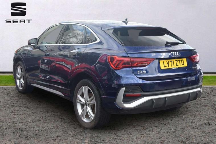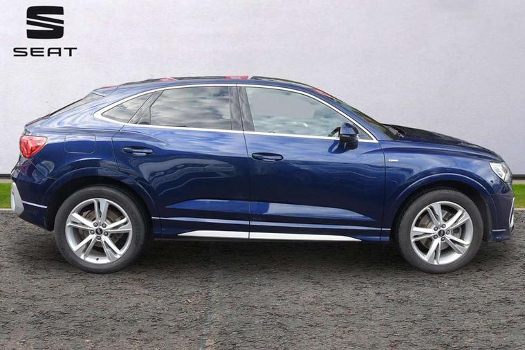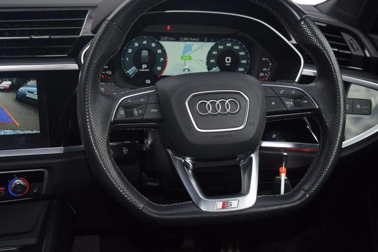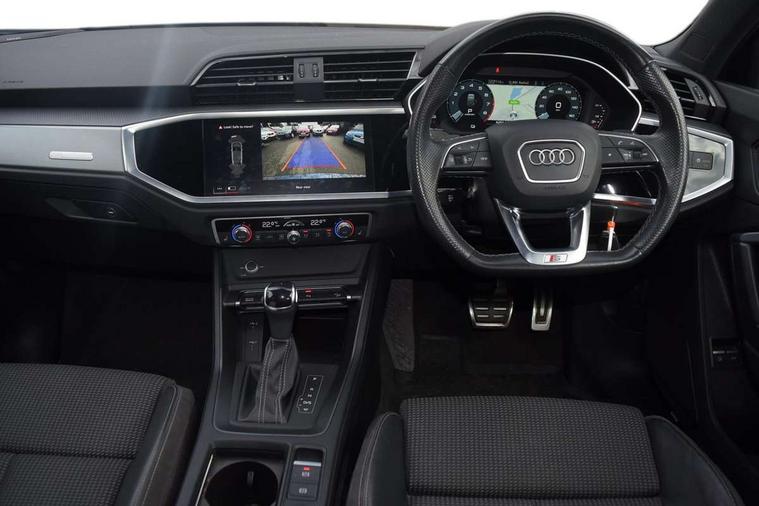 Audi connect safety and service (e-call), Audi drive select, Audi lane departure warning, Audi smartphone interface includes wireless Apple carplay/Android Auto, Audi Virtual Cockpit - 10.25" display, Bluetooth interface, Camera based traffic sign recognition, MMI Navigation Plus with high resolution 10.1 inch touchscreen colour display, Power operated tailgate, Progressive steering, Service interval indicator, Start stop system with recuperation, Voice control system with natural language interaction, 3 pin 10 amp domestic charging cable, Standard suspension, Type 2 mode 3 32 amp charging cable, Type 2 socket for AC charging, 2 USB-C ports with charge and data functions, 6 passive loudspeakers, DAB digital radio module, Acoustic windscreen, Aluminium window trim, Auto dimming frameless rear view mirror, Diffuser grille in grained matt black, Diffuser trim in selenite silver, Electrically folding, adjustable and heated door mirrors with integrated LED side indicators and kerb view function for passenger side, Front and rear electric windows, Front fog lights, Front side air inlets in selenite silver, Front underbody protection in manhattan grey paint finish, Grille surround in aluminium silver matt, High gloss black finish B and C pillars, LED headlights with LED daytime running lights and dynamic rear indicator, LED rear lights, Privacy glass dark tinted rear and rear-side windows (from B-pillar backwards), Radiator grille in titanium black with inlay in matt aluminium silver, Rain and light sensors, Rear side wing doors, Rear underbody protection in matt black, Rear wiper, S line badges on front wings, Side skirt insert in matt Platinium grey, Third brake light, Tinted rear windows, Variable front intermittent wipers, 12V socket in rear centre console, 3 seat bench in 2nd row, 40:20:40 folding with manual adjustment for 60:40 forwards/backwards position and backrest angle, Adjustable rear seat bench/backrest with centre armrest and cupholder, Black cloth headlining, Dual zone electronic climate control, Front and rear black floor mats with contrast stitching, Front and rear headrests, Front and rear roof module including reading lights, Front centre armrest, Glove compartment lighting, Height and reach adjustable steering wheel, Illuminated door sill trims with S logo, ISOFIX child seat mounting for front passenger with airbag deactivation and outer rear seat including top tether attachment point for outer rear seats, Luggage compartment light, Manual front seats with height adjustment, Perforated leather gearknob, Single front passenger seat, Stainless steel luggage compartment sill finisher, Stainless steel pedals, Non smoking pack - Q3, 3x3 point rear seatbelts, 6 airbags - Driver, front passenger, curtain and side windows, Audi pre-sense front with pedestrain and cyclist recognition, Electrically operated child locks on rear doors, Electromechanical parking brake, Electronic stabilisation control including ABS, ASR and EDL, Front seatbelt reminder, Hill descent control, Hill hold assist, Pre sense basic, Seatbelt monitoring, Tyre pressure warning, Warning triangle and first aid kit, Anti theft alarm, Anti theft wheel bolts, Immobiliser, Remote central locking, Black dashboard, Dark matt brushed aluminium inlay, Detail dashboard around MMI touch colour display in glass look, black with surround in aluminium look, Leatherette door armrest, Tool kit, Tyre repair kit,
