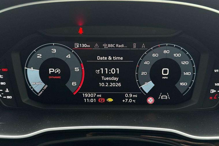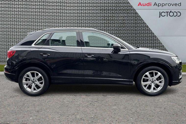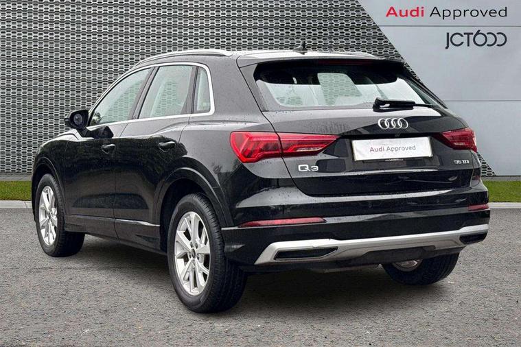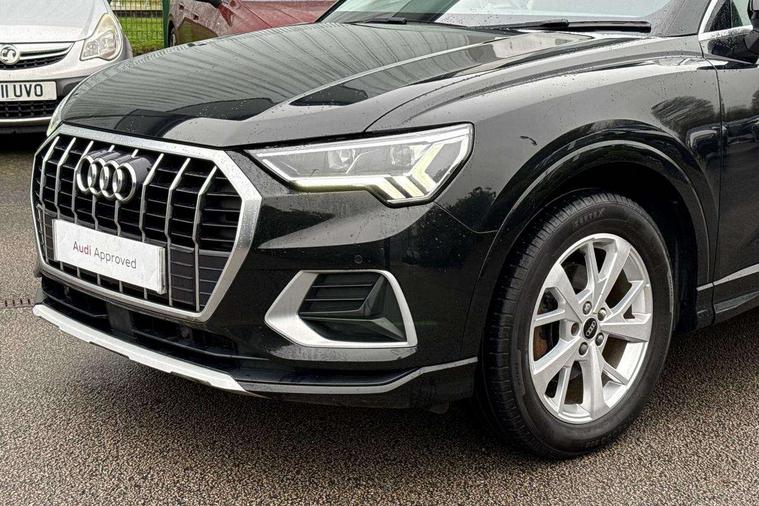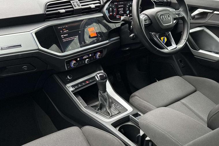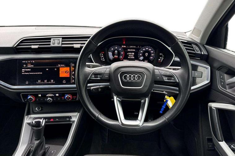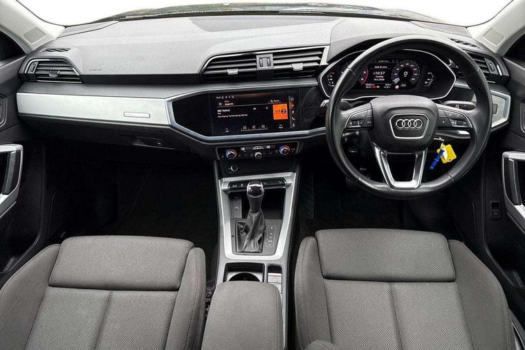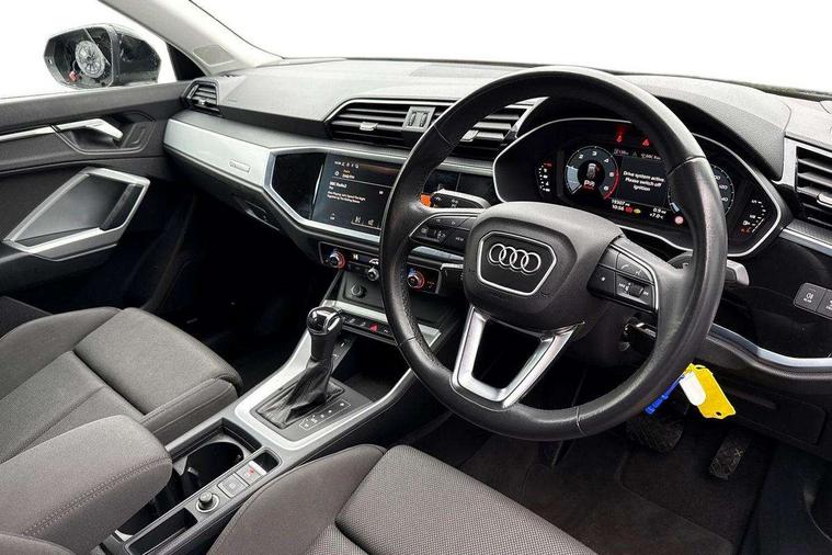 Amazon alexa Integration, Audi connect safety and service (e-call), Audi drive select, Audi lane departure warning, Audi Virtual Cockpit - 10.25" display, Bluetooth interface, Camera based traffic sign recognition, MMI Navigation Plus with high resolution 10.1 inch touchscreen colour display, Power operated tailgate, Progressive steering, Service interval indicator, Smartphone interface includes wireless Apple carplay/Android Auto, Start stop system with recuperation, Voice control system with natural language interaction, Diesel particulate filter, Standard suspension, 2 USB-C ports with charge and data functions, 6 passive loudspeakers, DAB digital radio module, Acoustic windscreen, Aluminium roof rails, Aluminium window trim, Auto dimming frameless rear view mirror, Body coloured bumpers, Electrically folding, adjustable and heated door mirrors with integrated LED side indicators and kerb view function for passenger side, Front and rear electric windows, Front fog lights, Front side air inlets in matt selenite silver, Front spoiler in matt selenite silver, Grille vertical bars in aluminium silver/Matt, High gloss black finish B and C pillars, LED headlights with LED daytime running lights and dynamic rear indicator, LED rear lights, Rain and light sensors, Rear diffuser strip in matt selenite silver, Rear side wing doors, Rear wiper, Silver chrome grille surround, Third brake light, Titanium black radiator grille, Variable front intermittent wipers, 12V socket in rear centre console, 3 seat bench in 2nd row, 3 spoke multi-function leather steering wheel, 40:20:40 folding with manual adjustment for 60:40 forwards/backwards position and backrest angle, Aluminium door sill trims, Dual zone electronic climate control, Front and rear floor mats, Front and rear headrests, Front and rear roof module including reading lights, Front centre armrest, Glove compartment lighting, Height and reach adjustable steering wheel, ISOFIX child seat mounting for front passenger with airbag deactivation and outer rear seat including top tether attachment point for outer rear seats, Luggage compartment light, Lunar silver cloth headlining, Manual front seats with height adjustment, Single front passenger seat, Stainless steel luggage compartment sill finisher, Non smoking pack - Q3, 3x3 point rear seatbelts, 6 airbags - Driver, front passenger, curtain and side windows, Audi pre-sense front with pedestrain and cyclist recognition, Electrically operated child locks on rear doors, Electromechanical parking brake, Electronic stabilisation control including ABS, ASR and EDL, Front seatbelt reminder, Hill descent control, Hill hold assist, Pre sense basic, Seatbelt monitoring, Tyre pressure warning, Warning triangle and first aid kit, Anti theft alarm, Anti theft wheel bolts, Immobiliser, Remote central locking, Detail dashboard around MMI touch colour display in glass look, black with surround in aluminium look, Micrometallic silver inlay,