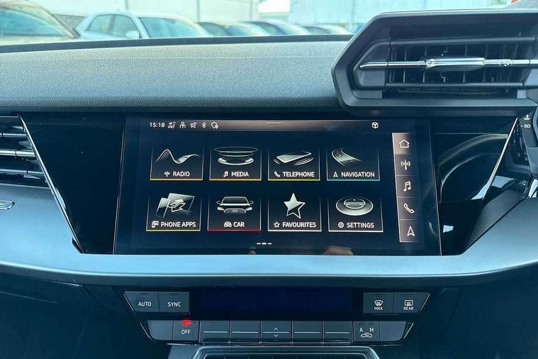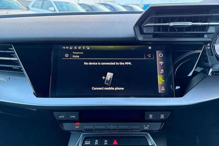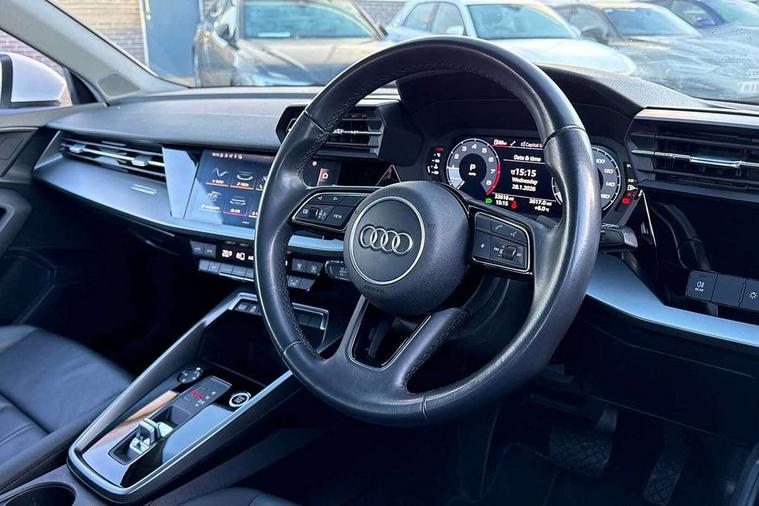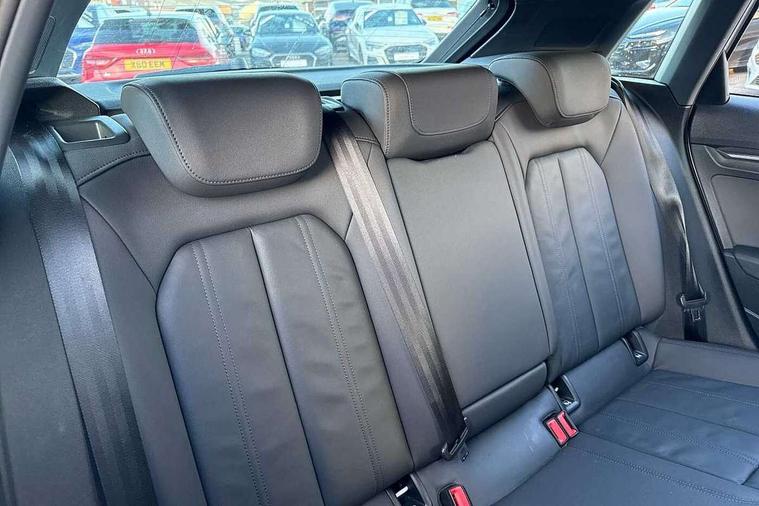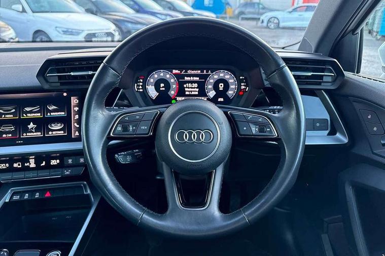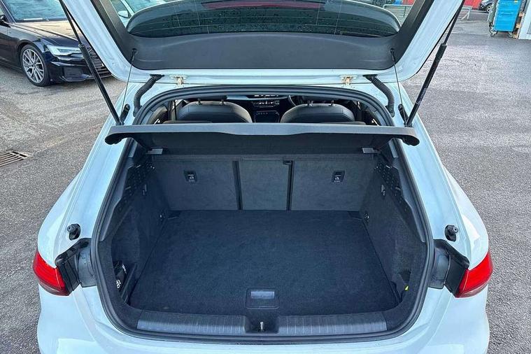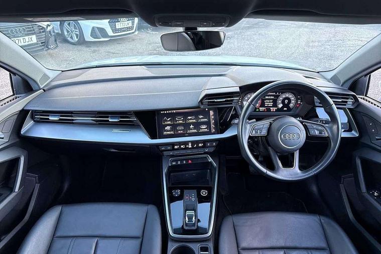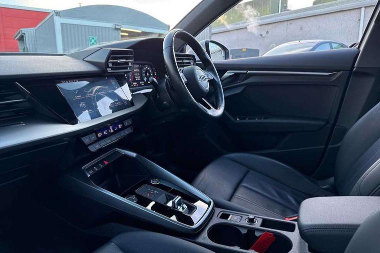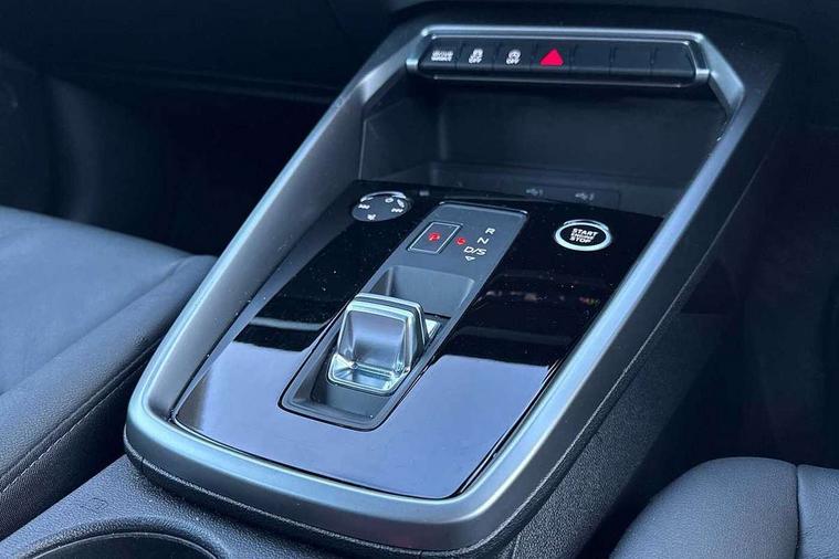 Audi connect emergency call and service, Audi drive select (Auto, Comfort, Dynamic and Individual), Audi smartphone interface, Audi Virtual Cockpit - 10.25" digital and colour instrument cluster, Automatic start/stop system with recuperation, Bluetooth interface, Collision avoidance assistant, Electromechanical power speed sensitive steering, Lane departure warning system, MMI Navigation Plus with high resolution 10.1" colour touch screen display, Service indicator, Trip computer, Voice control system with natural language interaction, Standard suspension, 2xUSB-C connection with data and charging functions, 6 passive loudspeakers, DAB Digital radio, 3rd brake light, Acoustic glass windscreen, Aluminium window trim, Auto dimming frameless rear view mirror, Body colour exterior mirrors, Body colour roof spoiler, Electrically adjustable/heated/folding/auto dimming door mirrors with integrated LED indications + kerb view function for passenger side, Front electric windows, LED daytime running lights, LED headlights and halogen rear lights, Light and rain sensors, Rear electric windows, Rear window, rear door windows and rear side windows in clear glass, Rear wiper, 12V socket and storage compartment in front centre console, 40/20/40 split folding rear seat bench with cupholder, Dual zone electronic climate control, Front and rear centre armrest, Front and rear headrests, Front door sill trims with aluminium inlay, Front/rear floor mats, Height and reach adjustable steering wheel, Interior lighting - Front and rear roof module including reading lights, glove compartment light and right hand side, Luggage compartment floor covering, Manual boot compartment lid, Manually adjustable front seats, Seat side bolsters, Steel grey cloth headlining, Twin leather upholstery, Aluminium interior elements pack - A3 Sportback, Sport styling pack - A3 Sportback, 3x3 point rear seat belts, Driver and front passenger airbag with passenger airbag deactivation, Electronic Stabilisation Control (ESC) including ABS, ASR and EDL, First aid kit with warning triangle and 2 safety vests, Front side airbags with head airbags and interaction airbag, Hill hold assist, Pre-sense front with pedestrian and cyclist detection, Seatbelt monitoring, Tyre pressure loss indicator, Anti theft alarm, Anti-theft wheel bolts, Electronically operated child lock, Immobiliser, Remote control central locking, Inlays with silk effect paint in platinum grey,