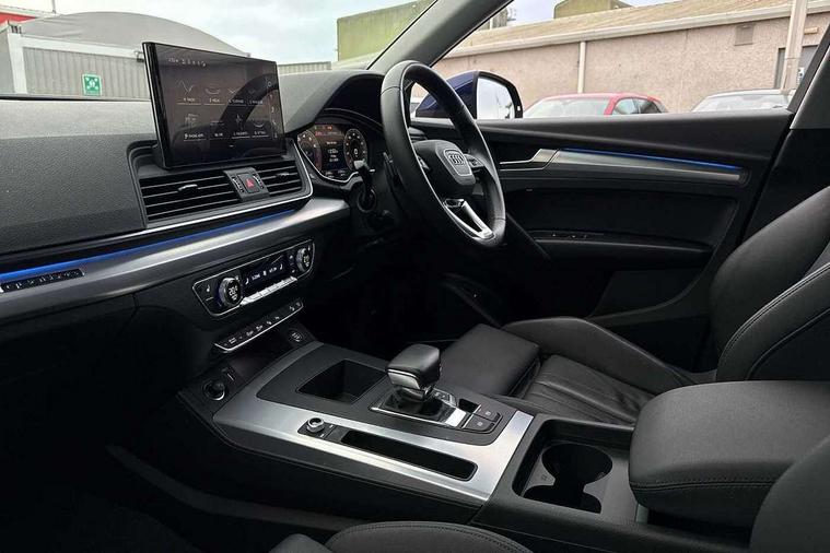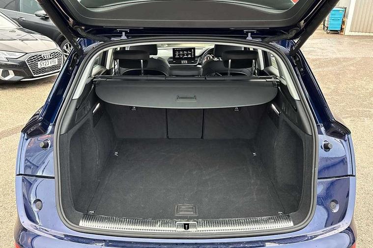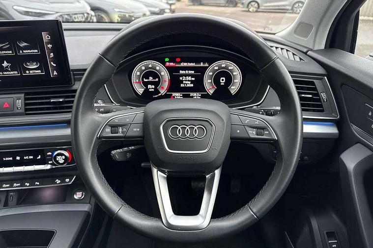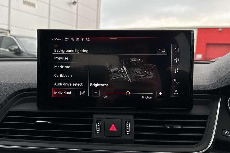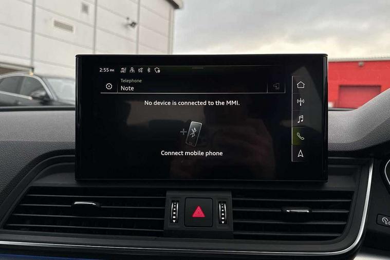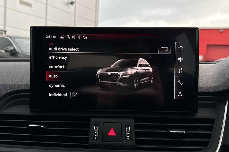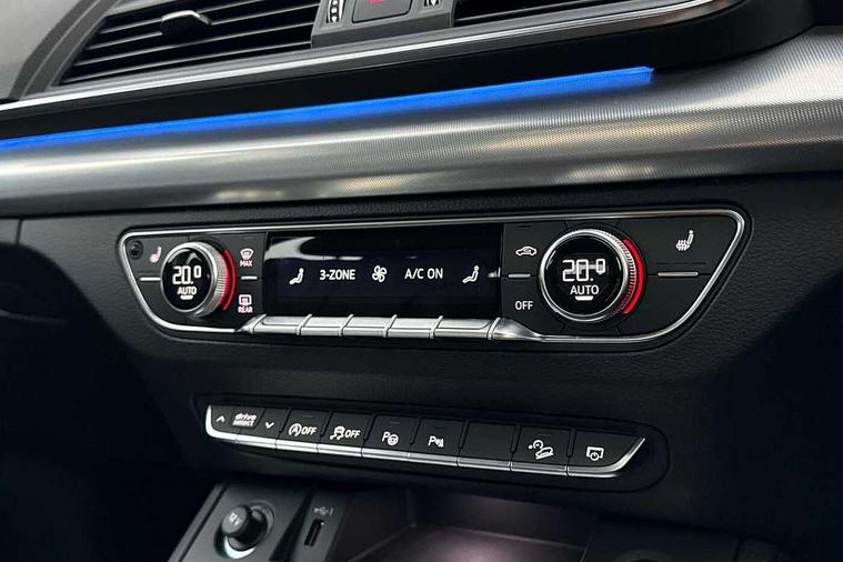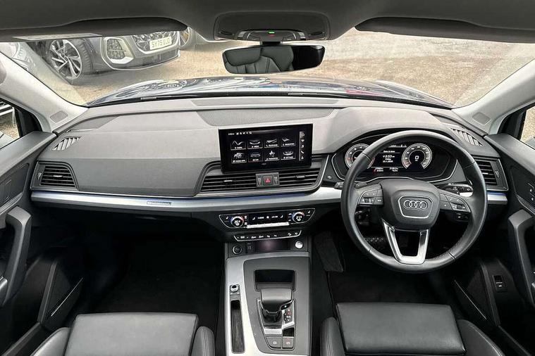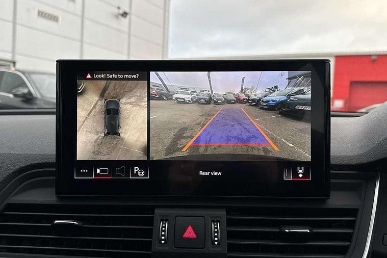 Audi connect safety and service (e-call), Audi connect with Amazon Alexa Integration, Audi drive select, Audi virtual cockpit plus with 12.3" screen and three different layout designs, Audi wireless smartphone interface, Automatic start-stop system with coasting functionality and efficiency programme, Bluetooth interface, Cruise control + speed limiter, Electro - mechanical power assisted steering, MMI navigation plus with 10.1" touch screen, Power tailgate, Reversing camera, Service interval indicator, Voice control system with Audi hotword activation "Hey Audi", Dynamic suspension, Quattro on demand, 2 x USB charging port with aux input socket, DAB Digital radio, 3rd brake light, Acoustic windscreen, Air inlets in matt titanium black with blades in matt aluminium silver, Aluminium roof rails, Auto dimming rear view mirror, Automatic headlights and windscreen wipers, Body colour bumpers, Body colour door mirrors, Chrome plated exhaust trims, Daytime running lights, Door sills in Selenite silver, Electric adjustable/heated/folding door mirrors, Front and rear electric windows, LED headlights and LED tail lights, Lower bumpers painted in contrast Manhattan grey, Matt selenite silver underbody protection, Matt twilight grey radiator grille with chrome vertical struts, Rear chrome trim strip below lights, Rear diffuser strip in selenite silver, Rear side wing doors, Rear spoiler, Rear wiper, Roof bars, 3 rear headrests, 3 spoke multifunction leather steering wheel with shift paddles, 40:20:40 split folding 3 rear bench seat in 2nd row with rear centre armrest, Comfort front centre armrest, Deluxe 3 zone electronic climate control, Door sills trims with aluminium inlays, Front/rear floor mats, Heated front seats, Height adjustable front head restraints, Height/reach adjustable steering column, ISOFIX child seat mounting and top tether, Luggage compartment cover, Manual seat adjustment with 4-way electric lumbar support, Removable luggage compartment floor, Silver cloth headlining, Single front passenger seat, Sunvisors with vanity mirrors, Twin leather upholstery + front sports seats, High gloss pack - Q5, LED interior light pack - Q5, 3 point seatbelts on all seats, 6 airbags - Driver, front passenger, curtain and side airbags, Electrically operated child locks on rear doors, Electromechanical parking brake, Electronic stabilisation control including ABS, ASR and EDL, Front passenger airbag deactivation, Hill descent control, Hill hold assist, Multi collision brake assist, Pop-up bonnet for pedestrian protection, Pre sense city, Seat belt force limiter, Seatbelt monitoring, Tyre pressure warning, Warning triangle and first aid kit, Anti theft alarm, Anti-theft wheel bolts, Keyless Go access/ignition system, Aluminium rhombus inlay,