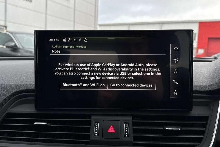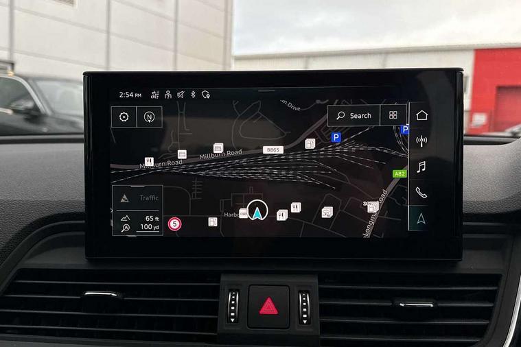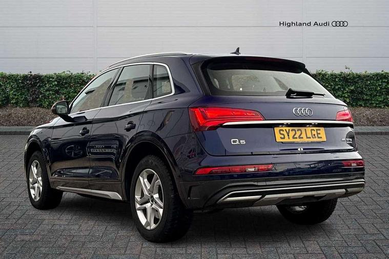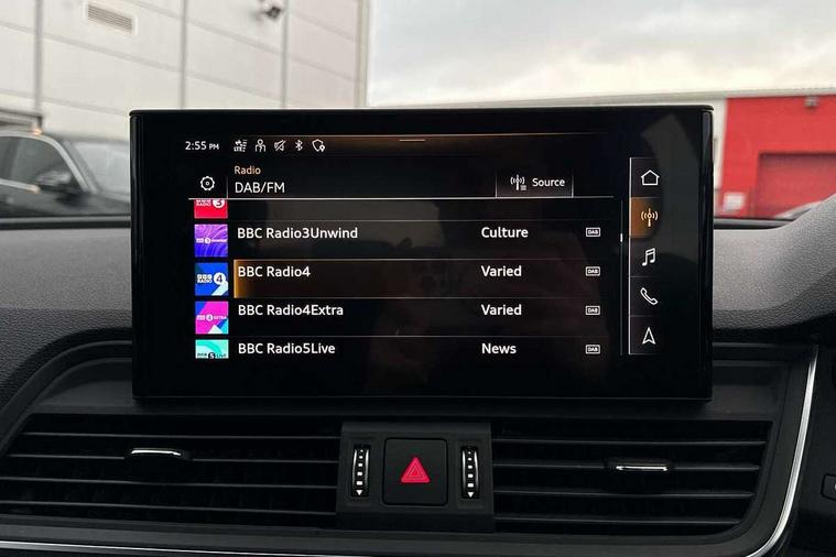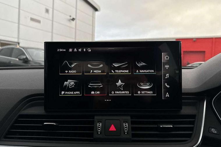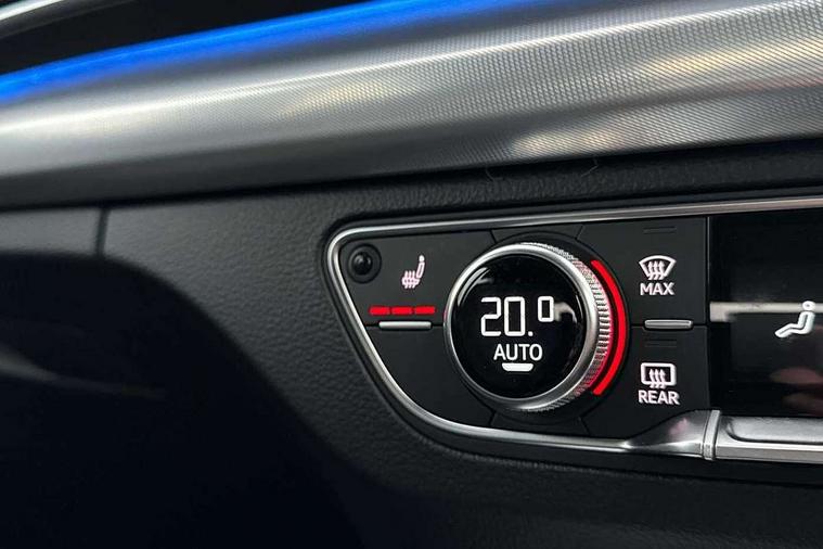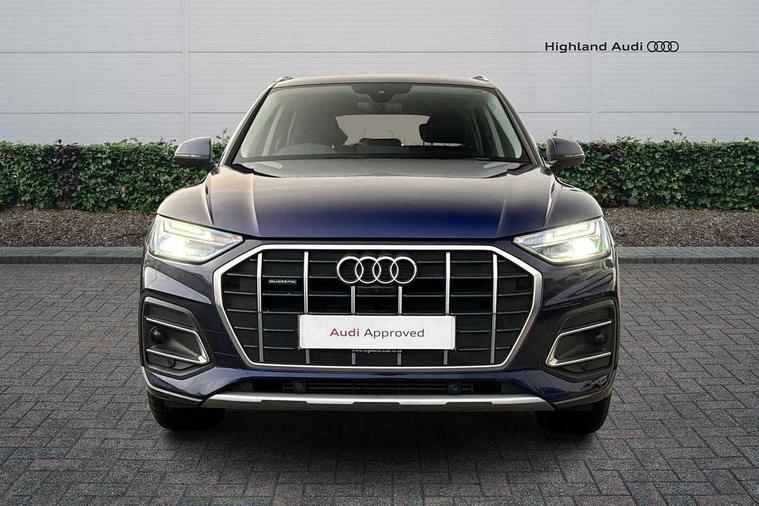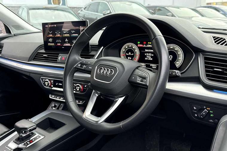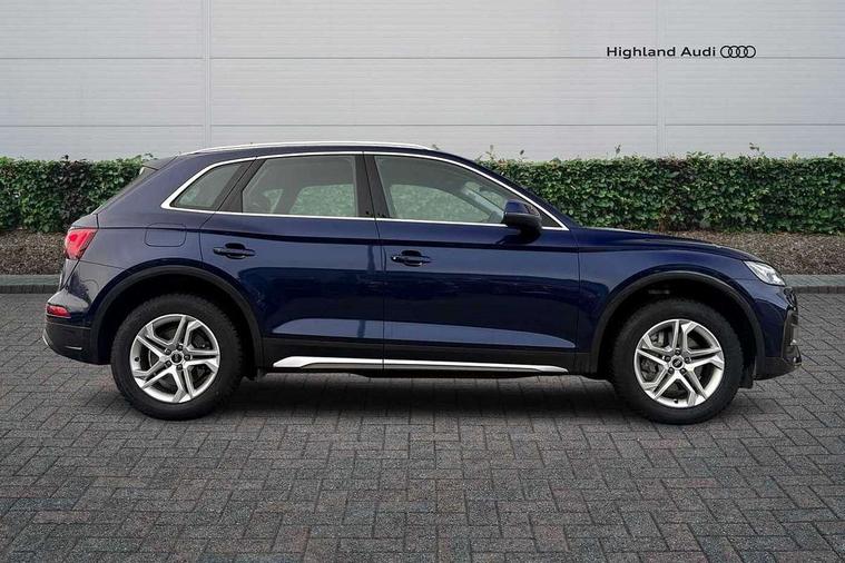 Audi connect safety and service (e-call), Audi connect with Amazon Alexa Integration, Audi drive select, Audi virtual cockpit plus with 12.3" screen and three different layout designs, Audi wireless smartphone interface, Automatic start-stop system with coasting functionality and efficiency programme, Bluetooth interface, Cruise control + speed limiter, Electro - mechanical power assisted steering, MMI navigation plus with 10.1" touch screen, Power tailgate, Reversing camera, Service interval indicator, Voice control system with Audi hotword activation "Hey Audi", Dynamic suspension, Quattro on demand, 2 x USB charging port with aux input socket, DAB Digital radio, 3rd brake light, Acoustic windscreen, Air inlets in matt titanium black with blades in matt aluminium silver, Aluminium roof rails, Auto dimming rear view mirror, Automatic headlights and windscreen wipers, Body colour bumpers, Body colour door mirrors, Chrome plated exhaust trims, Daytime running lights, Door sills in Selenite silver, Electric adjustable/heated/folding door mirrors, Front and rear electric windows, LED headlights and LED tail lights, Lower bumpers painted in contrast Manhattan grey, Matt selenite silver underbody protection, Matt twilight grey radiator grille with chrome vertical struts, Rear chrome trim strip below lights, Rear diffuser strip in selenite silver, Rear side wing doors, Rear spoiler, Rear wiper, Roof bars, 3 rear headrests, 3 spoke multifunction leather steering wheel with shift paddles, 40:20:40 split folding 3 rear bench seat in 2nd row with rear centre armrest, Comfort front centre armrest, Deluxe 3 zone electronic climate control, Door sills trims with aluminium inlays, Front/rear floor mats, Heated front seats, Height adjustable front head restraints, Height/reach adjustable steering column, ISOFIX child seat mounting and top tether, Luggage compartment cover, Manual seat adjustment with 4-way electric lumbar support, Removable luggage compartment floor, Silver cloth headlining, Single front passenger seat, Sunvisors with vanity mirrors, Twin leather upholstery + front sports seats, High gloss pack - Q5, LED interior light pack - Q5, 3 point seatbelts on all seats, 6 airbags - Driver, front passenger, curtain and side airbags, Electrically operated child locks on rear doors, Electromechanical parking brake, Electronic stabilisation control including ABS, ASR and EDL, Front passenger airbag deactivation, Hill descent control, Hill hold assist, Multi collision brake assist, Pop-up bonnet for pedestrian protection, Pre sense city, Seat belt force limiter, Seatbelt monitoring, Tyre pressure warning, Warning triangle and first aid kit, Anti theft alarm, Anti-theft wheel bolts, Keyless Go access/ignition system, Aluminium rhombus inlay,