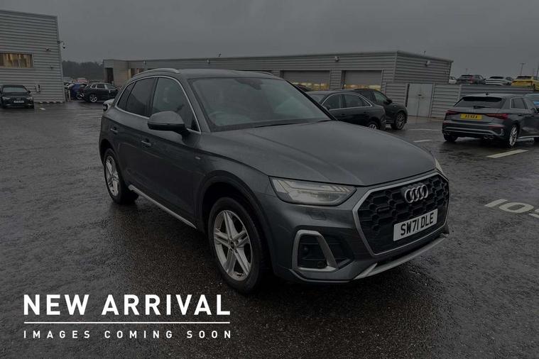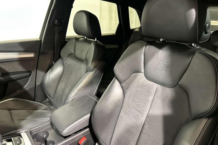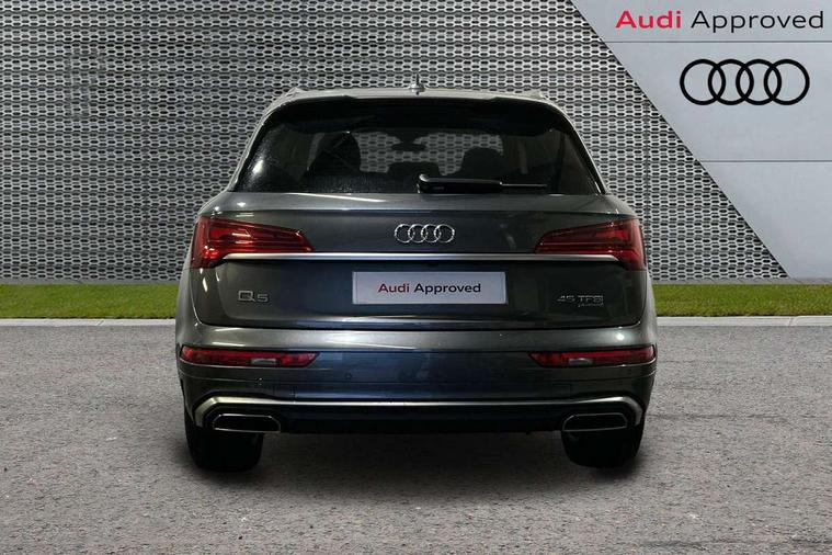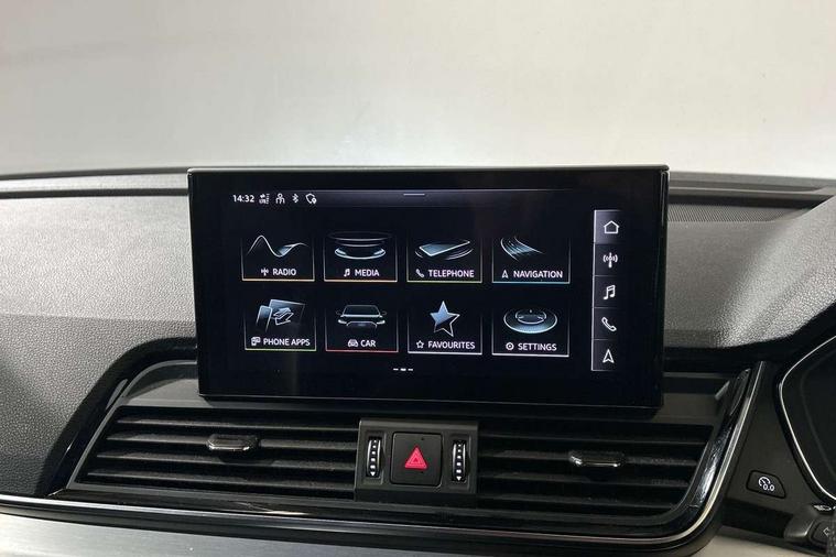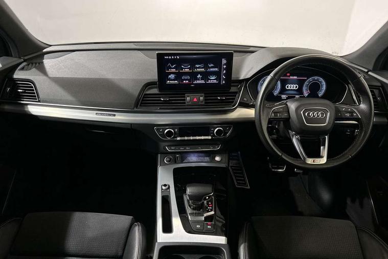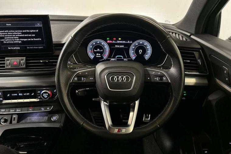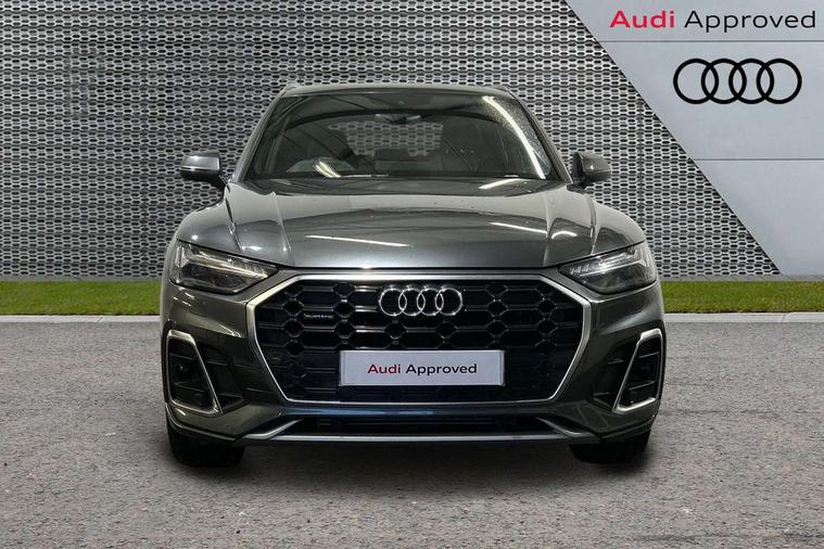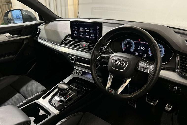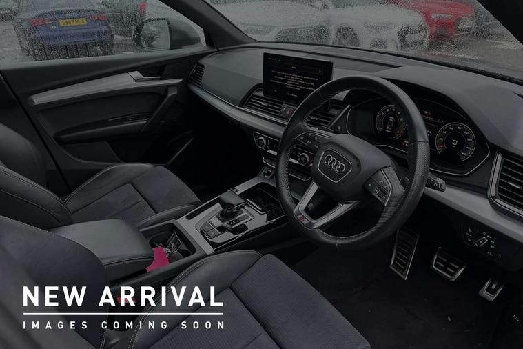 Audi connect safety and service (e-call), Audi connect with Amazon Alexa Integration, Audi drive select, Audi virtual cockpit plus with 12.3" screen and three different layout designs, Audi wireless smartphone interface, Automatic start-stop system with coasting functionality and efficiency programme, Bluetooth interface, Electro - mechanical power assisted steering, MMI navigation plus with 10.1" touch screen, Power tailgate, Reversing camera, Service interval indicator, Voice control system with Audi hotword activation "Hey Audi", Quattro on demand, S line sports suspension, 2 x USB charging port with aux input socket, DAB Digital radio, 3rd brake light, Acoustic windscreen, Aluminium roof rails, Audi matrix LED headlights with dynamic front and rear indicators, Auto dimming rear view mirror, Automatic headlights and windscreen wipers, Body colour bumpers, Body colour door mirrors, Body colour rear diffuser with matt aluminium silver surrounds, Body colour underbody protection, Chrome plated exhaust trims, Daytime running lights, Door sills in Selenite silver, Electric adjustable/heated/folding door mirrors, Front air inlet surrounds in aluminium, Front and rear electric windows, Front radiator grille in honeycomb design, Headlight washers, Lower bumpers painted in contrast Manhattan grey, Rear chrome trim strip below lights, Rear privacy glass and rear side windows, Rear side wing doors, Rear spoiler, Rear wiper, Roof bars, S Line badges on the front wings, S Line front and rear bumpers, S Line side skirts, 3 rear headrests, 40:20:40 split folding 3 rear bench seat in 2nd row with rear centre armrest, Black cloth headlining, Comfort front centre armrest, Contrast stitching on seats, steering wheel and gear lever gaiter, Deluxe 3 zone electronic climate control, Front/rear floor mats, Gear lever in black leather, Heated front seats, Height adjustable front head restraints, Height/reach adjustable steering column, Illuminated door sill trims with S logo, ISOFIX child seat mounting and top tether, Luggage compartment cover, Manual seat adjustment with 4-way electric lumbar support, Removable luggage compartment floor, Single front passenger seat, Stainless steel pedals, Sunvisors with vanity mirrors, High gloss pack - Q5, LED interior light pack - Q5, 3 point seatbelts on all seats, 6 airbags - Driver, front passenger, curtain and side airbags, Electrically operated child locks on rear doors, Electromechanical parking brake, Electronic stabilisation control including ABS, ASR and EDL, Front passenger airbag deactivation, Hill descent control, Hill hold assist, Multi collision brake assist, Pop-up bonnet for pedestrian protection, Pre sense city, Seat belt force limiter, Seatbelt monitoring, Tyre pressure warning, Warning triangle and first aid kit, Anti theft alarm, Anti-theft wheel bolts, Keyless Go access/ignition system, Matt brushed aluminium inlays,