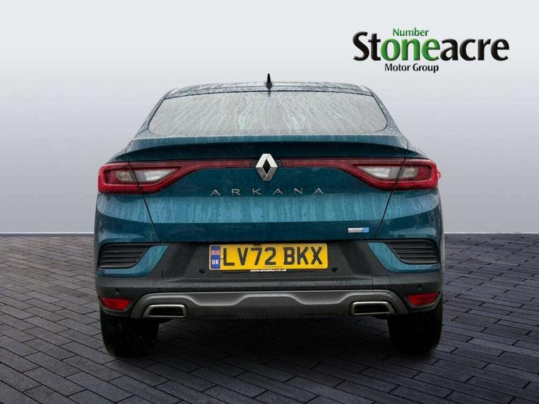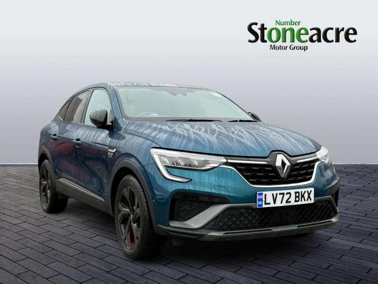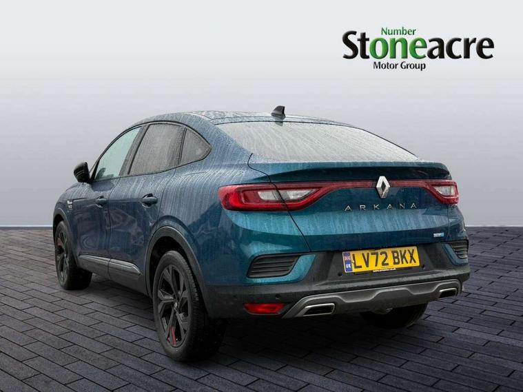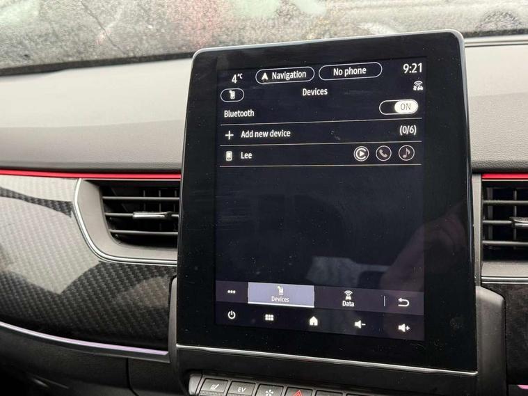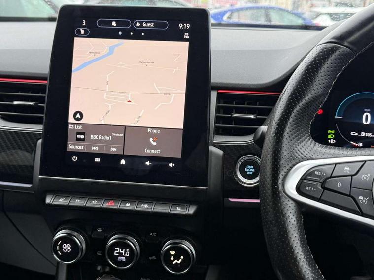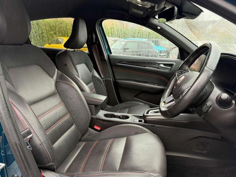 7" TFT Driver information display, Blind spot warning, Bluetooth system, EASY LINK 9.3" portrait touchscreen with navigation, Google search and traffic information, eCall emergency call system, Eco mode, EV button to activate pure mode, Front and rear parking sensors, Gear change indicator, Lane departure warning, Lane keep assist, Multi-sense - 3 driving modes and 8 ambient lighting, Rear cross traffic alert, Rear view camera, Renault automatic emergency assist, Smartphone integration compatible with Apple CarPlay and Android Auto, Traffic sign recognition with over speed prevention, Trip computer, Variable assistance electric power steering, Wireless phone charger, DAB radio, USB port, 3rd brake light, Auto dimming rear view mirror, Automatic headlights, Automatic high / low beam, Automatic windscreen wipers with rain sensor, Black side door protection with gun metal insert, Body coloured bumpers, C-shaped LED front signature lighting, Chrome decopart on wing (fender molding) with R.S. Line badge, Double chromed exhaust tailpipes elements, Extra tinted rear windows and tailgate, Frameless rear view mirror, Front and rear electric windows, Front bumper with F1 blade and honeycomb front grille, Front driver window with one touch facility and anti-pinch function, Front grille with chrome on upper part, Full LED headlights, Glossy black door mirror and lower window lining, Gun Metal front and rear skid plates, Heated rear window, R.S. Line badges on front wing and hatch door, Rain sensor, Rear windscreen wiper, Shiny black shark fin antenna, Side mirrors adjustable electrically, electrically foldable, with defrosting and temperature sensor, automatically foldable at vehicle closure, 3 seat bench in 2nd row, 60:40 split and fixed base rear seats, Aluminium pedals, Automatic climate control with combined filter, humidity sensor and AQS, Black interior roof lining, Carbon style dashboard, Central console with storage, Driver's seat height adjustment, Electrically adjustable front seats, Front and rear head restraints, Height and reach adjustable steering wheel, ISOFIX child seat fixing points on rear outermost seats, LED front and rear roof lights, Passenger seat height adjuster, R.S. line black suede-leather upholstery with red/grey stiching, R.S. Line perforated leather steering wheel with red/black harmony and R.S. Line badge, Rear air vents, Red inserts on air vents, Single front passenger seat, Parking Pack - Hands-free parking & flank protection - Arkana, Winter pack - Arkana, 3x3 point rear seat belts, ABS+EBA, Active emergency braking system, B Brake Mode - One pedal driving with increased regenerative braking, Distance warning alert, Driver airbag, Driver and passenger front and side airbag deactivation, Driver and passenger side airbags, Driver height adjustable seat belt, Electronic parking brake with auto hold, ESC (Electronic Stability Control), Front and rear no seatbelt warning sound, Front curtain airbags, Front head airbags, Hill start assist, Passenger airbag, Tyre pressure warning light, Anti drill door locks and locking fuel cap, Central door locking, Deadlocking system, Hands free keycard with Keyless access and start, RAID (Renault Anti-Intruder Device) automatic door locking, Rear side wing door and window child locking function (front driver door control panel), Superlocking, Thatcham alarm, 18" Silverstone diamond alloy wheels with red inserts,
