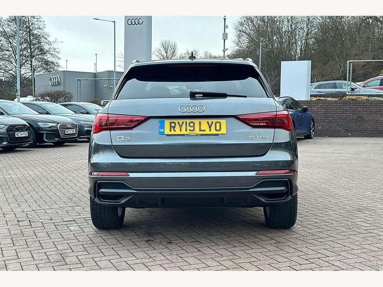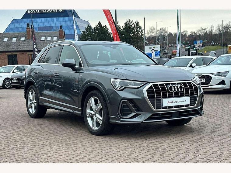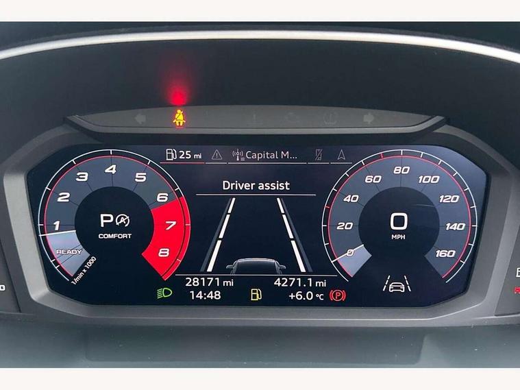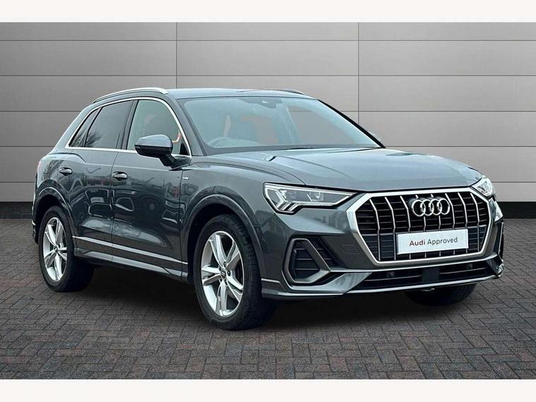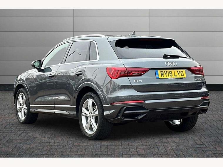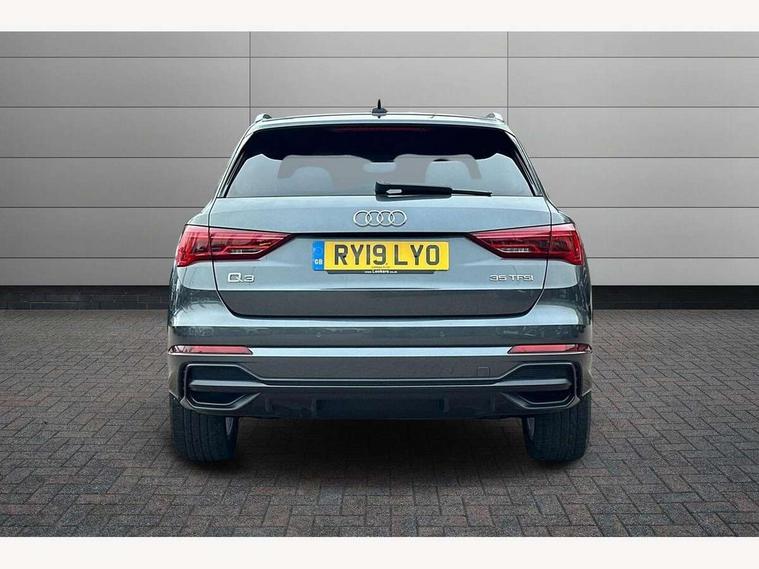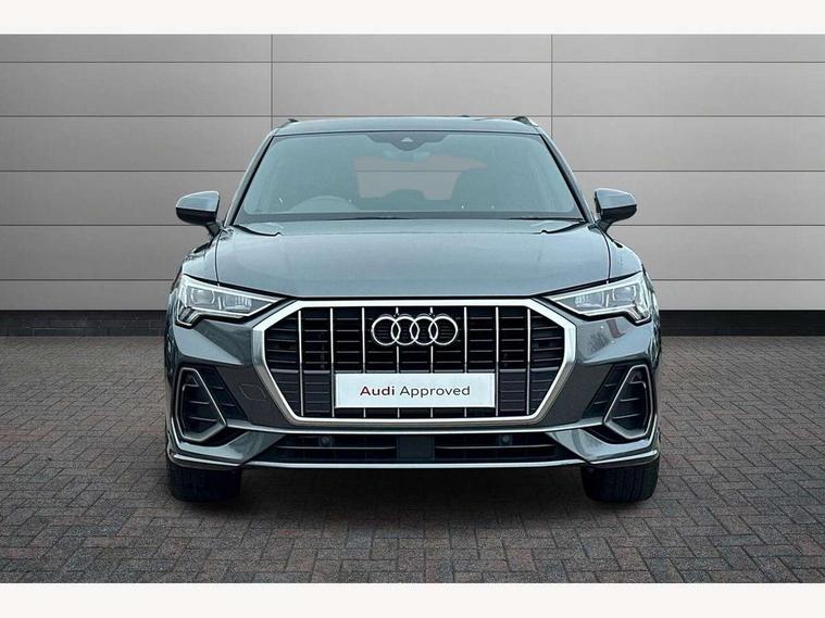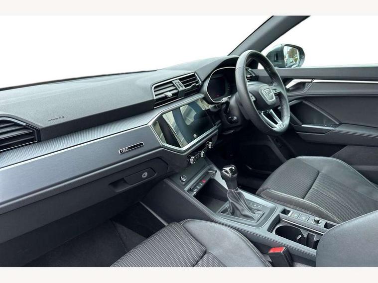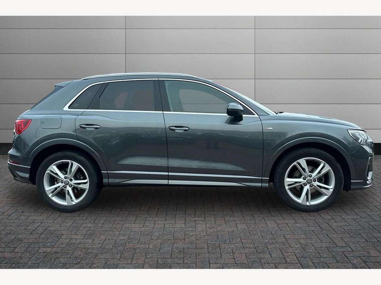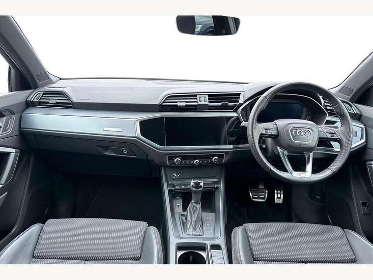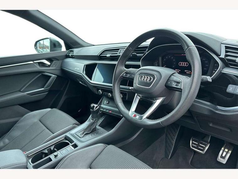 Audi connect safety and service (e-call), Audi drive select, Audi lane departure warning, Audi side assist, Audi smartphone interface, Bluetooth interface, Camera based traffic sign recognition, MMI navigation plus with MMI touch, Power opening/closing tailgate, Progressive steering, Rear parking sensors, Service interval indicator, Stop/start system, Voice control system, Sports suspension, 1 x USB type C and 1 USB type A charging points, 6 speakers, DAB digital radio module, Acoustic windscreen, Aluminium roof rails, Aluminium window trim, Auto dimming rear view mirror, Body coloured bumpers, Diffuser in matt Platinum grey, Electrically adjustable and heated door mirrors with integrated LED side indicators, Front and rear electric windows, Front fog lights, Front side air inlets in matt platinum grey, Front spoiler blade in matt platinum grey, Grille vertical bars in aluminium silver/Matt, High gloss black finish B and C pillars, LED headlights with LED daytime running lights and dynamic rear indicator, LED rear lights, Privacy glass, Rain and light sensors, Rear diffuser strip in matt titanium black, S Line badge on wings, S Line front and rear bumpers, Side skirt insert in matt Platinium grey, Titanium black radiator grille, 12V socket in rear centre console, 40:20:40 split folding rear bench seat, Adjustable rear seat bench/backrest with centre armrest and cupholder, Aluminium door sill trims, Black cloth headlining, Dual zone climate control, Front and rear black floor mats with contrast stitching in rock grey, Front and rear headrests, Front centre armrest with storage compartment and angle adjustment, Illuminated door sill trims with S logo, ISOFIX child seat mounting and Top Tether with front passenger airbag deactivation, Manual front seats with height adjustment, Perforated leather gearknob, Stainless steel luggage compartment sill finisher, Stainless steel pedals, Non smoking pack - Q3, 3x3 point rear seatbelts, 6 airbags - Driver, front passenger, curtain and side windows, Audi pre-sense front with pedestrain and cyclist recognition, Electrically operated child locks on rear doors, Electromechanical parking brake, Electronic stabilisation control including ABS, ASR and EDL, Hill hold assist, Pre sense basic, Seatbelt monitoring, Tyre pressure warning, Warning triangle and first aid kit, Anti theft alarm, Anti theft wheel bolts, Remote central locking, Dark matt brushed aluminium inlay, MMI touch colour display in gloss black with aluminium surround, Tool kit, Tyre repair kit,