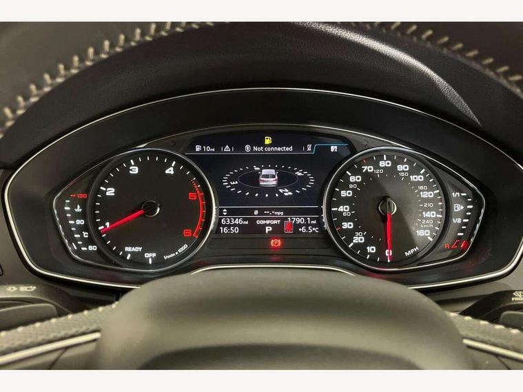 Audi connect, Audi drive select, Audi smartphone interface, Driver information centre with colour display in instrument panel, Electric power steering, Power tailgate, Remote electric boot opening/closing, SD card based MMI navigation, Service interval indicator, Voice control system, Diesel particulate filter, 2 USB ports, Audi sound system, Auxiliary input socket, CD player, DAB Digital radio, MMI radio plus with 7" colour MMI screen and MMI controller, Acoustic windscreen, Aluminium roof rails, Aluminium sill plates, Auto dimming rear view mirror, Black high gloss front air inlet in matt aluminium effect, Body colour bumpers, Body colour door mirrors, Body colour rear diffuser insert, Chrome exhaust tailpipe, Electric headlight adjustment, Electrically adjustable and heated door mirrors, Front and rear electric windows, Front fog lights, Headlight range control, Headlight washers, Honeycomb side air inlet in titan black, Light and rain sensor for auto activation of lights and windscreen wipers, Loading sill protector in stainless steel, Privacy glass with front acoustic glazing, Rear diffuser strip in matt aluminium silver, Rear spoiler, Rear wiper, S Line side skirts, Selenite silver underbody guard, Twilight grey matt radiator grille with matt aluminium horizontal chrome struts, 3 rear headrests, 3 zone climate control, 4 way electric lumbar support for driver and front passenger, 40:20:40 split folding rear bench seat, Black cloth headlining, Front centre armrest with 12v socket, Front sports seats, Front/rear floor mats, Height adjustable driver's seat, Height adjustable front head restraints, Illuminated door sills, Isofix front passenger and rear seat preparation, Jack and tool kit, Load compartment cover, Luggage compartment carpet, Matt selenite silver door inserts, Perforated leather gearknob, Reach + rake adjustable steering column, Removable luggage compartment floor, Removable net partition, Roller blind loadspace cover, Stainless steel pedals, Sunvisors with vanity mirrors, Non Smokers pack, 3 point seatbelts on all seats, ABS, Curtain airbags, Driver and passenger airbags, Driver and passenger side airbags, Electromechanical parking brake, ESC with ASR, ESP, First aid kit, Front passenger airbag deactivation, Hill descent control, Seat belt force limiter, Seatbelt warning lamp, Traction control, Tyre pressure monitor, Warning triangle, Keyless Go access/ignition system, Locking wheel bolts, Remote central locking, Thatcham category 1 alarm + immobiliser, Contrast stitching,