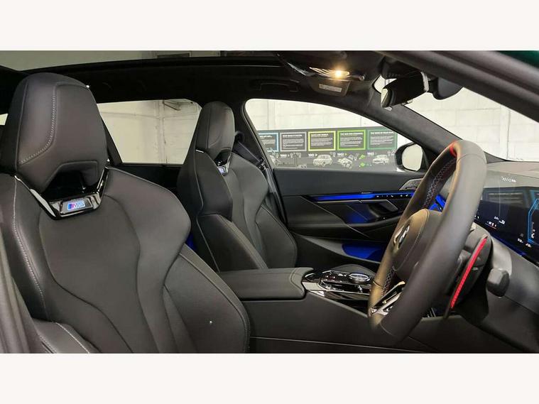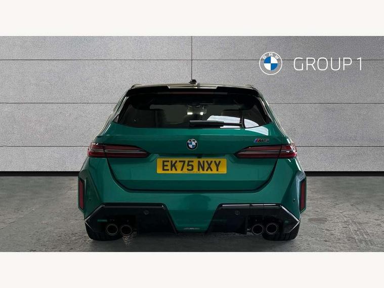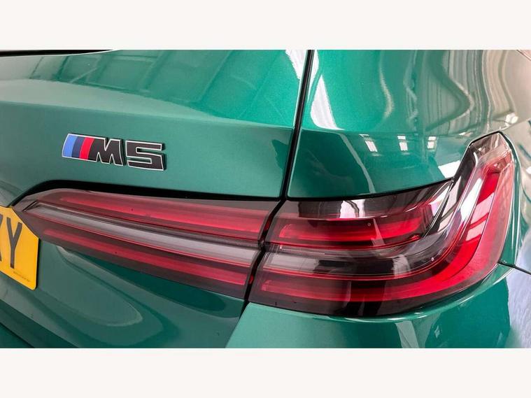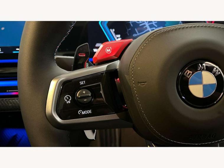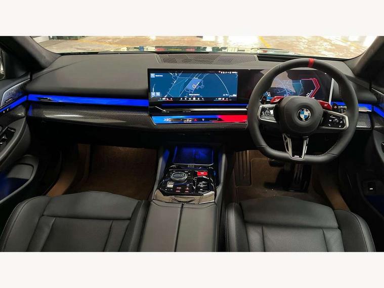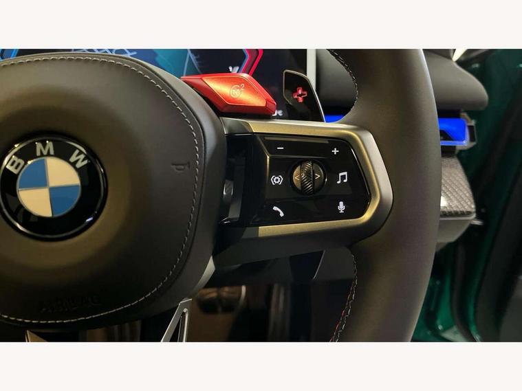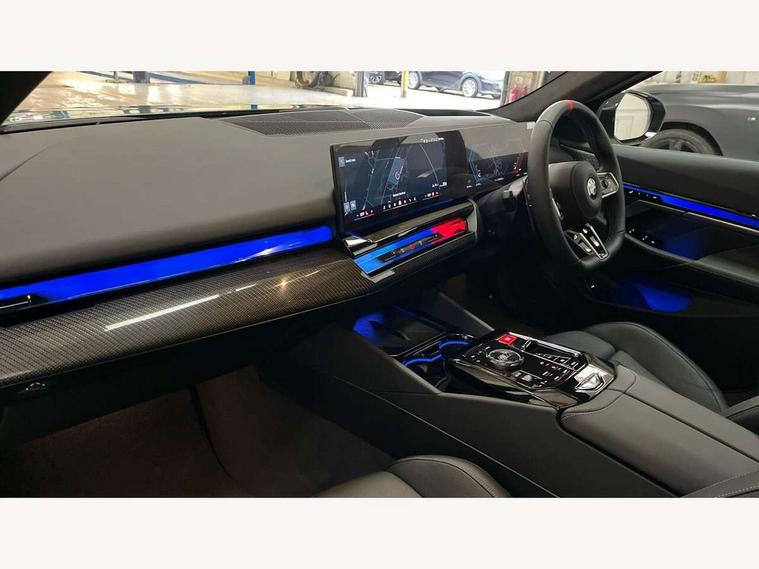 Active Guard, Automatic operation of tailgate with remote opening and closing, Bluetooth Wi-Fi interface, BMW Iconic sounds electric, BMW interaction bar, BMW legal emergency call, BMW Live Cockpit Professional with head up display with driver profile, 4G LTE connectivity, augmented view, full colour head-up display, BMW Teleservices, Connected drive services, Driving Assistant Plus Preparation, M Servotronic steering, Oil sensor for level and grade, On board computer (OBC) includes average speed, fuel consumption and range, journey computer, outside temperature display, personal profile functions, Personal e-SIM, Service interval indicator, AC Fast charging preparation (Maximum charging power 11kW), Adaptive M Suspension with electronically controlled dampers and integral active steering, BMW xDrive system, Charging cable professional (mode 3) for public charging (up to 22 kW), M Drive professional with M track mode, M laptimer, dynamic and dynamic plus, boost control, M Sport differential, Bowers and Wilkins surround sound system, DAB radio, Wireless charging with smartphone storage tray, Adaptive LED Headlights, Auto dimming door mirrors, Black contrast roof, BMW Iconic glow kidney grille, Body coloured bumpers, Electric front and rear windows with fingertip open/close + anti-trap all round and comfort closing function, Heated windscreen washer jets, High beam assistant, High level LED brake light, Interior rear view electrochromatic mirror with automatic anti dazzle function, LED daytime running lights, M lights shadowline, M specific electrically adjustable/foldable/heated exterior mirrors with integrated direction indicators, Rain sensor including auto headlights activation, Rear side hinged doors, Rear wiper, Sun protection glass, 12V power sockets 2 x rear, 1 x luggage compartment (additional 1 X double USB adaptor with 2A charging current), 3 seat bench in 2nd row, 4 zone control automatic air conditioning, Armrest - front and rear integrated door trim, centre console includes storage compartment, rear centre includes 2 cupholders, Child seat ISOFIX attachment with rear outer seats includes top tether, Driver and front passenger lumbar support, Electric seat adjustment with memory, Floor mats in velour, Front ambient light - inside door opener, pull handle, map pocket, curved display, charging tray, cupholder, crystalline glass backlit interaction bar, Glove Compartment with light, Headrests for all seats, Height and length electric adjustment steering column, High-gloss black door switch cluster, power window switch and tailgate button on first and second row seat, M multifunctional seats driver and front passenger with and illuminated M5 logo headrests, M steering wheel with paddle shift, Multifunction controls for leather steering wheel, Rear ambient light - inside door opener, pull handle, map pocket and back panel of front seats, Single front passenger seat, Steering wheel heating, Through loading system with 40/20/40 split folding rear seat, Connected package professional - M5, Exterior design pack - M5, M high gloss Shadowline exterior trim pack - M5, M high gloss shadowline with extended contents pack - M5, Parking assistant plus pack with anti travel recorder - M5, Acoustic protection for pedestrians, Airbag deployment is controlled with respect to the intensity and scope, Anti lock braking system (ABS) with cornering brake control, Automatic door lock when driving away, Brake assist function, Child locks, Crash sensor for activation of hazard warning lights, Driver and front passenger airbags, Driver central airbag, DSC - Dynamic Stability Control, Electromechanical parking brake with automatic drive away release and auto hold function, Emergency brake assist, Head airbags, M Sport seatbelts, PC iBrake PostCrash approah collision warning with braking function, Side airbags for driver and front passenger, Side impact protection, Three inertia reel rear seatbelts, Trailer stability control, Tyre pressure monitoring system, Warning triangle and first aid kit, Alarm system for monitoring doors, engine compartment, interior movement sensor, tilt sensor and siren with emergency power supply, Automatic door locking, Comfort access system with BMW digital key plus, digital key card, smartphone as vehicle key, smart opening/closing, gesturing tailgate, light staging, Interior camera, Locking wheel bolts, Tyre repair kit,