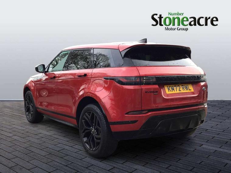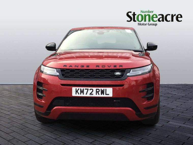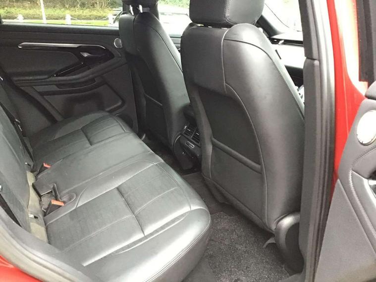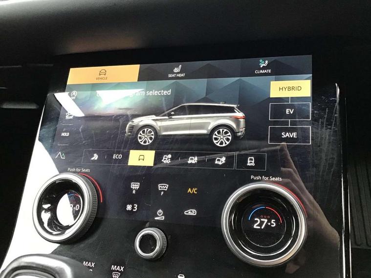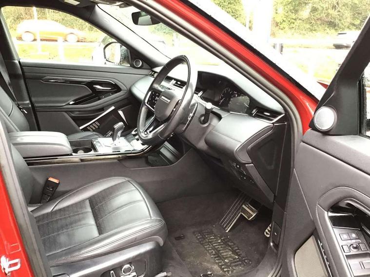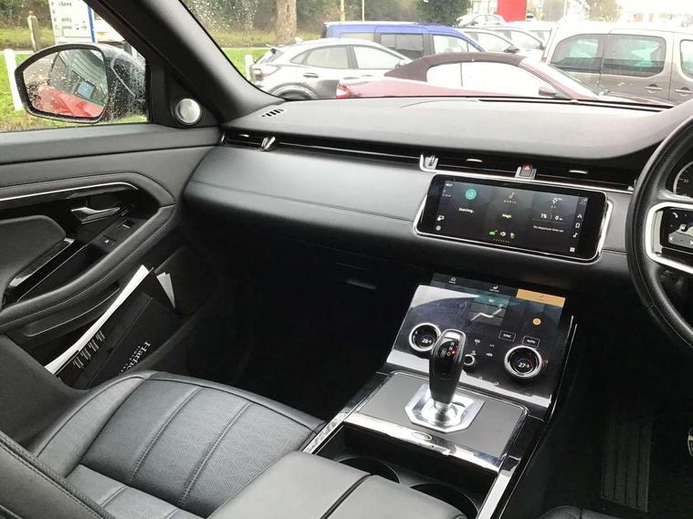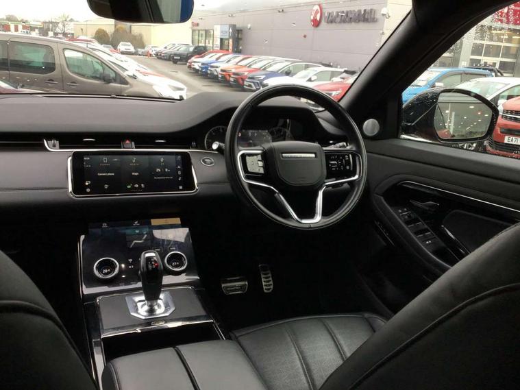 10" deployable touchscreen with lower touchscreen, Adaptive cruise control, Android Auto, Apple car play, Blind spot assist, Bluetooth connectivity, Brake pad wear indicator warning light, Driver condition monitor, eCall emergency system, Electronic power assisted steering (EPAS), Front and rear parking aid, InControl remote, Land Rover InControl apps, Lane keep assist, Pivi pro connected includes upgraded infotainment, connected navigation pro, Nuance speech licence, Push button starter, Rear collision monitor, Rear traffic monitor, Traffic sign recognition with adaptive speed limiter, Voice control system, 7 kW onboard charger, All terrain progress control, Configurable dynamics, Electric rear axle drive, Home charging cable, Large fuel tank, Passive suspension, Public charging cable, Terrain Response 2 Auto, Digital Audio Broadcast radio-DAB, Meridian surround sound system with 650W subwoofer and 14 speakers, Steering wheel mounted controls, Auto headlights, Automatic headlight levelling, Electric windows with one touch open/close and anti trap, Evoque and R-Dynamic badge, Flush deployable exterior door handles, Heated rear window with timer, Heated washer jets, Heated windscreen, P300e badge, Power fold, auto-dimming, heated door mirrors with approach lights and auto dimming driver side, Rain sensing windscreen wipers, Rear fog lights, Rear side wing doors, Rear wiper, Tailgate spoiler, Third brake light, 40:20:40 split folding rear seats with centre headrest and armrest, Ambient interior lighting, Bright metal pedals, Heated steering wheel, Isofix system on outer rear seats, Overhead lighting console, Overhead stowage for sunglasses, Passive front head restraints, Perforated full leather steering wheel, Rear air vents, Rear centre headrest, Rear head restraints, Satin chrome gearshift paddles, Single passenger seat, Sunvisors with illuminated vanity mirrors, Twin sliding front centre armrest, 3 rear 3 point seatbelts, Anti-lock braking system (ABS), Customer configurable autolock, DSC - Dynamic Stability Control, Electronic brake force distribution, Electronic parking brake, Electronic traction control, Emergency braking, Front and rear seatbelt reminder, Hill descent control, Hill launch assist, Low traction launch, Power operated child locks, Roll stability control, Six airbags - Driver and passenger airbags/driver knee airbag/front side airbag and curtain airbags, Torque vectoring brake, Tyre pressure monitoring system, Alarm, Immobiliser, Intrusion sensor, Keyless entry, Locking wheel nuts,
