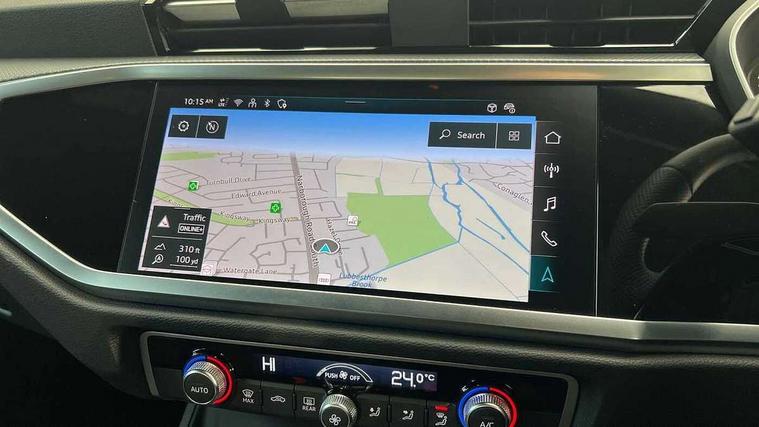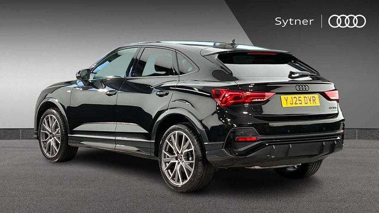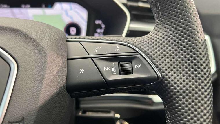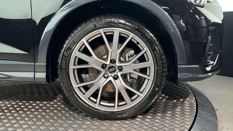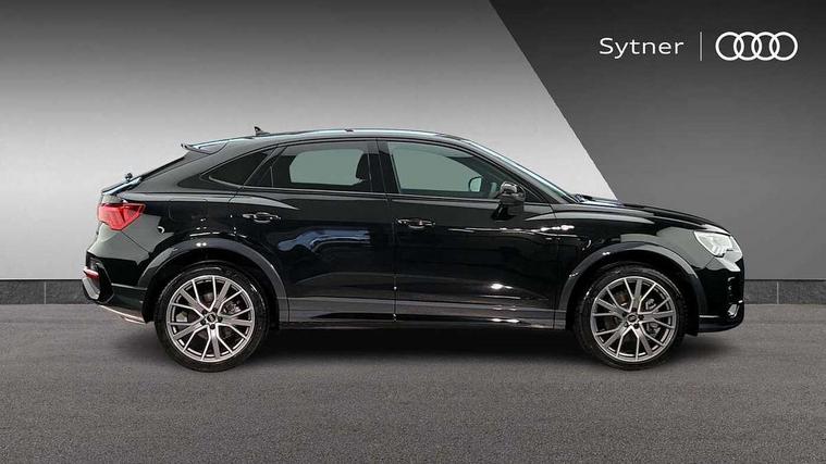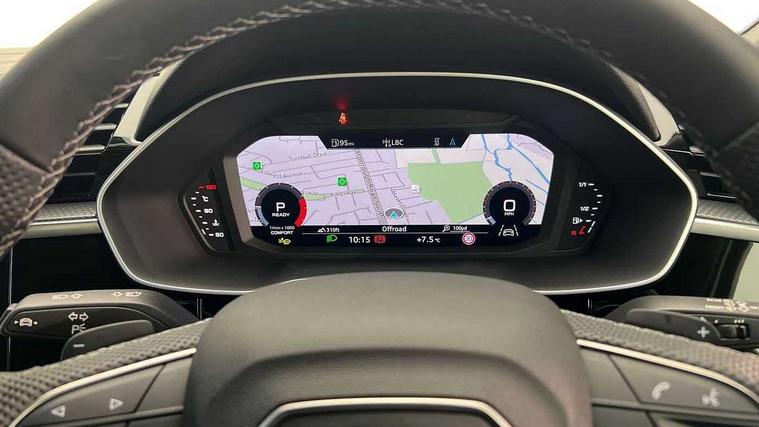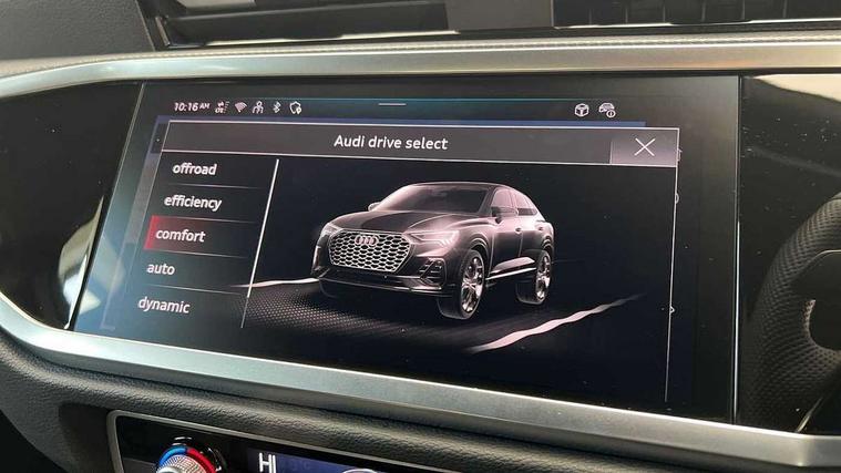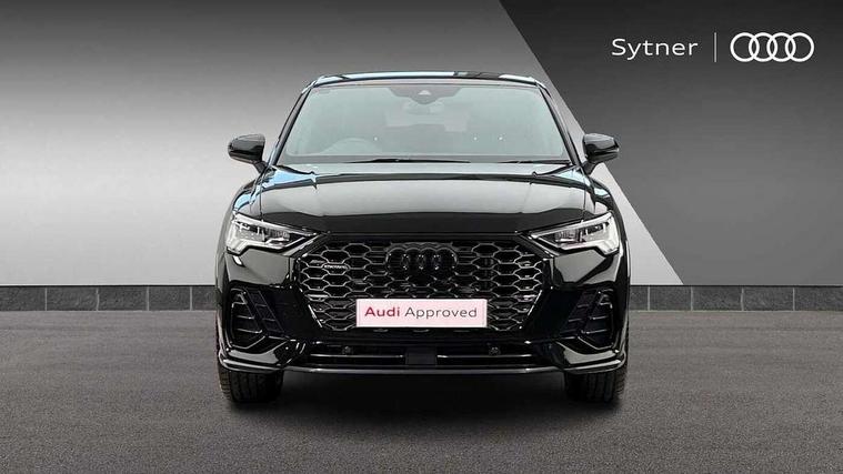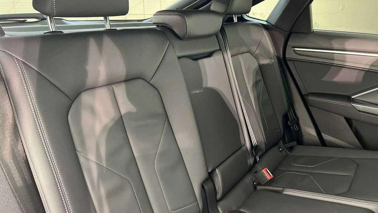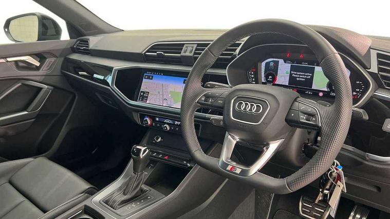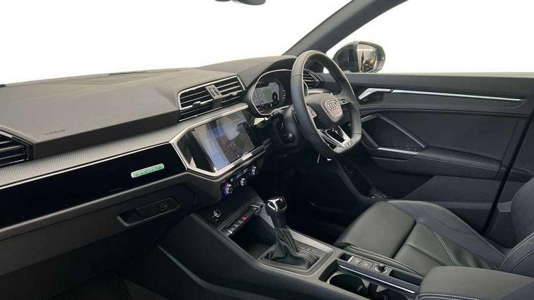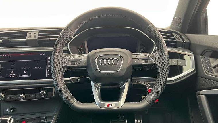 Audi connect safety and service, Audi drive select, Audi lane departure warning, Audi Virtual Cockpit - 10.25" display, Bluetooth interface, Camera based traffic sign recognition, Distraction and Fatigue warning, Legal emergency call, MMI Navigation Plus with high resolution 10.1 inch touchscreen colour display, Power operated tailgate, Progressive steering, Service interval indicator, Smartphone interface includes wireless Apple carplay/Android Auto, Start stop system with recuperation, Voice control system with natural language interaction, Sports suspension, 2 USB-C ports with charge and data functions, 6 passive loudspeakers, DAB digital radio module, Acoustic windscreen, Audi Beam uses LEDs to project the Audi logo onto the ground as you exit your Q3, Auto dimming door mirrors, Auto dimming frameless rear view mirror, Electrically folding, adjustable and heated door mirrors with integrated LED side indicators and kerb view function for passenger side, Front and rear electric windows, Front fog lights, Front underbody protection in manhattan grey paint finish, High gloss black finish B and C pillars, Honeycomb design radiator grille in matt anthracite black, LED Dynamic rear indicators, LED headlights with LED daytime running lights, LED rear lights, LED third brake light, Privacy glass dark tinted rear and rear-side windows (from B-pillar backwards), Rain and light sensors, Rear diffuser grille in grained matt black, Rear diffuser strip in matt anthracite black, Rear side wing doors, Rear underbody protection in matt black, Rear wiper, S line front and rear bumpers and side skirts in contrasting Manhattan grey paint finish, Variable front intermittent wipers, 12V socket in rear centre console, 3 seat bench in 2nd row, 40:20:40 folding with manual adjustment for 60:40 forwards/backwards position and backrest angle, Adjustable rear seat bench/backrest with centre armrest and cupholder, Black carpet mats, Black cloth headlining, Dual zone electronic climate control, Electric lumbar support, Front and rear black floor mats with contrast stitching in rock grey, Front and rear headrests, Front centre armrest, Height and reach adjustable steering wheel, Illuminated door sill trims with S logo, ISOFIX child seat mounting for front passenger with airbag deactivation and outer rear seat including top tether attachment point for outer rear seats, Luggage compartment sill protection in stainless steel, Manual front seats with height adjustment, Perforated leather gearknob, Single front passenger seat, Stainless steel pedals, Twin leather upholstery with front sport seats + S embossing, Black styling pack - Q3, Non smoking pack - Q3, 3x3 point rear seatbelts, 6 airbags - Driver, front passenger, curtain and side windows, Audi pre-sense front with pedestrain and cyclist recognition, Electrically operated child locks on rear doors, Electromechanical parking brake, Electronic stabilisation control including ABS, ASR and EDL, Front seatbelt reminder, Hill descent control, Hill hold assist, Pre sense basic, Seatbelt monitoring, Tyre pressure warning, Warning triangle and first aid kit, Anti theft wheel bolts, Immobiliser, Remote central locking, Thatcham approved category 1 anti theft alarm, Aluminium look interior elements, Detail dashboard around MMI touch colour display in glass look, black with surround in aluminium look, Leatherette door armrest, Piano black inlay,