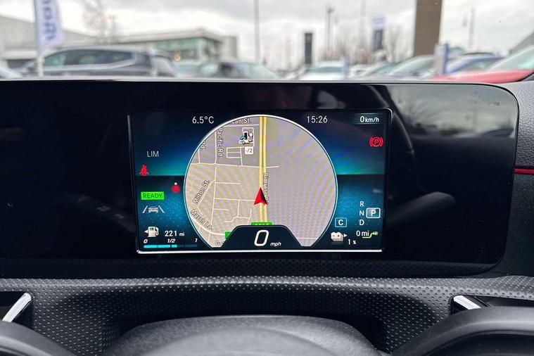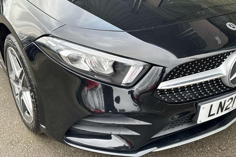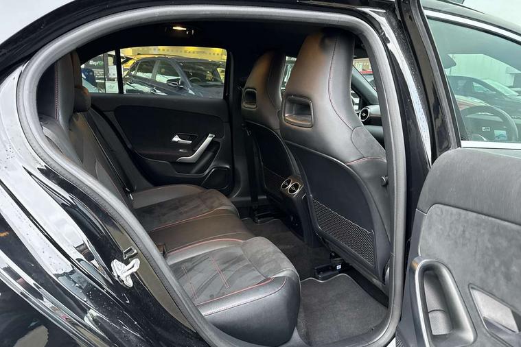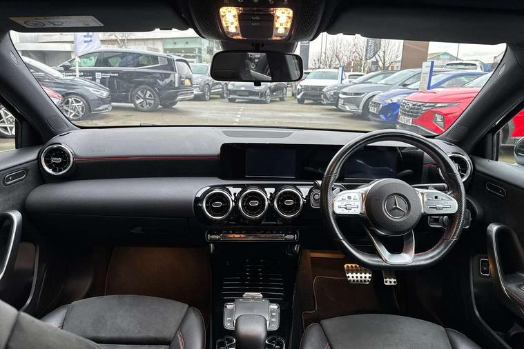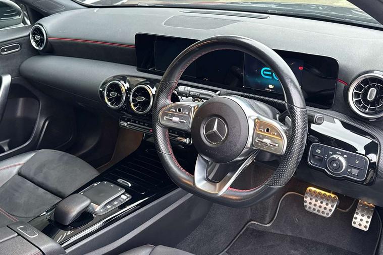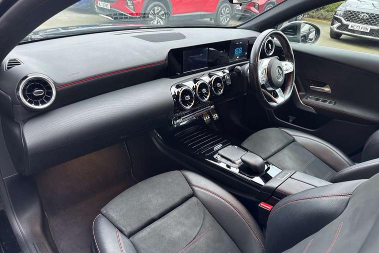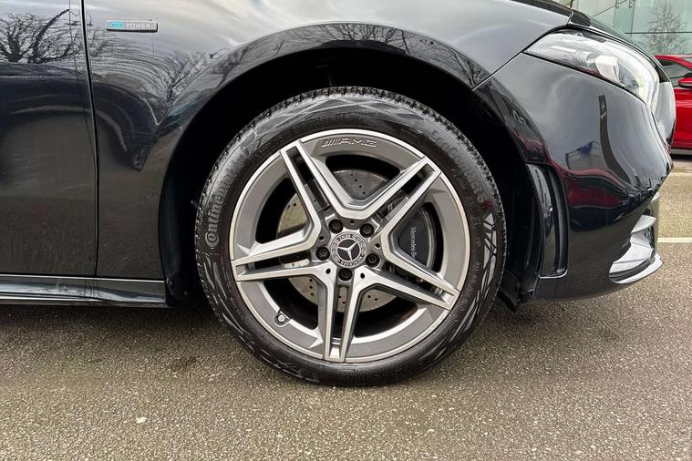 180 degree rear view camera with parking guidelines, 7" colour screen in instrument panel, 7" touchscreen media display, Acoustic ambient protection, Attention assist, Brake pad wear indicator warning light, Car wash mode, Cruise control + speed limiter, Direct steering, Dual bluetooth interfaces, DYNAMIC SELECT with a choice of driving modes (ECO, Comfort, Sport and Individual), ECO start/stop function, Fluid level warning indicator for fuel, oil, coolant and washer fluid, Hard-disk navigation, Hey Mercedes Voice activation, Lamp failure indicator, Mercedes me connect including emergency call system, accident recovery, breakdown and maintenance management, Mercedes me remote services, Outside temperature gauge, Owners manual in English, Pre-installation for private car sharing, Preinstallation for Mercedes Benz link, Remote and charging services plus, Service indicator (ASSYST), Speed sensitive power steering, Trip computer, 7.4 kW monophase on board charger, Comfort suspension, Mode 3 charging cable 11 kW, Rear axle multi-link, 2 USB ports (type C) in rear stowage compartment and one in front of center console, 6 speakers, DAB Digital radio, MBUX multimedia system with DAB digital radio and touchpad including satellite navigation, Mercedes-Benz sound system - 100W, 4 Electric Front and Rear windows, Adaptive brake lights, AMG bodystyling - Front apron with splitter in chrome, rear apron with chrome trim and chrome visible trim elements in tailpipe, Black weather strip, Body colour bumpers, Body colour door handles, Body colour side skirt, Body coloured door mirrors, Chrome beltline trim, Diamond radiator grille with chrome pins and silver louvre + chrome insert, Electric adjustable and heated door mirrors with integrated LED side indicators, EQ badging, Exhaust system - Twin visible tailpipes in polished stainless steel, Headlamp assist automatic headlamp activation, Heated glass rear windscreen + timer control, LED high performance headlamps with integrated LED daytime running lights, LED tail lamp, LED third brake light, Privacy glass, Radio aerial, Rain sensing windscreen wipers with two sensitivity settings, Rear fog lights, Rear wiper, Window line trim strip in chrome, 3 pin charging cable plug, 3 Spoke flat bottom leather multi function steering wheel with perforated leather in grip area, 40:20:40 split folding rear seats, Artico man-made leather/Microfibre Dinamica upholstery with red contrast stitching, Auto Mercedes-Benz child seat recognition sensor, Black air vents with surround in silver chrome, Black roof lining, Brushed stainless steel sports pedals with rubber studs, Charging socket, Controller on centre console with chrome surround, Floor mats with stitched edging and AMG lettering, Front centre armrest with storage compartment, Front door sills with Mercedes Benz lettering, Front seat backs luggage nets, Front seat cushion length adjustment, Galvanished gear shift paddles on steering wheel, Heated front seats, Height/reach adjustable steering column, Interior mirror with reading lamps in black and frameless, Manual height adjustable front seats, Pre-entry climate control, Rear head restraints, Seat occupancy sensor for front passenger seat, Sports seats with integrated headrests, Stowage compartment in centre console with retractable cover, Sunvisors with illuminated vanity mirrors, Touchpad on center console, Twin front cupholders, Two zone thermotronic luxury automatic climate control, Light and sight pack - A Class, Seat comfort pack - A Class, 3 rear 3 point seatbelts, ABS with Brake Assist, Active bonnet, Active brake assist includes forward collision warning system with autonomous braking, Adaptive brake assist with hold function and hill start assist, Black seatbelts, Childproof locks manually operated for rear doors and electrically operated for rear power windows, Crash responsive emergency lighting, Driver and passenger head and side airbags, Drivers knee airbag, Dual stage driver/passenger airbags, Electronic parking brake, ESP curve dynamic assist, ESP with ASR, Front and rear seatbelt reminder, Front brake callipers with Mercedes Benz lettering, ISOFIX and top tether child seat fixing points in two outer rear seats, Perforated front brake discs, Radar based regeneration, Tyre pressure monitoring system, Warning triangle and first aid kit, Window airbags, Alarm system/interior protection/immobiliser, Keyless Go, Remote central locking and crash sensor with emergency opening function, Urban guard vehicle protection system with immobiliser and interior protection, Dinamica microfibre trim in black, 18" AMG 5 twin spoke light alloy wheels in titanium grey with highsheen finish, Summer tyres, Tirefit sealant kit,