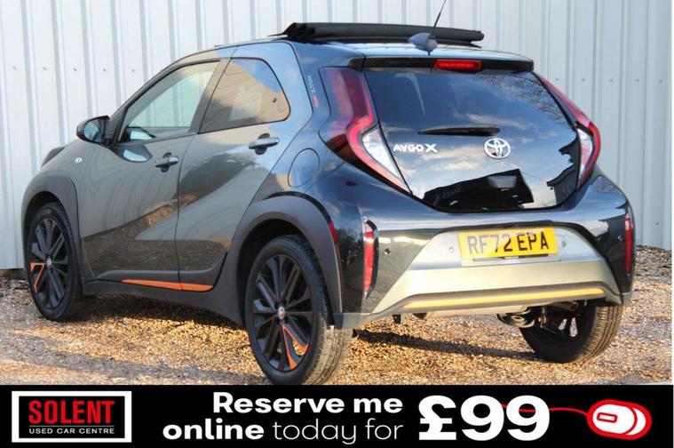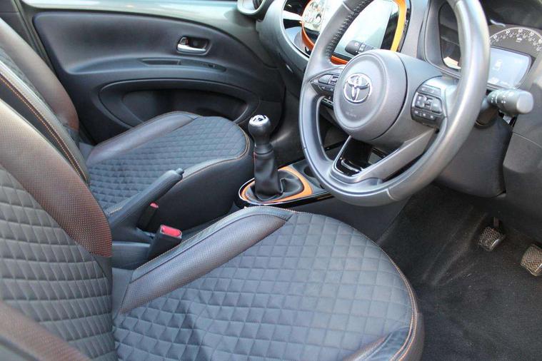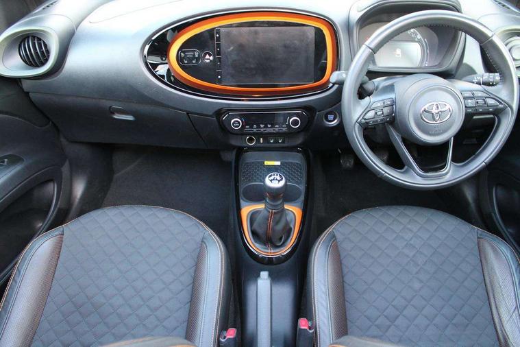 4.2" TFT colour screen, Adjustable speed limiter, Analogue speedometer, Bluetooth connectivity, Digital tachograph, Driver attention alert system, eCall emergency call system, Electric power steering, Front and rear parking sensors with auto brake, Intersection turn assist, Key reminder warning, Noise reduction kit, Pre collision system with emergency steering assist, Remote boot door release on key, Reversing camera with static guide lines, Smart entry and push button start, Speed limit display, Start and stop, Wireless charger, Wireless Smartphone Integration includes Apple CarPlay and Android auto, Vehicle Stability Control (VSC), 4 speakers, 9" HD multimedia display touch screen with Toyota smart connect, DAB digital audio broadcast, USB connector, Auto headlights, Auto wipers, Automatic headlights cut-off, Automatic high beam On/Off switch, Bicycle towing hook, Black fog light surrounds, Black side protection mouldings, Black wheel arch mouldings, Body colour door handles, Body coloured front bumper, Boot door scuff plate, Canvas roof, Eclipse black rear bumper, Electric heated door mirrors, Follow me home headlights, Front fog lights, Front power windows, Gloss black door mirrors, Gloss black upper front grille, Headlight cut-off reminder, LED daytime running lights guide, LED front light guide, LED High mounted stop lamp, LED projector headlights, Limited edition logo on C pillar, Magnolia strip on lower front and rear bumpers, Manual day/night rear view mirror, Manual headlight levelling, Metallic Bi-tone paint, Power adjustable door mirrors, Privacy glass, Rain sensor, Rear combination lights LED bulb type, Rear side wing doors, Rear windscreen defogger, Rear windscreen wiper, Remote hazard lights system, Short antenna, Variable intermittent windscreen wipers, 12v power outlet - front, 2 seat bench in 2nd row, 3 spoke leather steering wheel, 50/50 split folding rear seat, Adjustable speed limiter switch on steering wheel, Audio and telephone switches on steering wheel, Auto air conditioning, Black insert on steering wheel, Black roof lining, Boot light, Canvas top headlining, Centre room light, Chrome interior door handles, Chrome surround on air conditioning buttons, Clean air filter, Driver and front passenger heated seats, Floor mats, Front and rear cup holders, Front head rest deco art, Front head restraints, Height adjustable driver seat, Intelligent adaptive cruise control switch on steering wheel, ISOFIX child restraint system on rear seats, Lane departure alert switch on steering wheel, Leather gearshift knob, Light blue ambient lighting in centre console, Manual tilt steering wheel, Manually reclining and sliding driver seat, Manually reclining and sliding front passenger seat, Multimedia switches on steering wheel, Partial leather seats, Pollen filter, Rear door pockets, Rear head restraints, Satin silver insert on gear shift knob, Single compartment glovebox with lights, Single front passenger seat, Soft tonneau cover, Sun visors with mirror on driver and passenger side, Voice recognition switch on steering wheel, Toyota safety sense pack - Aygo X, Anti lock braking system + Electronic brake force distribution, Child safety door lock, Emergency brake light signal (EBS), Hill start assist control (HAC), Passenger airbag on/off switch, Seat belt reminder for front and rear seats, Supplement restraints system (SRS) - 6 airbags, Traction control, Tyre pressure warning system, Immobiliser, Remote power door locks, Black wheel centre caps, Mandarina Orange wheel insert, Tyre repair kit,