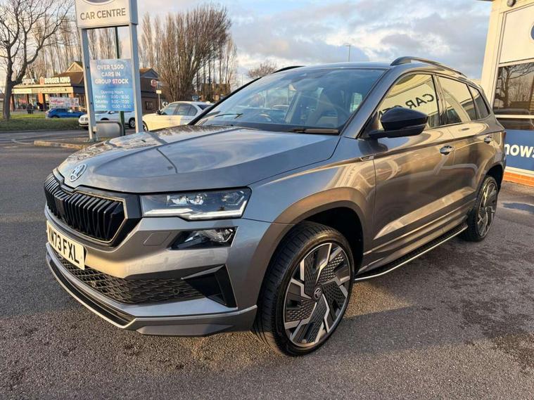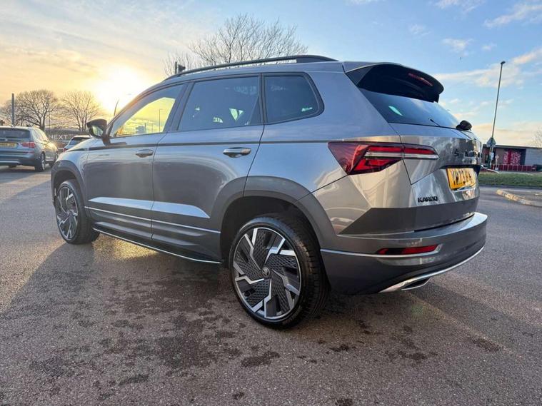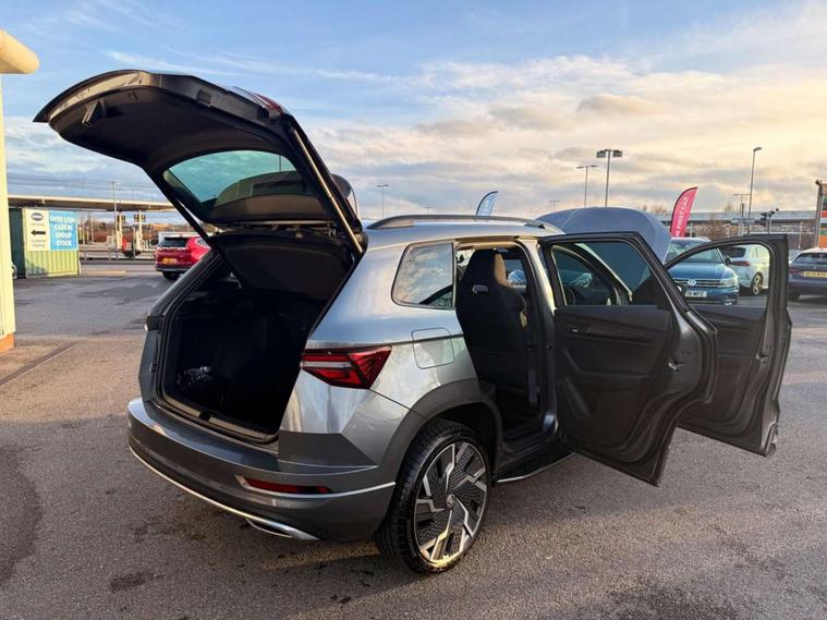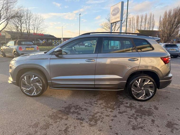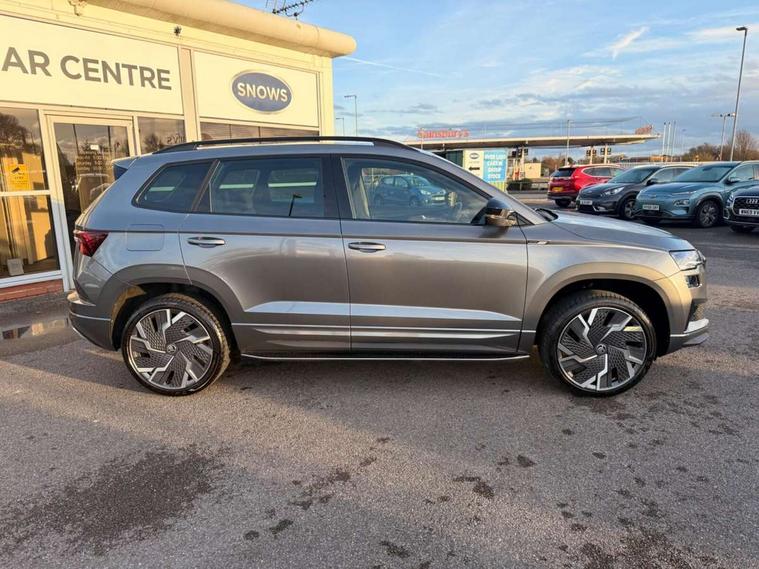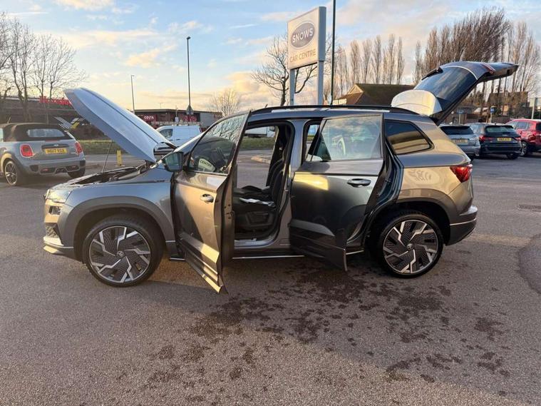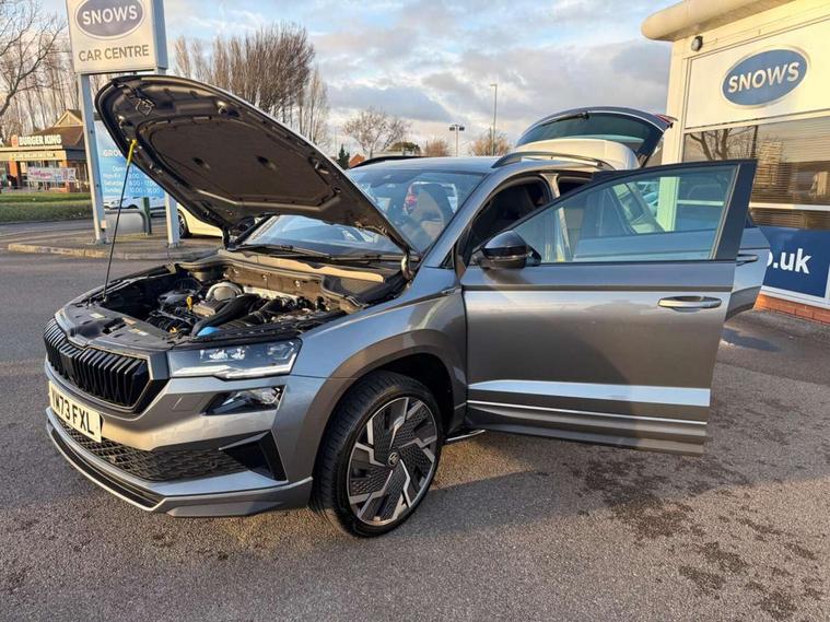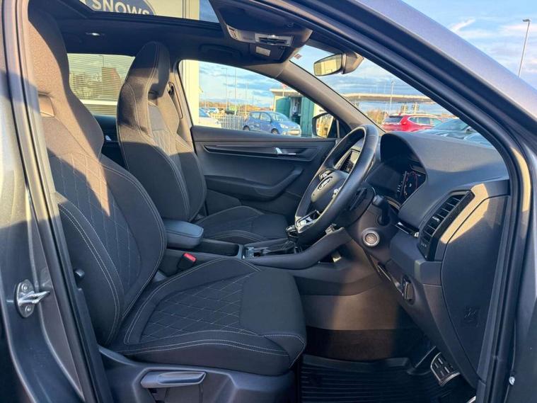 8" Digital display, Care connect, Driver fatigue sensor, Emergency services call system, Outside temperature gauge, Service interval indicator, SmartLink wireless for Apple and wired for Android, Start/stop system with regenerative braking, USB C Port x 2 in front centre console, Virtual cockpit, Virtual pedal with electrically operated boot door, 8 Speakers, DAB radio with Bluetooth, USB connection, Wireless charging without wireless aerial connection, Acoustic glass, Aero front windscreen wipers with intermittent function, Auto dimming rear view mirror with light and rain sensors, Black door mirrors, Black electric window control buttons, Black radiator grille, Black roof rails, Body colour door handles, Electric front and rear windows with child proof lock, Front door steps with SportLine logo, Heated rear windscreen, LED daytime running lights, LED rear lights with high functionality welcome effect and dynamic indicators, Light assistant (coming/leaving home/tunnel light), Panoramic sliding sunroof, Plastic scuff plates, Privacy glass, Protective door side sills in body colour, Rear diffuser, Rear side wing doors, Rear spoiler, Rear window wiper with washer system and intermittent control, Safety reflectors on front doors, Skoda lettering on tailgate in black, Sportline badge on front fender, Sportline decorative inserts with badging, Sports front and rear bumpers, 1.5 litre bottle holders in driver and front passenger door panels, 12V socket in boot, 12v socket in front centre armrest with storage compartment and rear air vents, 3 rear height adjustable headrests, 3 seat bench in 2nd row, 3 spoke leather sports multifunction steering wheel and silver stitching with gear shift paddles, 4 foldable roof handles with rear coat hooks, Black floor carpet, Black roof headlining, Chrome inner door handles, Double sided boot floor, Foldable hooks in the boot, Front head restraints, Height adjustable front three point seats belts with tensioners, Height/reach adjust steering wheel, Ice scraper, Illuminated glovebox, Illuminated luggage compartment, Isofix child seat preparation outer rear, Manual lumbar support for front seats, Pen holder, Pollen filter, Rear boot cover, Rear reading lights, Rear seats fixed folding and divided 60:40, Rubbish bin door, Safety vest holder, Single front passenger seat, Storage box in upper central dashboard closed, Sunvisors with illuminated vanity mirrors, Textile floor mats, Ticket holder, Titan black interior ceiling, Welcome animation with sportline logo, Boot pack - Karoq, Light Pack - Karoq, Parking pack - Karoq, Automatic door unlocking in case of crash, Automatic fuel cut off in case of crash, Child locks on rear doors, Driver airbag, Electronic parking brake with auto hold function, Emergency rear braking signal, ESC including ABS, MSR, ASR, EDS, HBA, DSR, RBS, MKB and traction control, Front side airbags, Hill hold control, Knee airbags, Passenger airbag with switch-off function, Pedestrian monitor, Seatbelt reminder signalisation and pretensioner for all seats, Three point seatbelts rear, Two tone horn, Tyre pressure display, Tyre pressure monitor, Alarm with interior monitoring, back up horn and tilt sensor with safe function, Electronic engine immobiliser, Keyless entry and start/stop, Remote central locking with 2 remote folding keys, Black air vent surround, Black centre console, Satin black dashboard, Satin black door trim, 19" Sagitarius anthracite alloy wheels with matt black aero inserts, Anti-theft wheel bolts protection, Matt black aero hub caps, Tool kit,