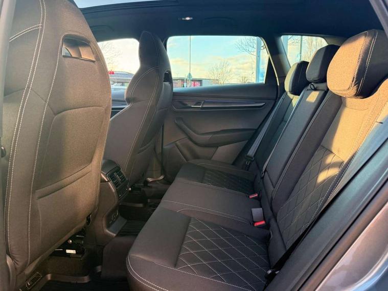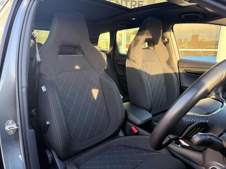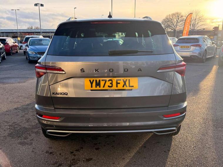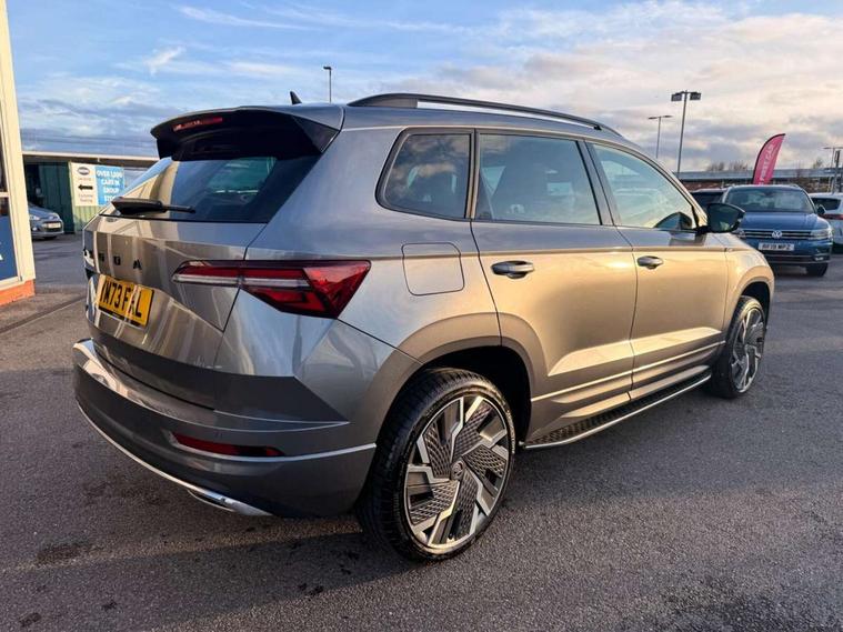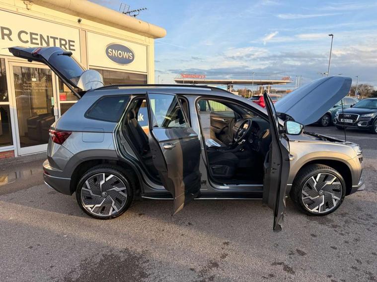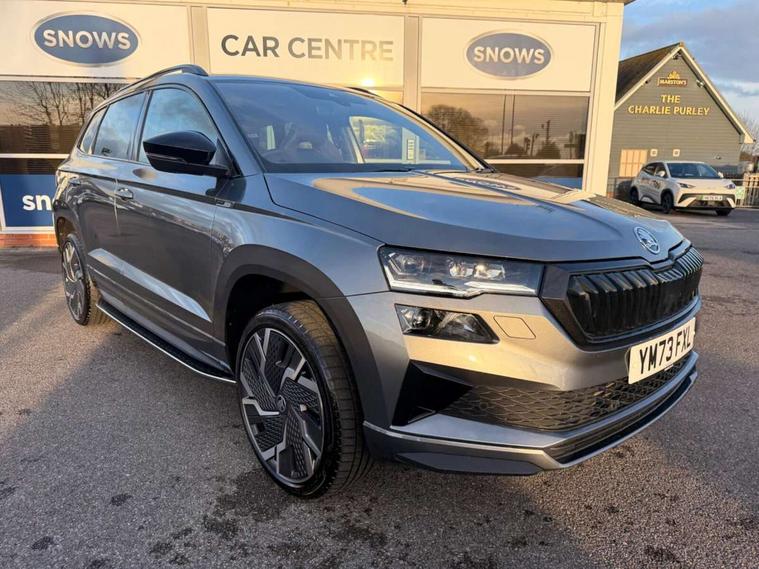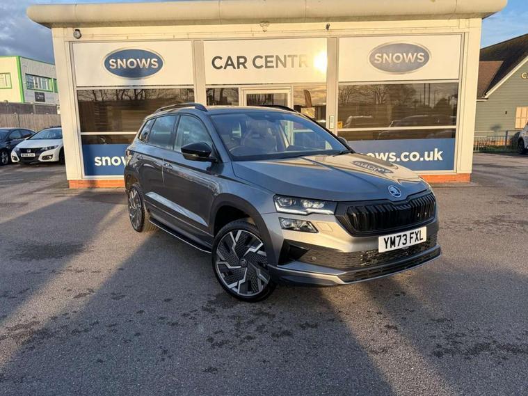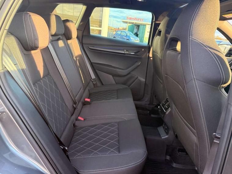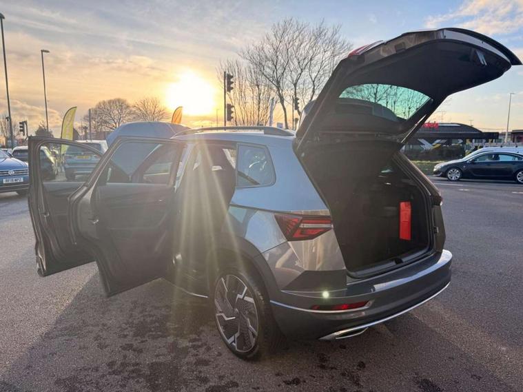 8" Digital display, Care connect, Driver fatigue sensor, Emergency services call system, Outside temperature gauge, Service interval indicator, SmartLink wireless for Apple and wired for Android, Start/stop system with regenerative braking, USB C Port x 2 in front centre console, Virtual cockpit, Virtual pedal with electrically operated boot door, 8 Speakers, DAB radio with Bluetooth, USB connection, Wireless charging without wireless aerial connection, Acoustic glass, Aero front windscreen wipers with intermittent function, Auto dimming rear view mirror with light and rain sensors, Black door mirrors, Black electric window control buttons, Black radiator grille, Black roof rails, Body colour door handles, Electric front and rear windows with child proof lock, Front door steps with SportLine logo, Heated rear windscreen, LED daytime running lights, LED rear lights with high functionality welcome effect and dynamic indicators, Light assistant (coming/leaving home/tunnel light), Panoramic sliding sunroof, Plastic scuff plates, Privacy glass, Protective door side sills in body colour, Rear diffuser, Rear side wing doors, Rear spoiler, Rear window wiper with washer system and intermittent control, Safety reflectors on front doors, Skoda lettering on tailgate in black, Sportline badge on front fender, Sportline decorative inserts with badging, Sports front and rear bumpers, 1.5 litre bottle holders in driver and front passenger door panels, 12V socket in boot, 12v socket in front centre armrest with storage compartment and rear air vents, 3 rear height adjustable headrests, 3 seat bench in 2nd row, 3 spoke leather sports multifunction steering wheel and silver stitching with gear shift paddles, 4 foldable roof handles with rear coat hooks, Black floor carpet, Black roof headlining, Chrome inner door handles, Double sided boot floor, Foldable hooks in the boot, Front head restraints, Height adjustable front three point seats belts with tensioners, Height/reach adjust steering wheel, Ice scraper, Illuminated glovebox, Illuminated luggage compartment, Isofix child seat preparation outer rear, Manual lumbar support for front seats, Pen holder, Pollen filter, Rear boot cover, Rear reading lights, Rear seats fixed folding and divided 60:40, Rubbish bin door, Safety vest holder, Single front passenger seat, Storage box in upper central dashboard closed, Sunvisors with illuminated vanity mirrors, Textile floor mats, Ticket holder, Titan black interior ceiling, Welcome animation with sportline logo, Boot pack - Karoq, Light Pack - Karoq, Parking pack - Karoq, Automatic door unlocking in case of crash, Automatic fuel cut off in case of crash, Child locks on rear doors, Driver airbag, Electronic parking brake with auto hold function, Emergency rear braking signal, ESC including ABS, MSR, ASR, EDS, HBA, DSR, RBS, MKB and traction control, Front side airbags, Hill hold control, Knee airbags, Passenger airbag with switch-off function, Pedestrian monitor, Seatbelt reminder signalisation and pretensioner for all seats, Three point seatbelts rear, Two tone horn, Tyre pressure display, Tyre pressure monitor, Alarm with interior monitoring, back up horn and tilt sensor with safe function, Electronic engine immobiliser, Keyless entry and start/stop, Remote central locking with 2 remote folding keys, Black air vent surround, Black centre console, Satin black dashboard, Satin black door trim, 19" Sagitarius anthracite alloy wheels with matt black aero inserts, Anti-theft wheel bolts protection, Matt black aero hub caps, Tool kit,